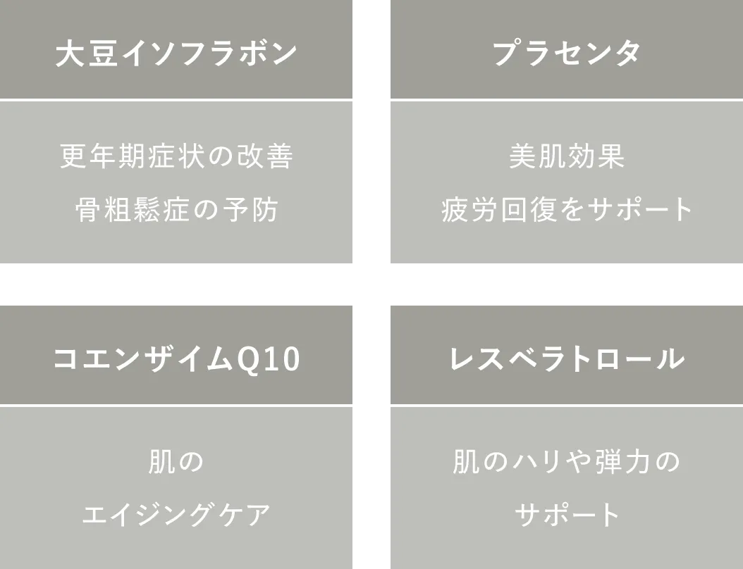 In addition to soy isoflavones, which act similarly to the female hormone estrogen, which is said to be closely related to menopausal symptoms in women, it also contains placenta and coenzyme Q10, which are expected to have skin-beautifying effects, and resveratrol, which is effective in preventing rough skin, to treat female hormone imbalances. It supports the creation of healthy feminine charm as well as the health of the mind and body.