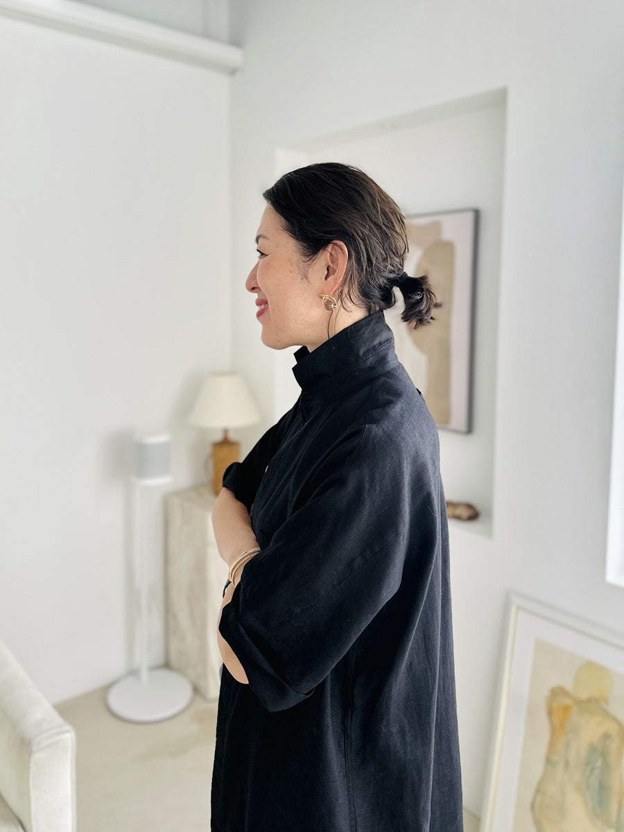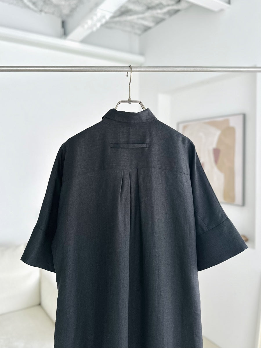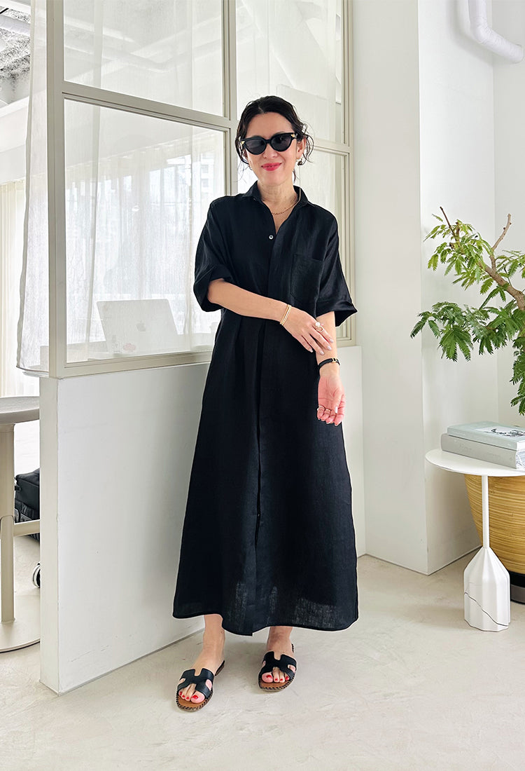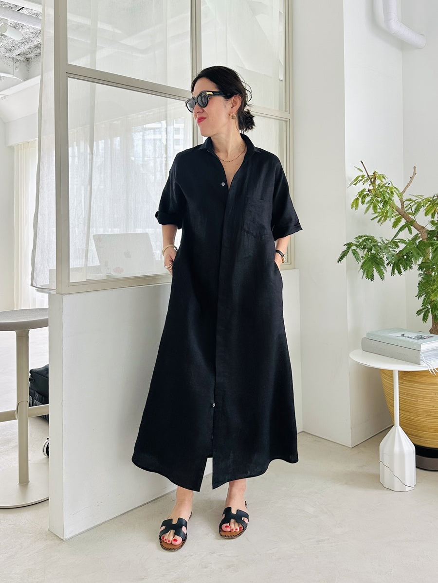 シャツやコートなどさまざまな名品があるなか、今回はこれからの季節に着たい、半袖のシャツワンピースをセレクト。AMARC別注として、素材をリネンに変更しました。緻密に計算されたパターンと贅沢なドレープが、身体のラインをきれいに見せてくれる珠玉の一枚。