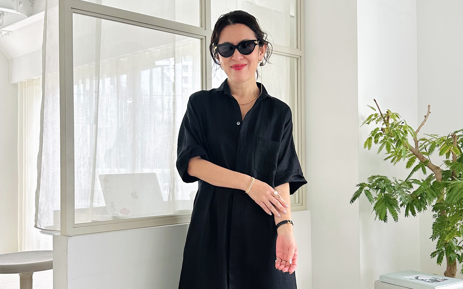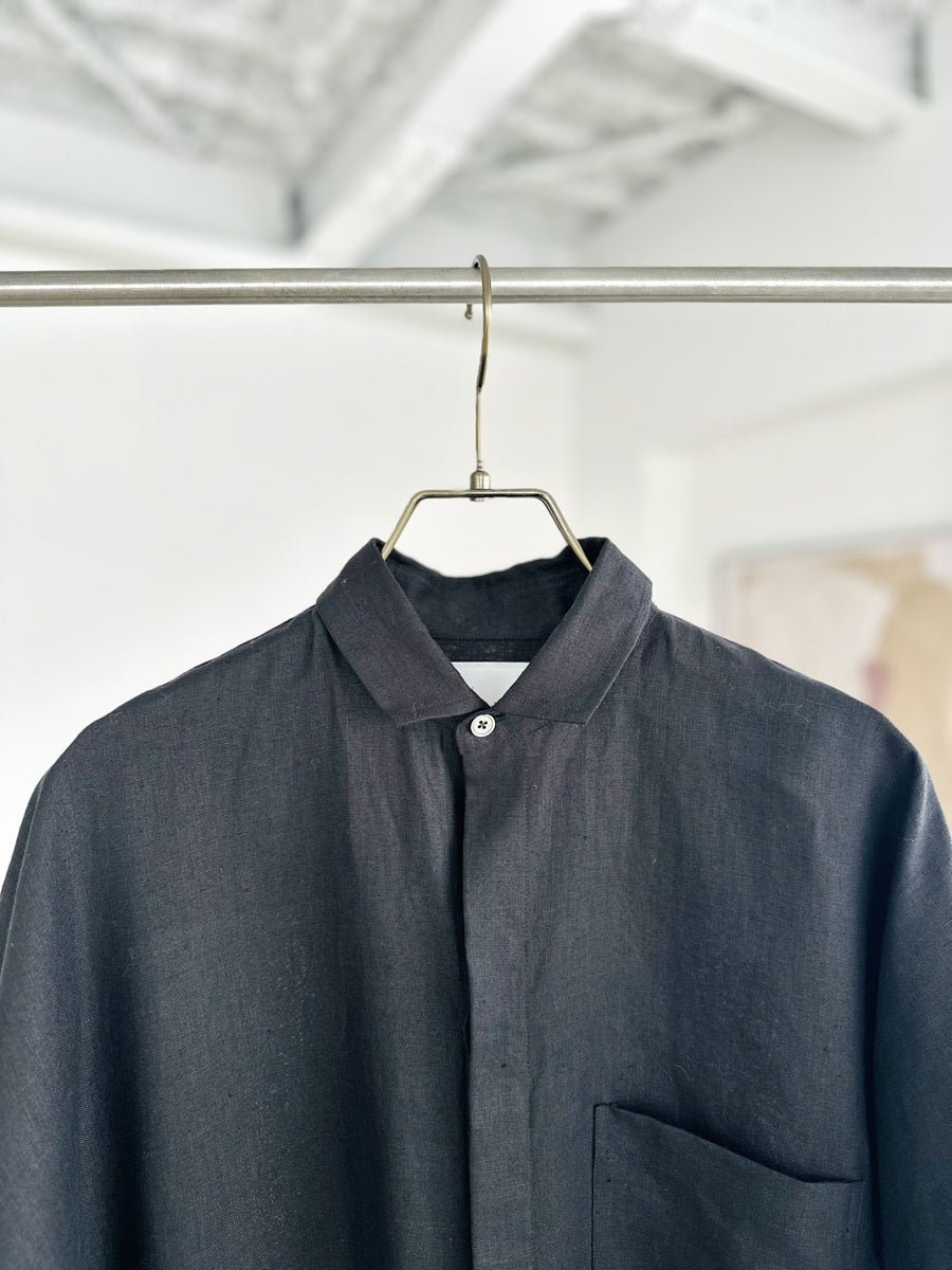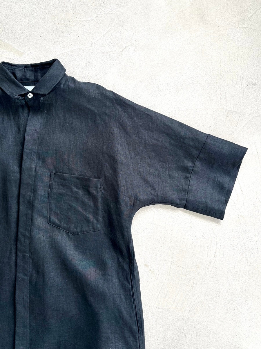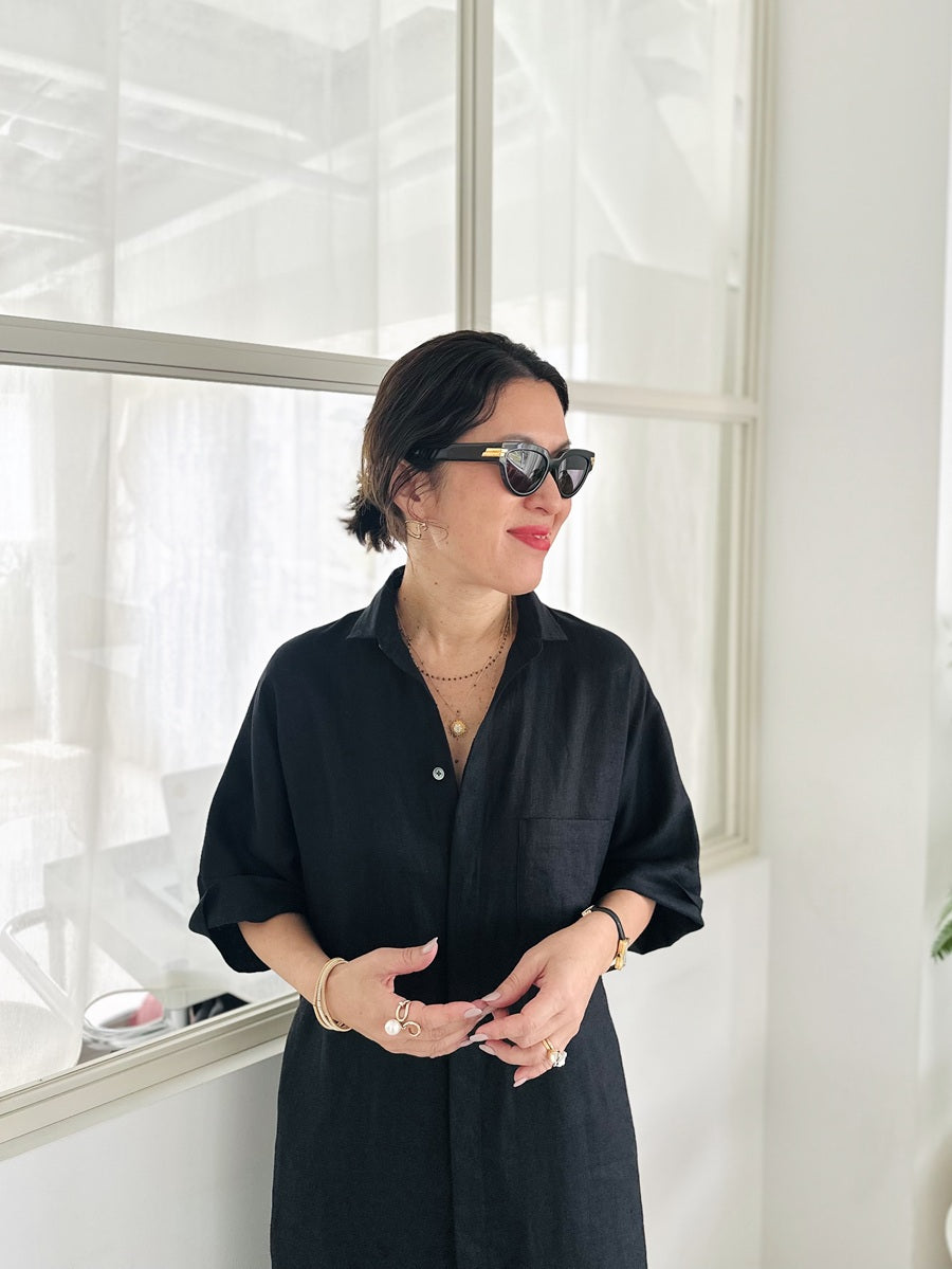 シャツやコートなどさまざまな名品があるなか、今回はこれからの季節に着たい、半袖のシャツワンピースをセレクト。AMARC別注として、素材をリネンに変更しました。緻密に計算されたパターンと贅沢なドレープが、身体のラインをきれいに見せてくれる珠玉の一枚。