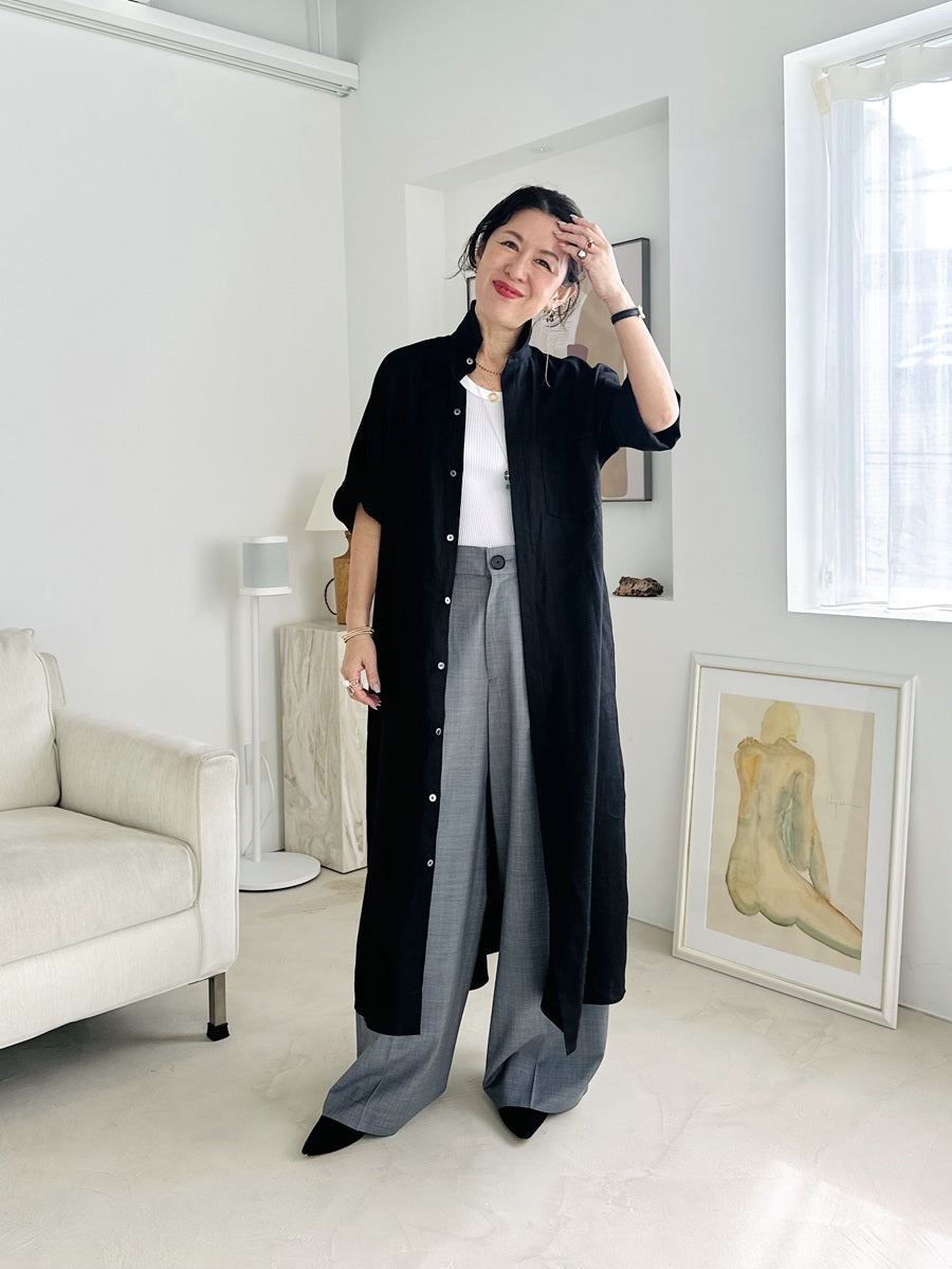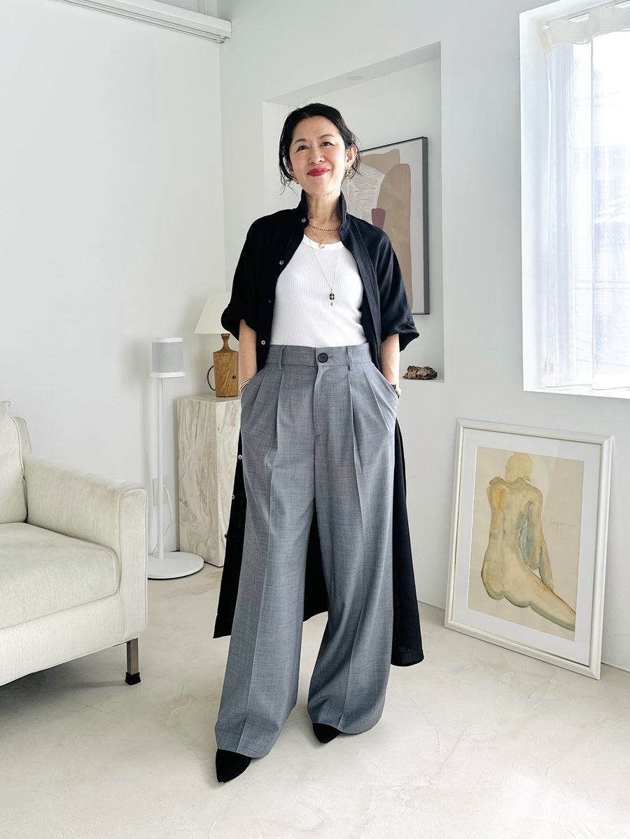 1枚でクリーンに着こなすのはもちろん、パンツをレイヤードしてモードにまとめるのもおすすめ。大きくつくられたカフスは、伸ばしてシックに着用するも良し。折り返して軽やかに仕上げるのも良し。目指すムードや気分によって表情を変えることができます。
