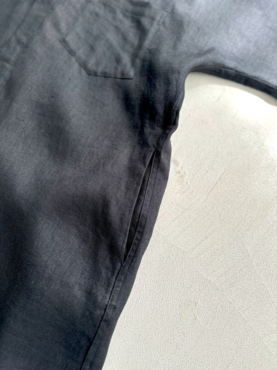 AMARC別注として、素材をリネン100%に変更。フランス、ノルマンディーで作られた上質な原料を使用しているから、肌なじみが良く、なめらかな質感。リネンは天然の高機能繊維ともいわれており、通気性があるほか、吸湿性や速乾性にも優れているため、湿度の高い梅雨時期や、暑い夏も快適に着られます。家庭での洗濯が可能で、気負わず手に取れるのも嬉しい点。柔らかな生地感は着込むほどに体にフィットするので、艶やかで上質な表情とともにリネンならではのエイジングもお楽しみください。