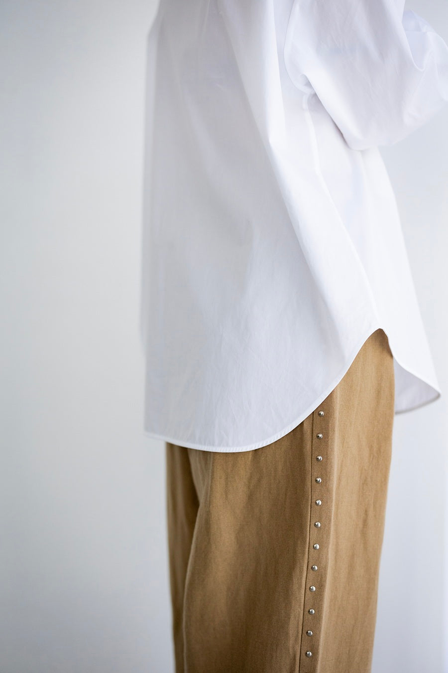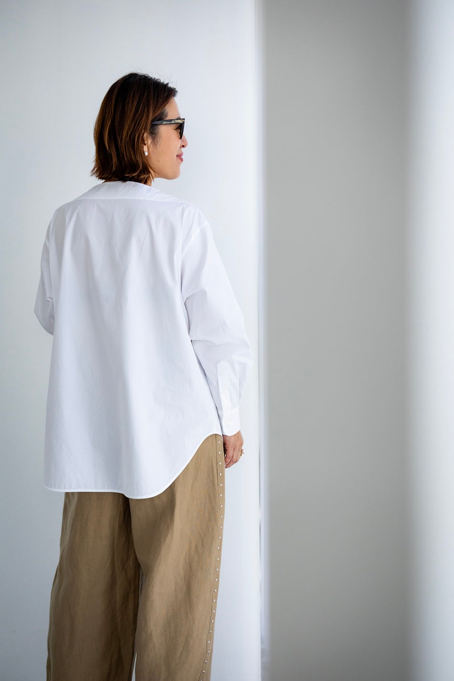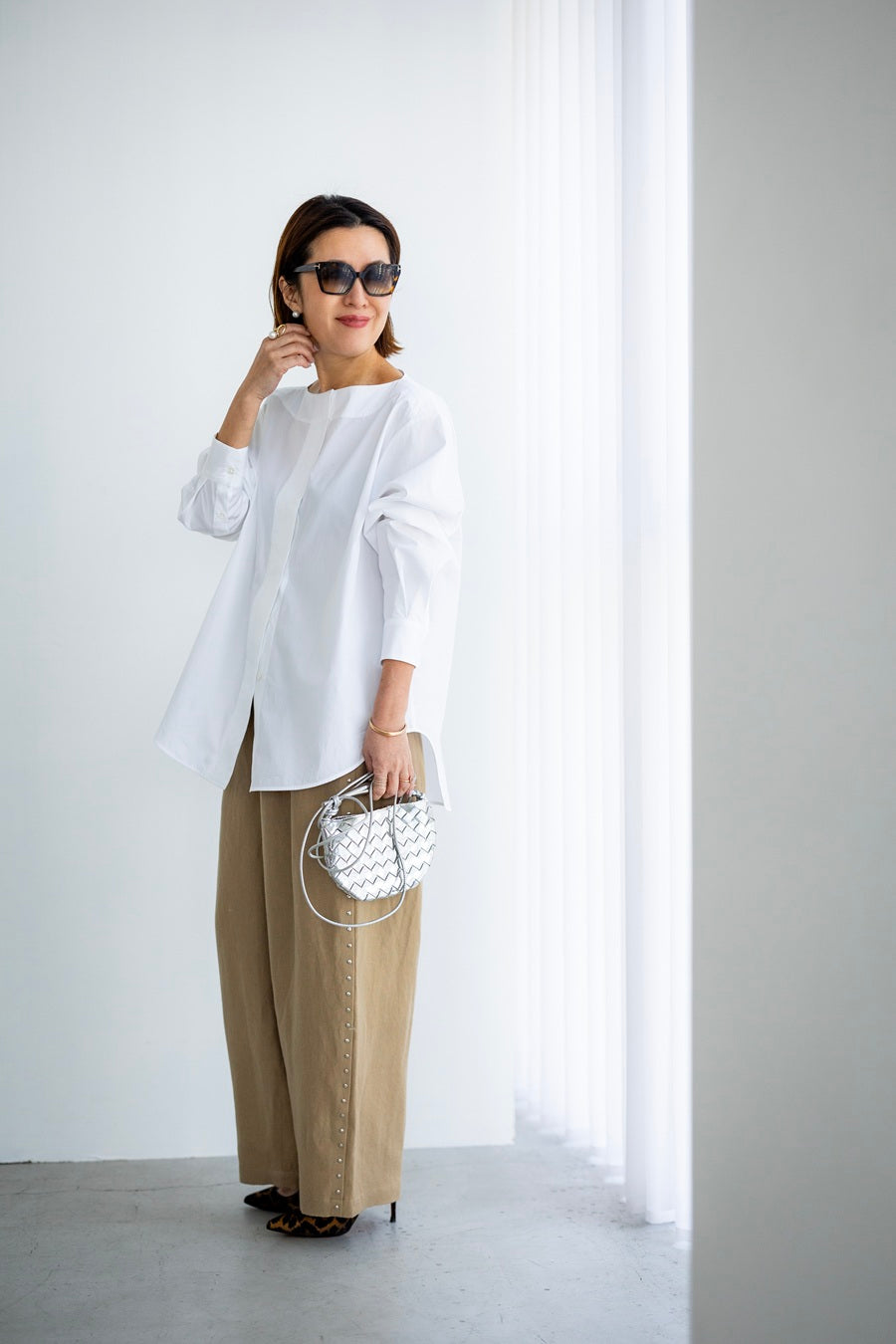清潔感あふれる白のニュアンスを主役にすれば、ゆったりとしたアウトスタイルも、キュッとコンパクトなインスタイルも思いのまま。シンプルな着こなしであればあるほど、このブラウスに込められた上質な意図を、肌で体感できるはずです。