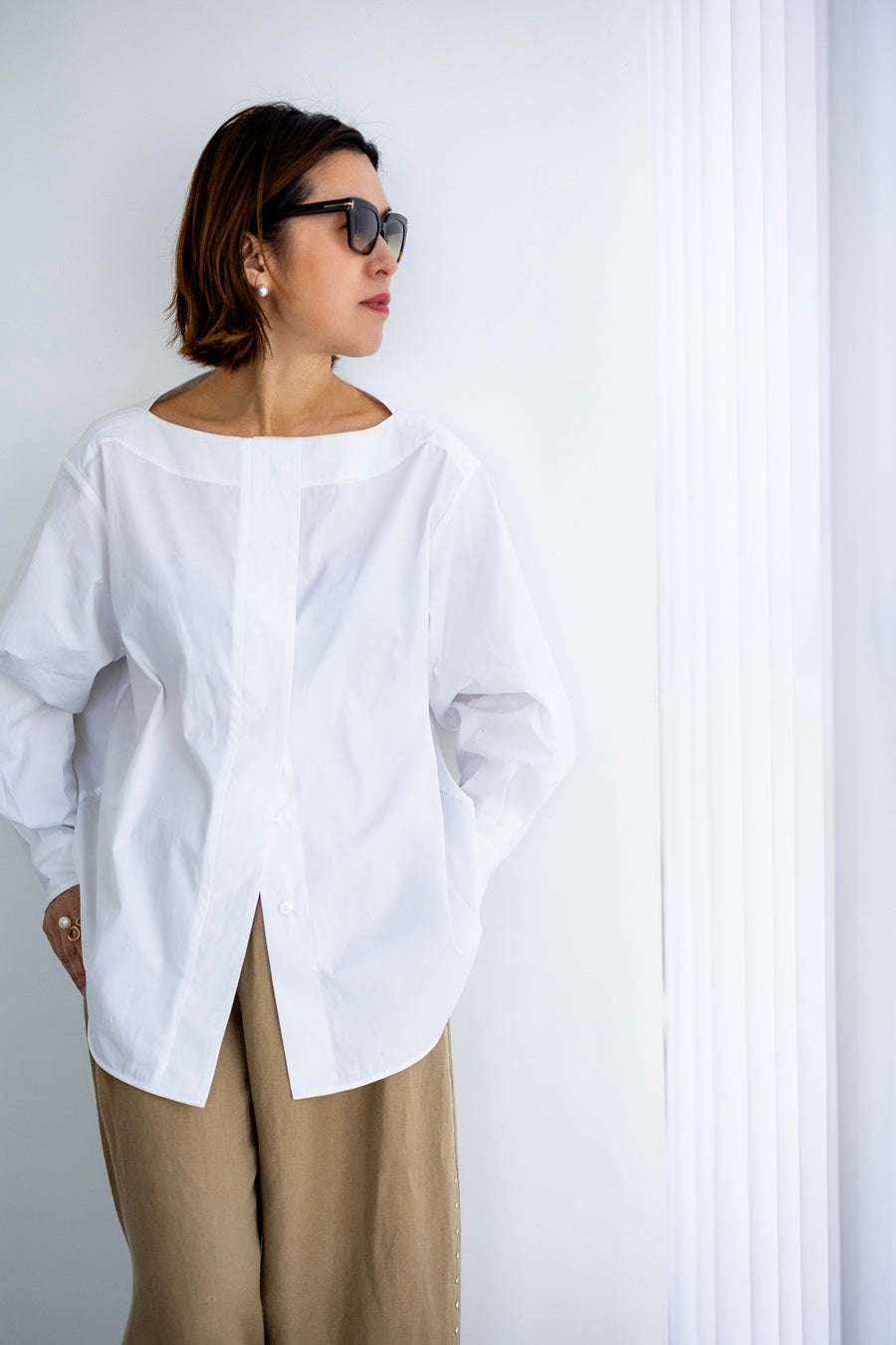 無駄を削ぎ落とした潔いフォルムに、繊細なコットンの凛とした表情が宿る一枚。ゆったりとしたシルエットをベースにしながら、計算されたハリのある素材感がシャープな直線を生み出し、大人の女性にふさわしいエレガントさを際立たせます。首から肩のラインを美しく見せるボートネックや、アクセサリーの輝きを邪魔しない比翼仕立てのフロントなど、細部まで行き届いたミニマルなあしらいが知的なムードを演出してくれます。