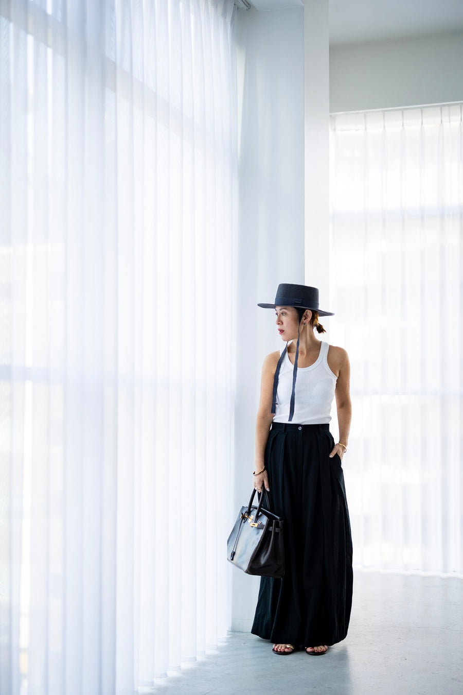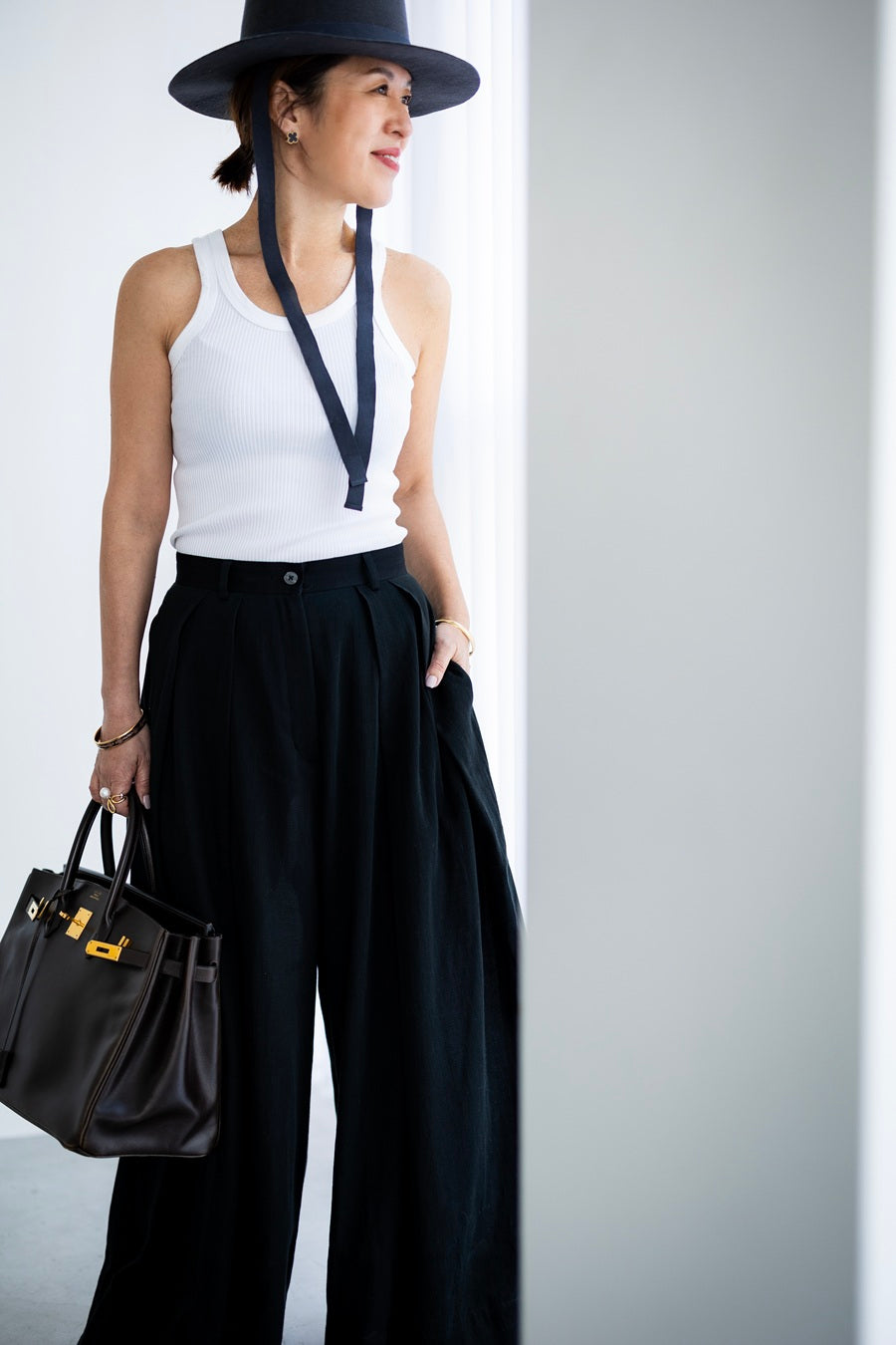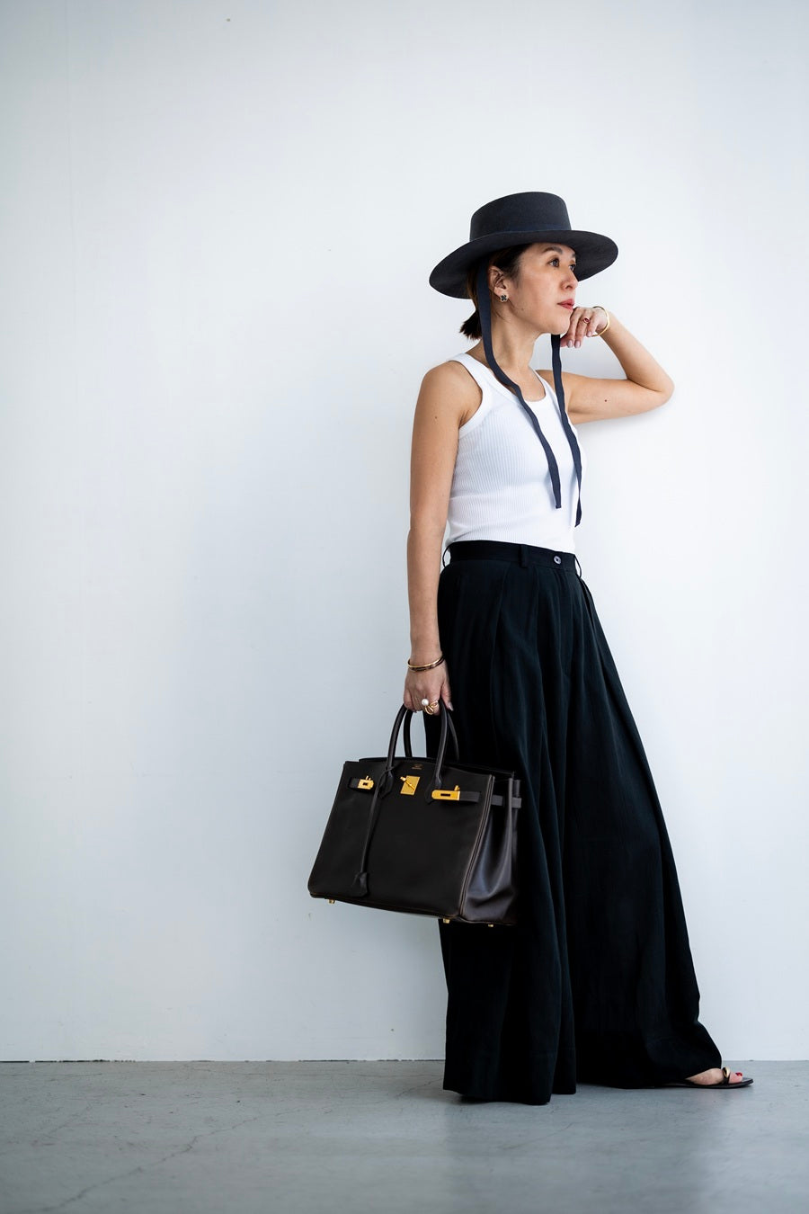 今回は、潔くシンプルなタンクトップ一枚で合わせるエレガントな着こなしを。余計な飾りを削ぎ落とし、アクセントは帽子のみ、仕上げに硬さのあるバッグで全体をシャープに引き締める。そんな引き算が叶うのも、ドラマティックなパンツがあればこそ。大人の日常をより豊かに、華やかに魅せてくれるワイドパンツです。