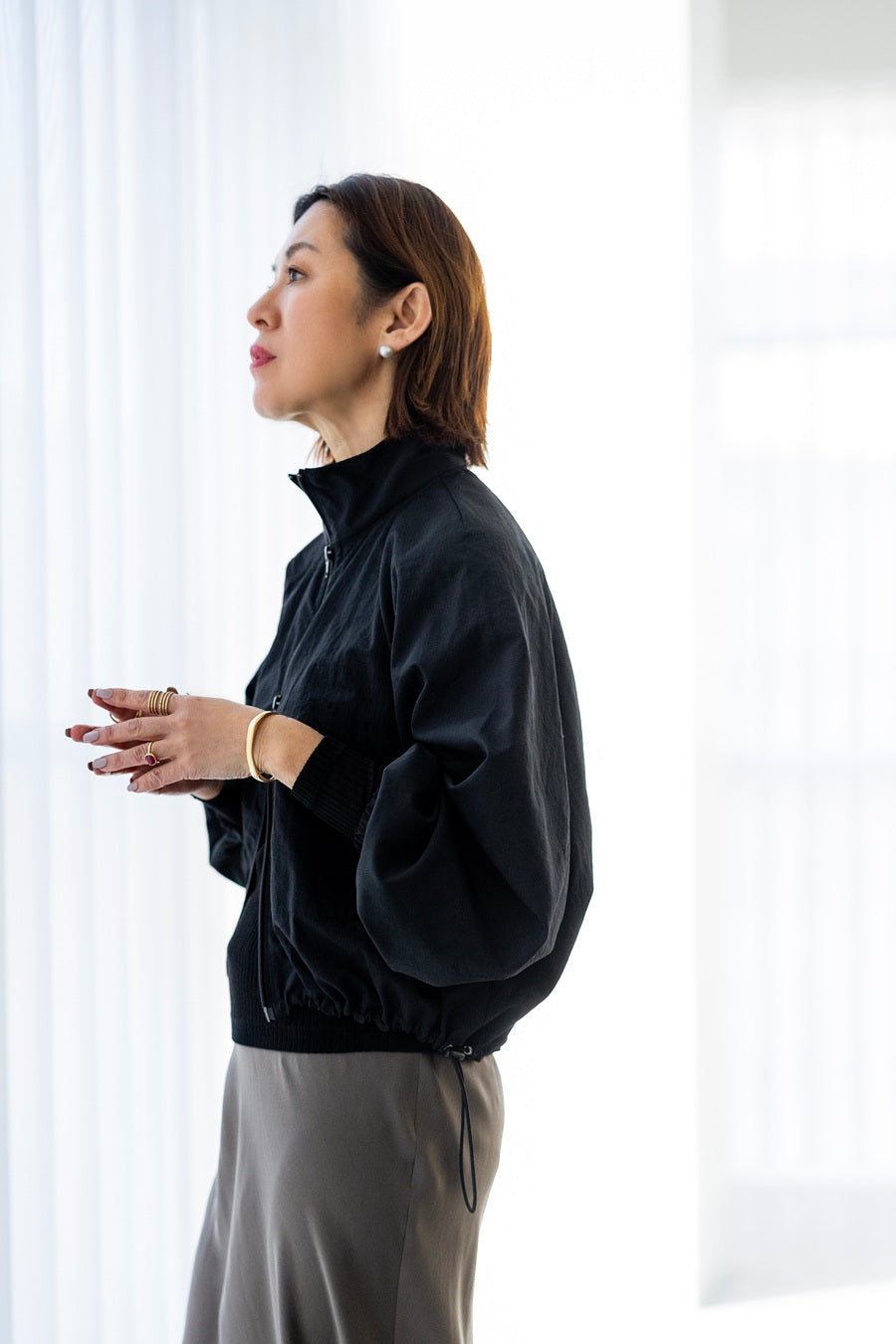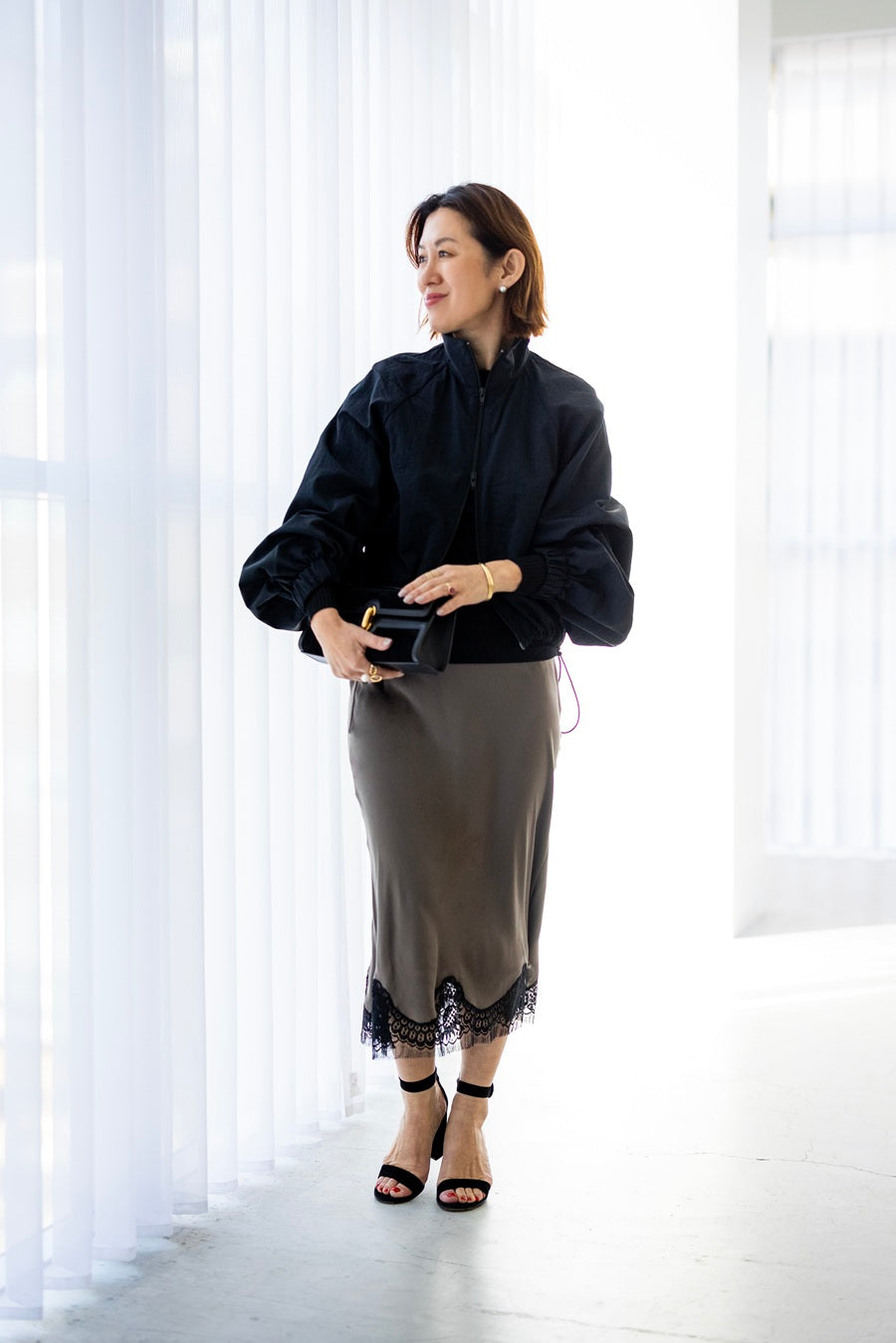 今回はこのブルゾンに、サテンとレースが揺れるフェミニンなスカートを合わせ、あえてフロントを閉じてモードなニュアンスに。カジュアルなスポーツアイテムが、これほどまでに大人の品位を損なわない理由は、生地に溶け込むように配されたファスナーにあります。細やかなディテールや、シルエット、程よい素材のハリ――大人のスポーツミックスは、バランスが鍵。こんなベストバランスのブルゾンがあれば、手持ちのワードローブさえも、新鮮に蘇るはず。
