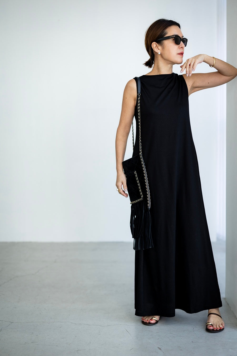 肌触りのいいさらりとした質感と、絶妙な落ち感を備えたカットソー素材で仕立てた、マキシ丈のワンピース。一見するとミニマルな一着ですが、そこには祐宗さんの、計算し尽くされた美学が宿っています。