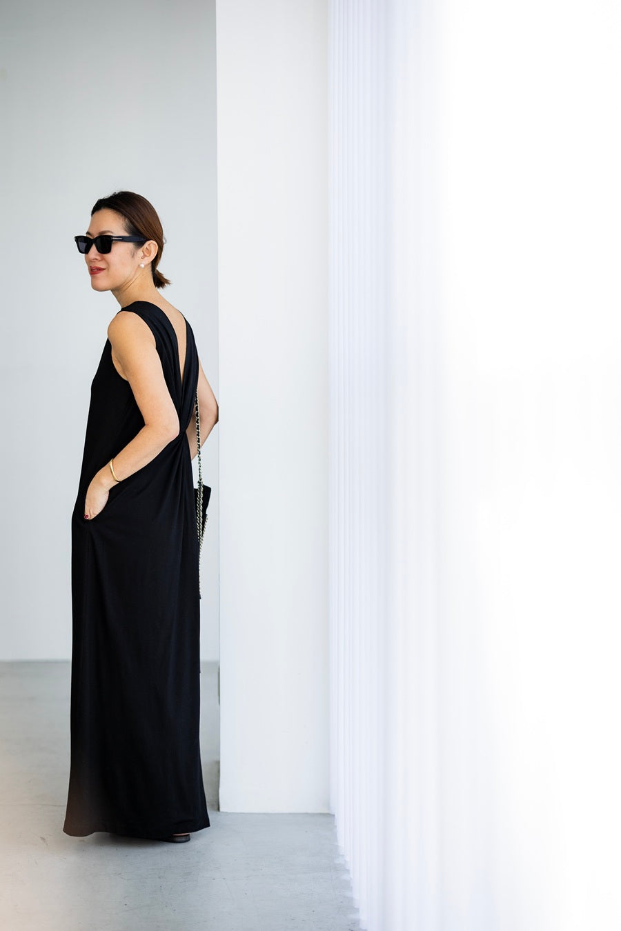背中の開きは、下着が見えないギリギリのライン。そんな日常のリアルに寄り添うこだわりが、大人の女性をより自由にしてくれます。大草は、この完璧なまでに美しいシルエットを、まずは潔く一枚で楽しみたいと言います。360度どこから見ても完成された、品格ある黒いワンピースは、私たちの「ザ・リアル」が凝縮された一枚。