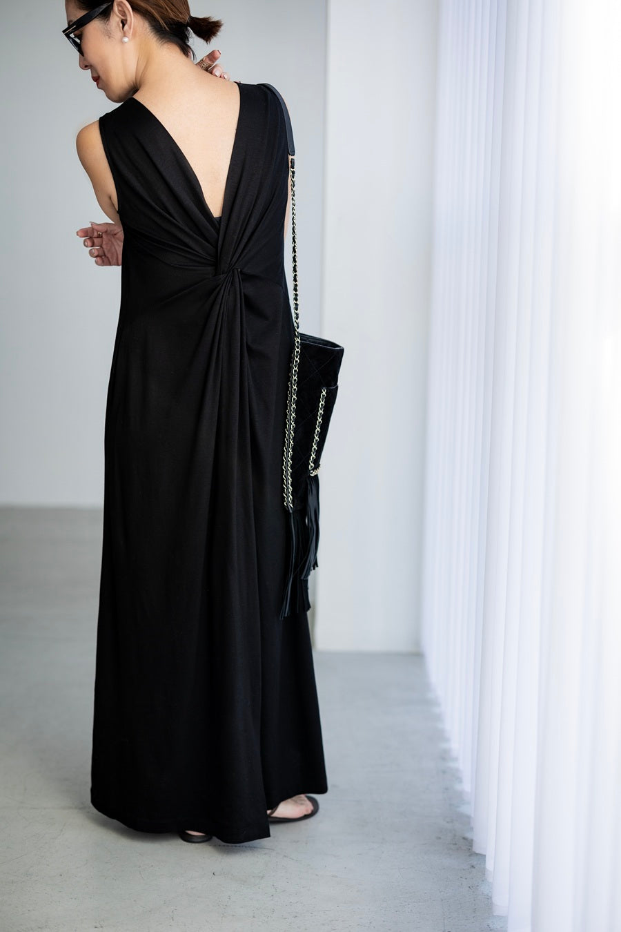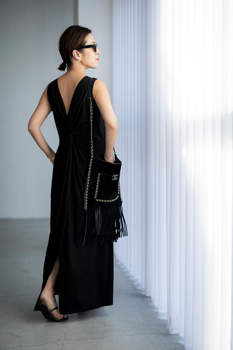 身体のラインを拾いすぎない開放的なナローシルエットは、纏うだけで自然なメリハリを生む魔法のような設計。顔周りを端正に見せるコンパクトなネックラインに対し、バックスタイルには大胆なノットデザインとスリットを施し、ドラマティックな抜け感を演出しました。実は、今でこそ定番となった「背中で抜け感を出す」という手法。これをいち早く提案し、世に広めた第一人者は、祐宗さんなのではないでしょうか。