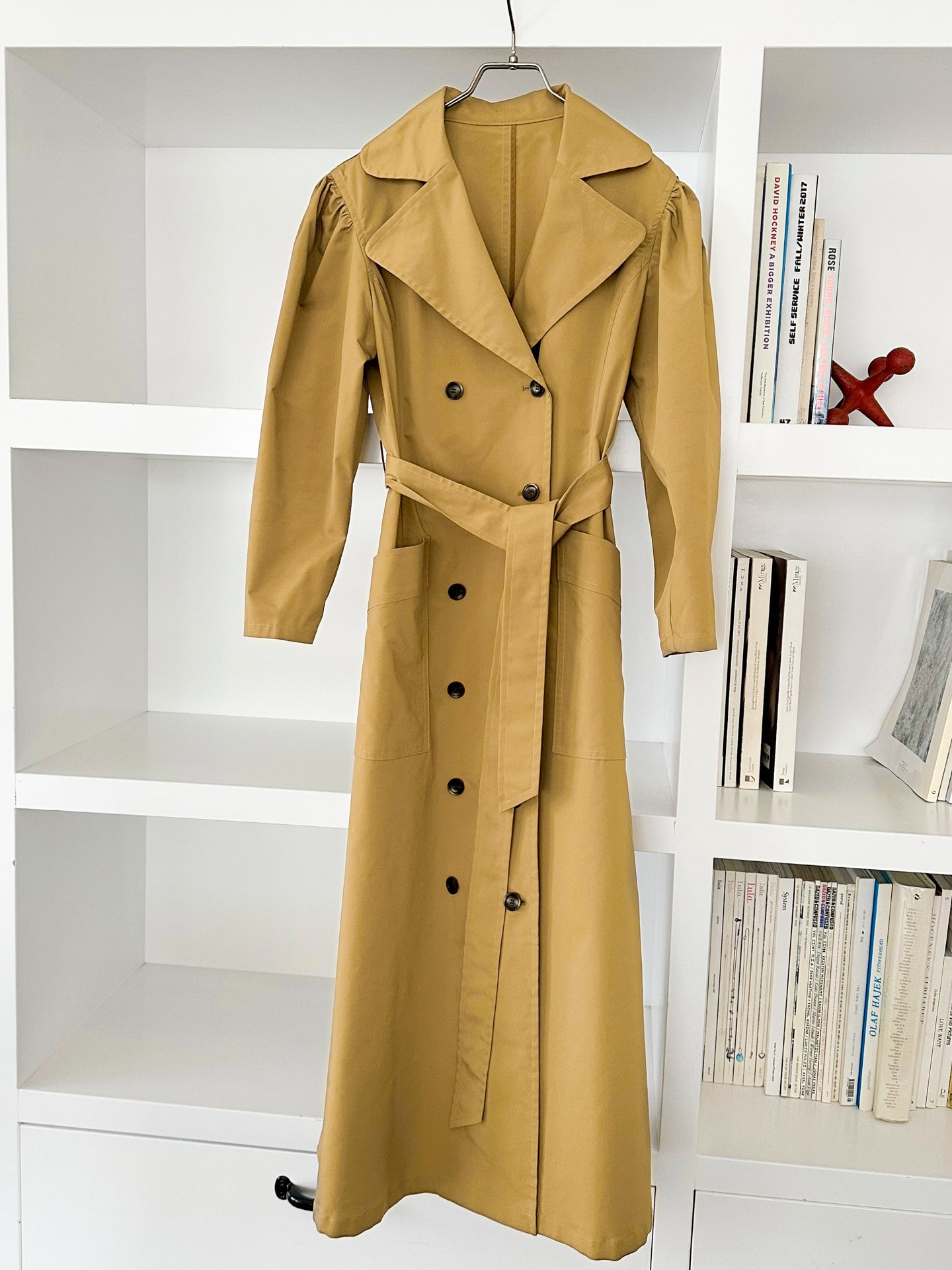 トレンチコートというと、堅いイメージもありますが、このワンピースを日常に引き寄せているのが、軽やかな高密度のタフタ素材。ラフな印象を与え、着こなしにスピードを感じさせます。そしてもう1つが、日本人の肌とも相性が良いゴールドベージュ。どんな色ともマッチしてくれるので、合わせの色に悩む心配もありません。