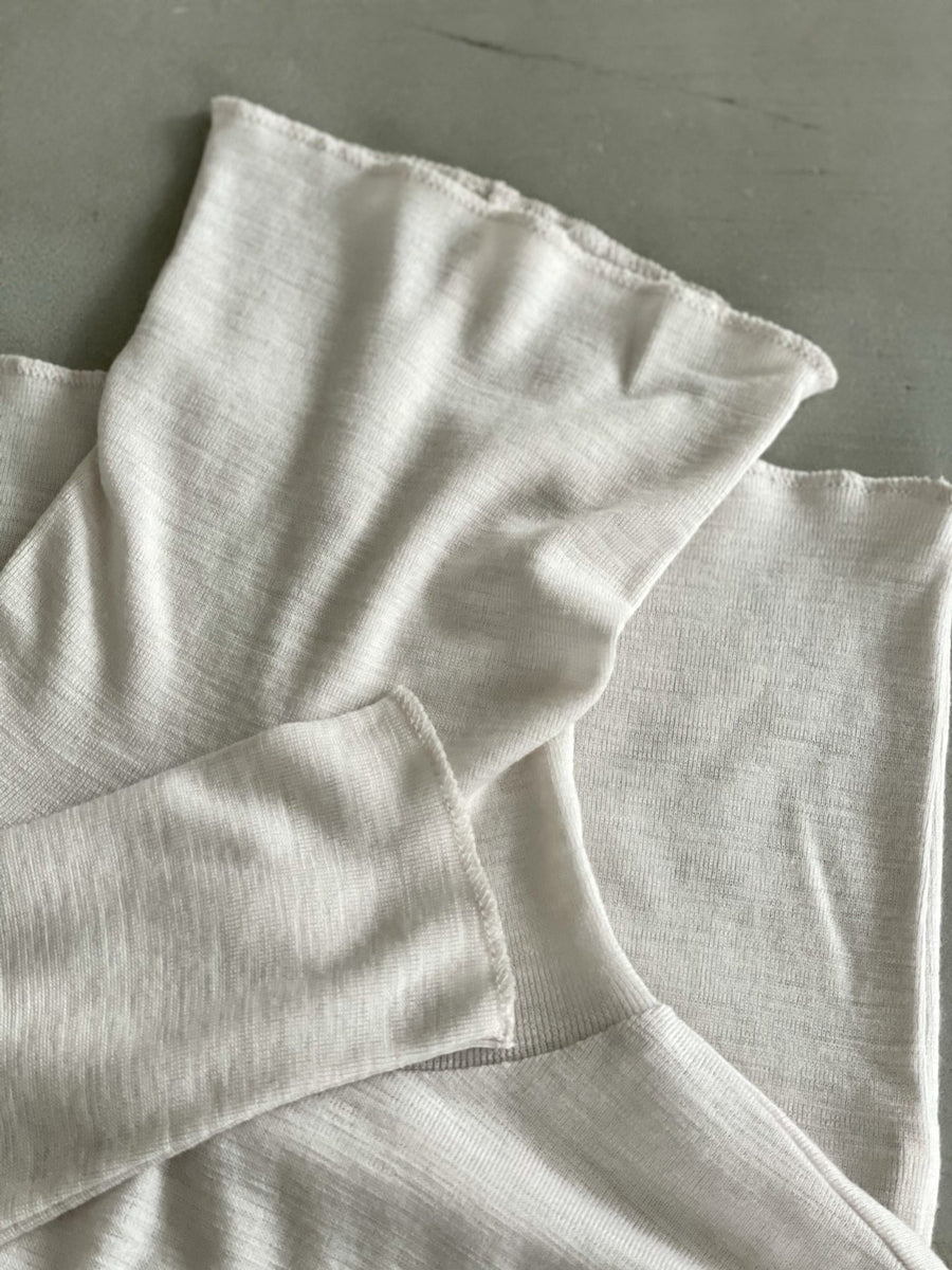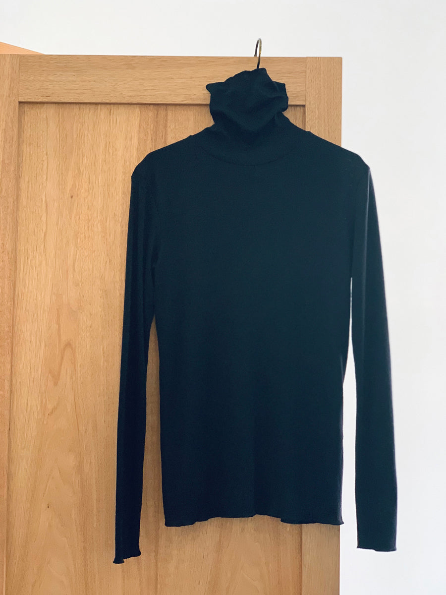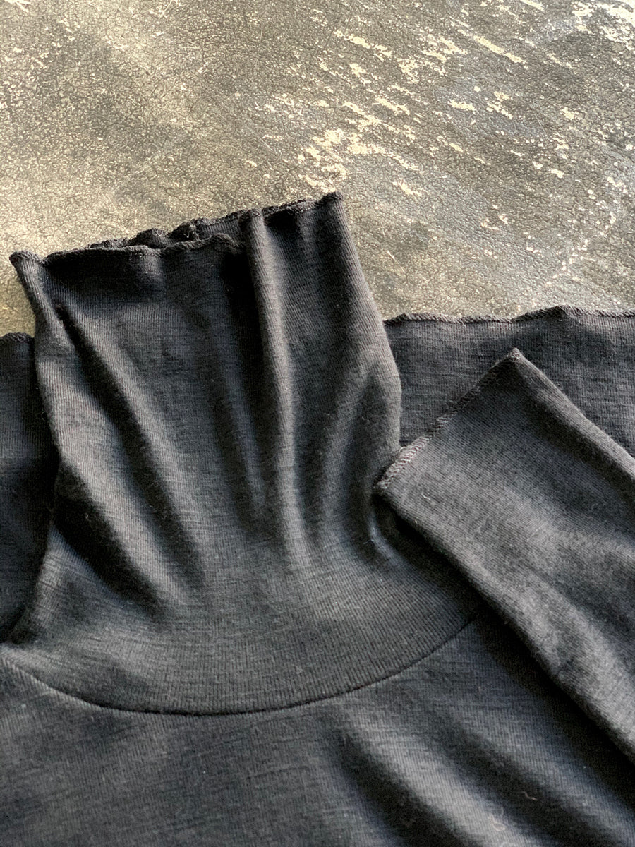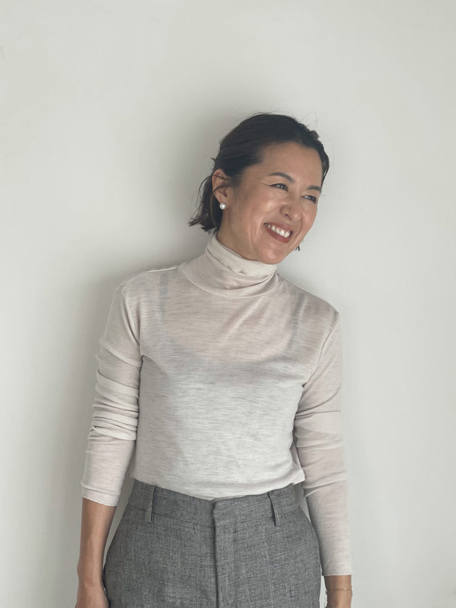 素材は野暮ったくならないように、さらっとしたフライス生地に。そして大人の女性でも抵抗なく着られる、程よい透け感にこだわりました。その透け感を細部まで維持できるよう、布端は織り込むのではなく、メロー仕上げ(ミシンを使って布端を処理すること)にしています。もちろん家庭での洗濯もOK。一枚で着るのはもちろん、ワンピースやシャツ、ジャケットのインナーに着用すれば、お持ちのワードローブをまた新たな着こなしで楽しむことができます。毎日のおしゃれを様々な面からサポートしてくれる、相棒のようなタートルネックです。