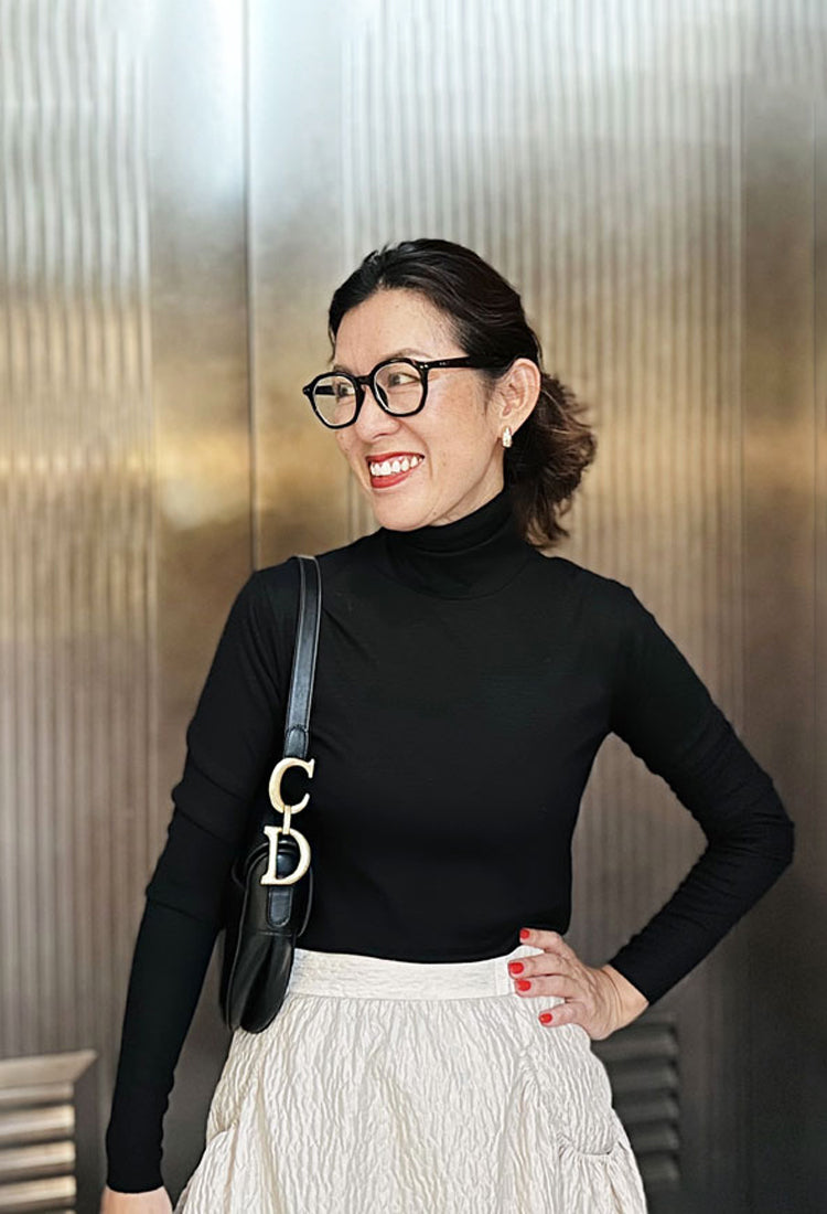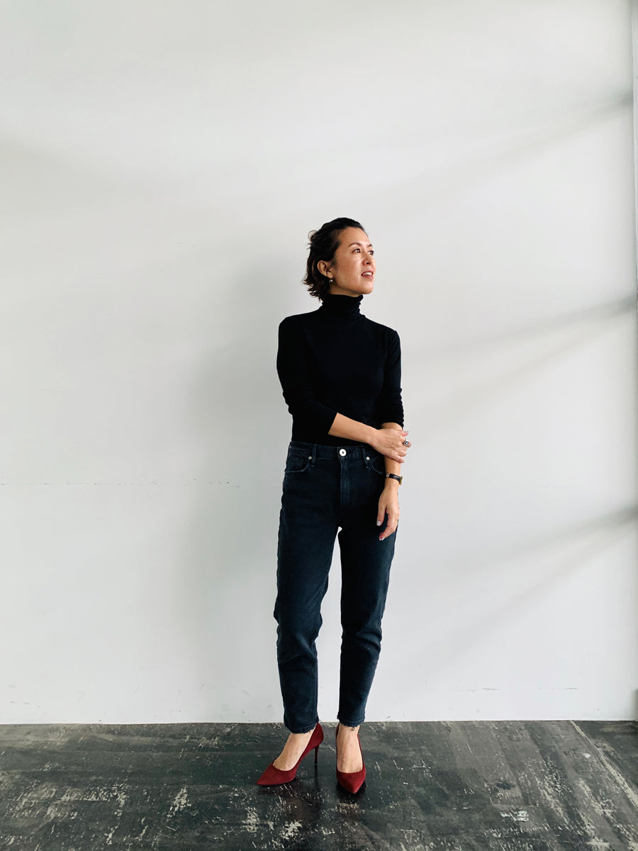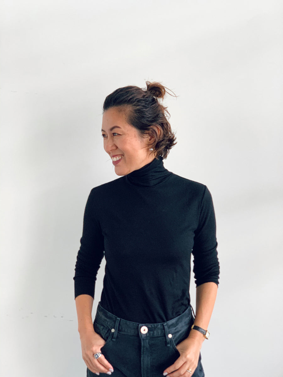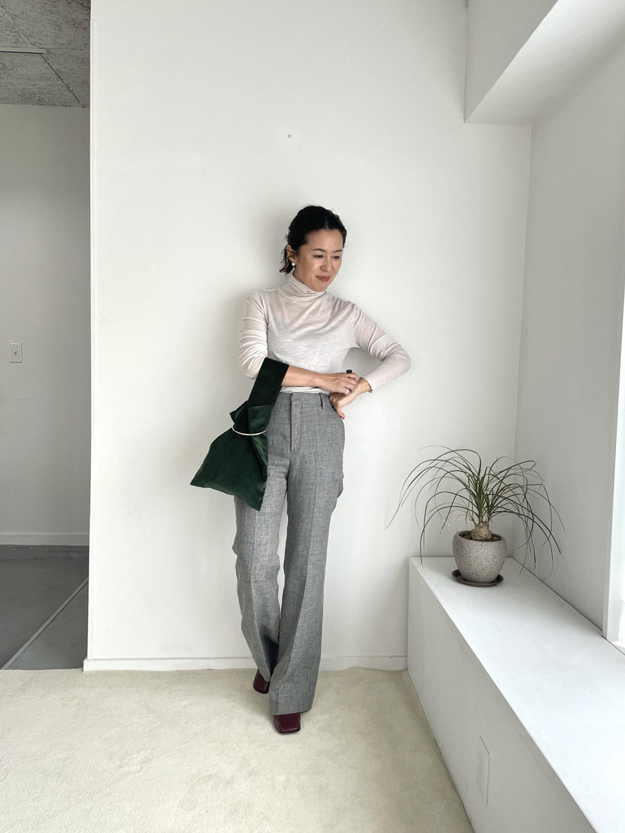 素材は野暮ったくならないように、さらっとしたフライス生地に。そして大人の女性でも抵抗なく着られる、程よい透け感にこだわりました。その透け感を細部まで維持できるよう、布端は織り込むのではなく、メロー仕上げ(ミシンを使って布端を処理すること)にしています。もちろん家庭での洗濯もOK。一枚で着るのはもちろん、ワンピースやシャツ、ジャケットのインナーに着用すれば、お持ちのワードローブをまた新たな着こなしで楽しむことができます。毎日のおしゃれを様々な面からサポートしてくれる、相棒のようなタートルネックです。
