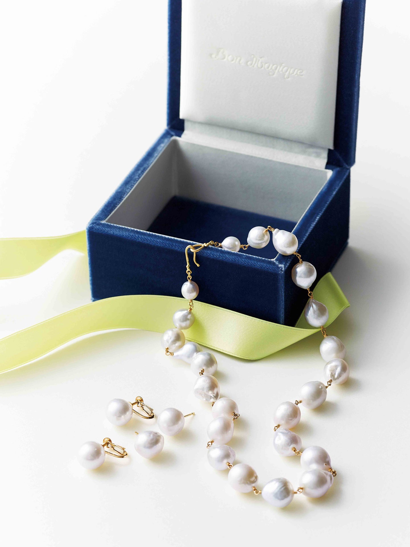 「清潔でセクシーで。知性があって思慮深く。だけどどこか遊び心がある」と、 本誌編集長の大草も絶賛。 10年以上にわたり愛用し、特集のスタイリングでもたびたび使用してきた「ボン マジック」のバロックパールジュエリー。前号でもご紹介し、大反響を呼んだ逸品が待望のリバイバル。