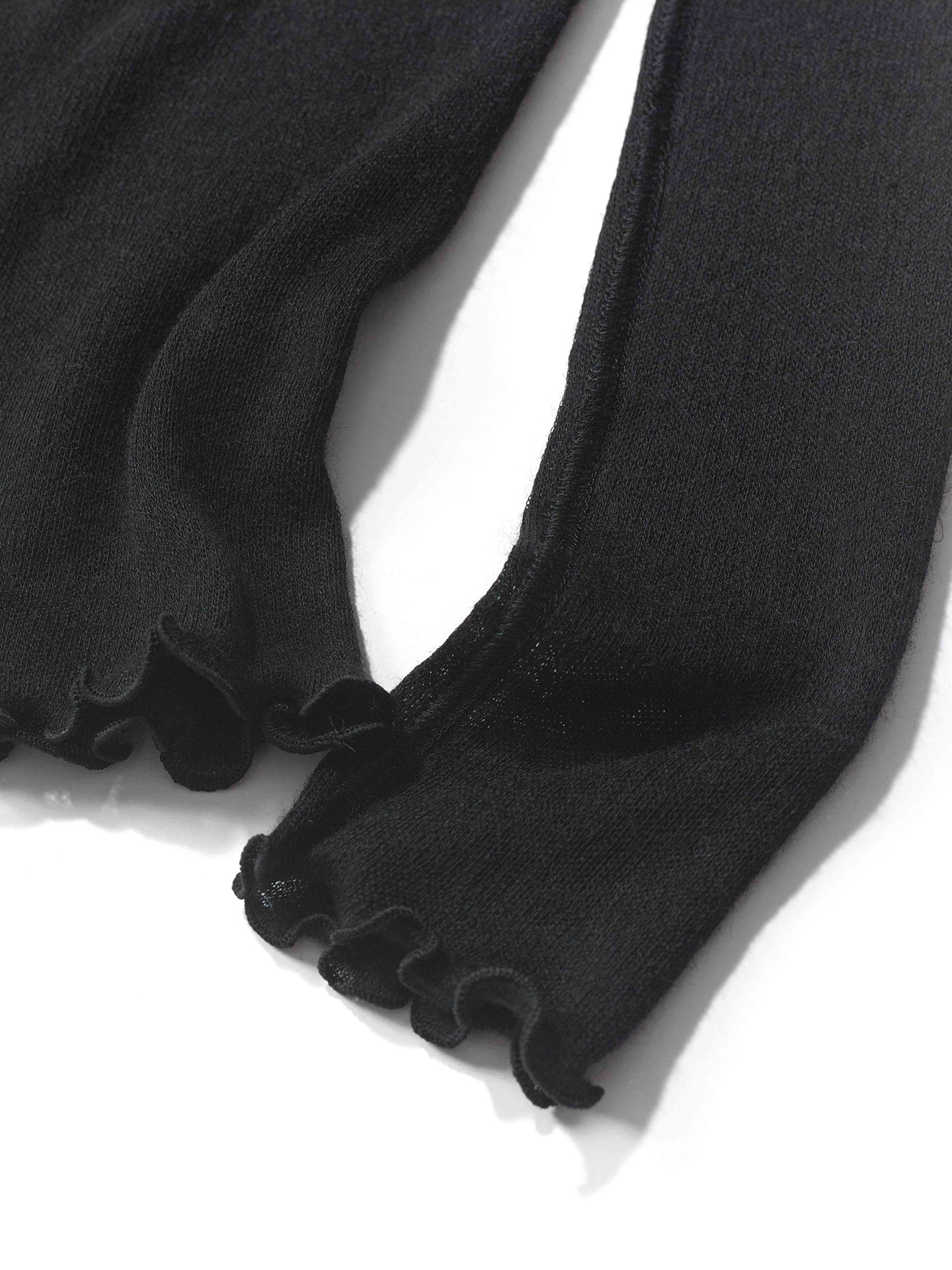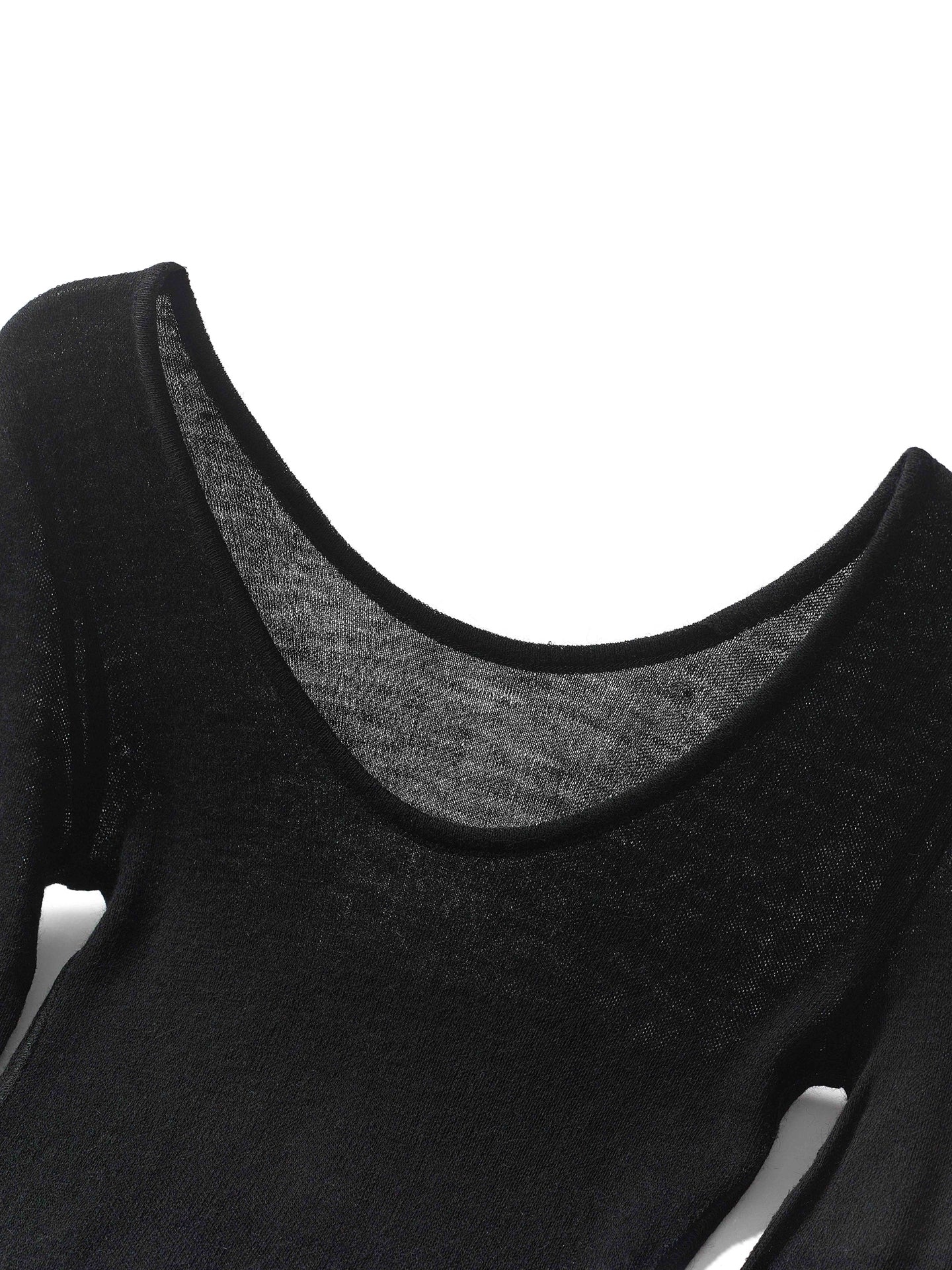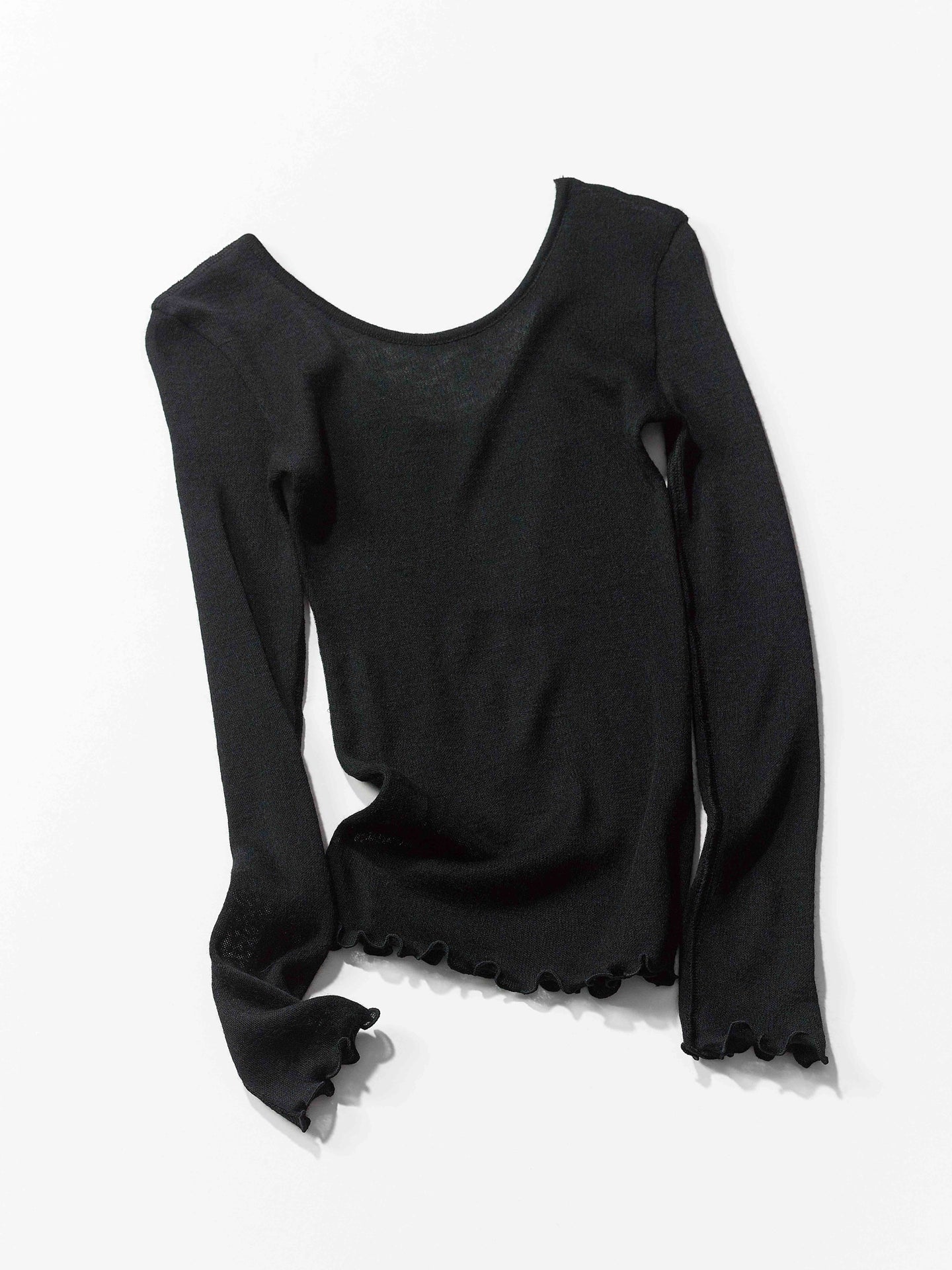 肌に直接触れるものだから、ストレスを最大限減らすためにあえて縫い目を外側にしているのもポイント。裾と袖口のメロー仕立ては、クシュッとアクセントがあることで、一枚着でもサマになり、インナーとして仕込んだときにチラッと見えてもセンスフル。後ろを深めにとったバックコンシャスデザインは、AMARCオリジナル。合わせる下着や洋服を選ばない絶妙な開きに設定。どちらを前にしても着られます。軽やかでほんのりシアーな黒は、インナーとしてはもちろんデイリークローズとしても万能。