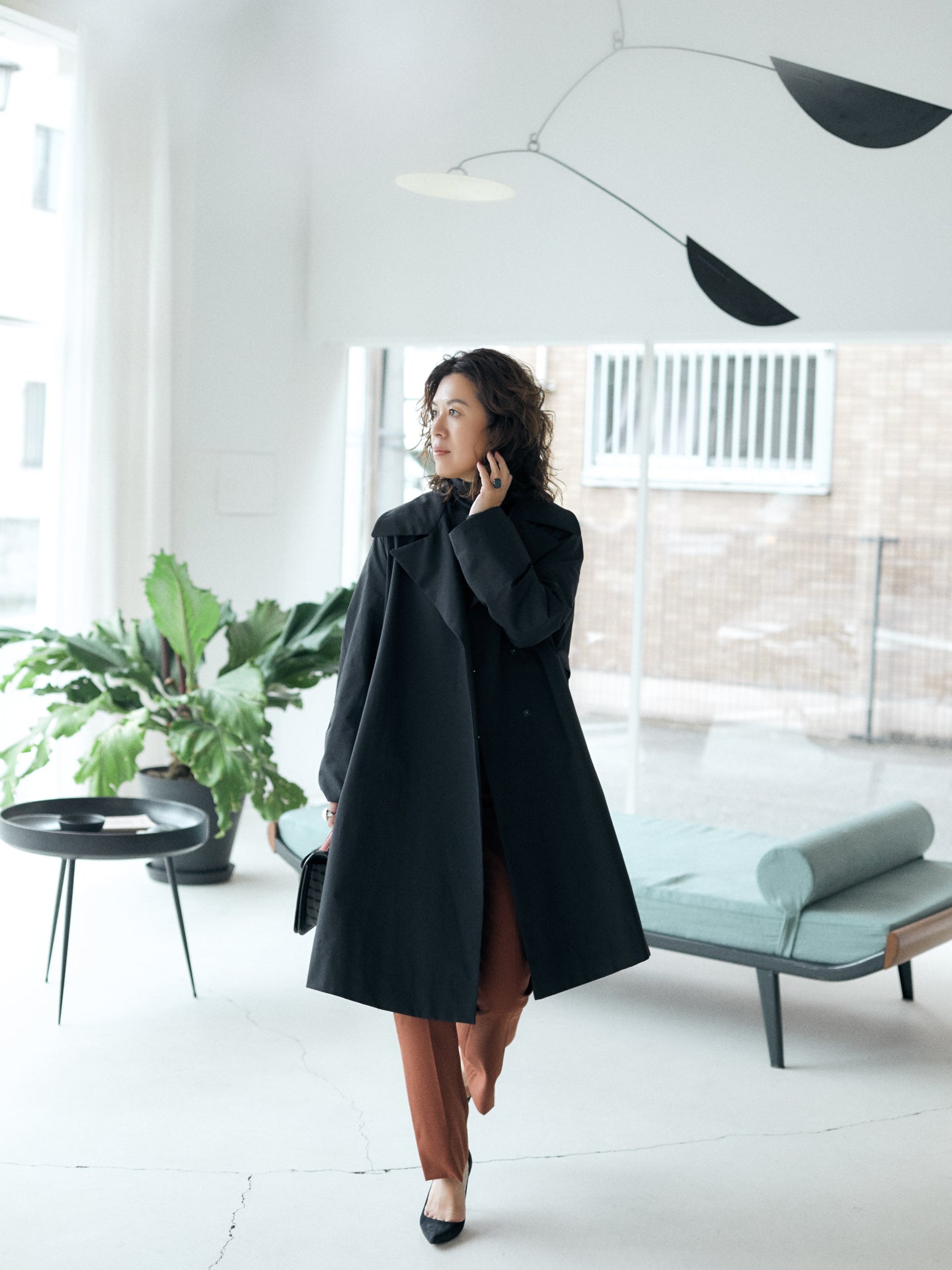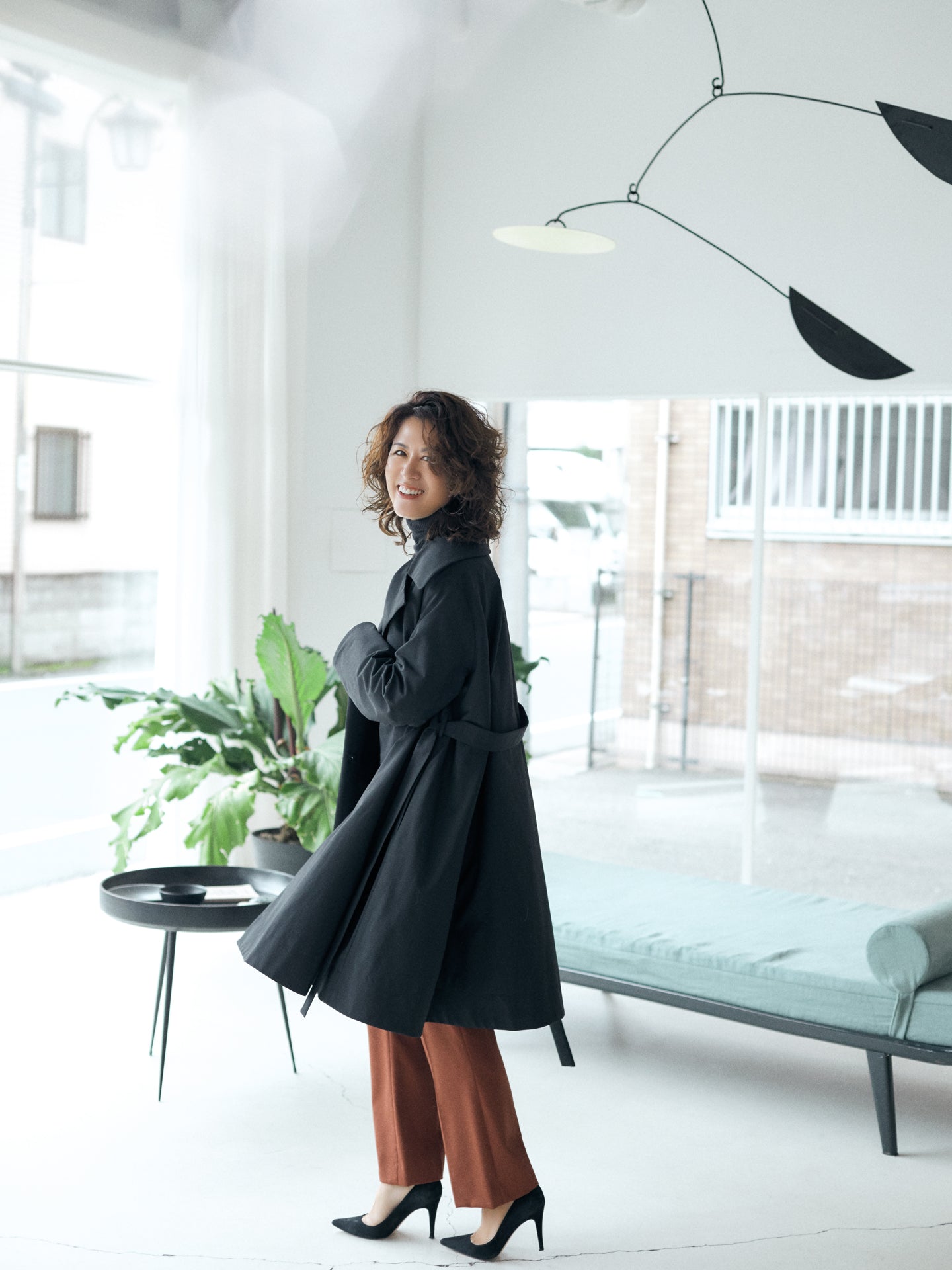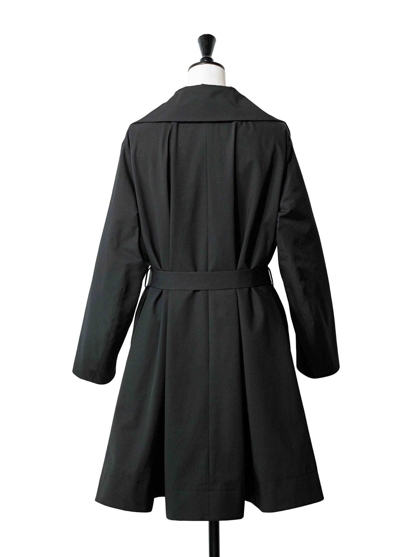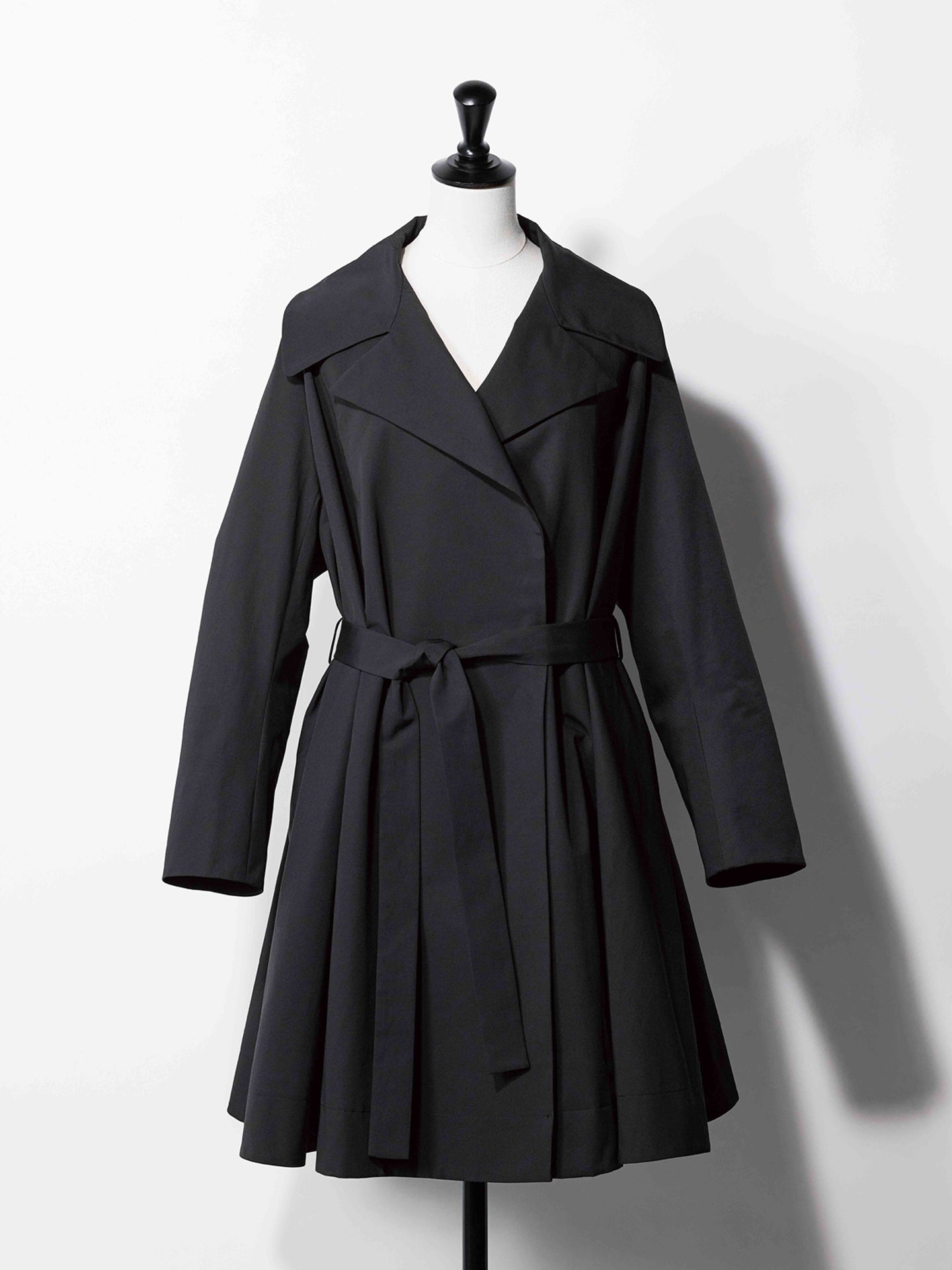 着流してフォルムの美しさを存分に味わっていただくのもいいし、スナップボタンを留めて少しコンパクトに着ても。共布のベルトでギュッと絞って花びらのようなフェミニンなシルエットにアレンジするのもおすすめです。雨の日も着られる撥水加工が施されているのもの嬉しい。