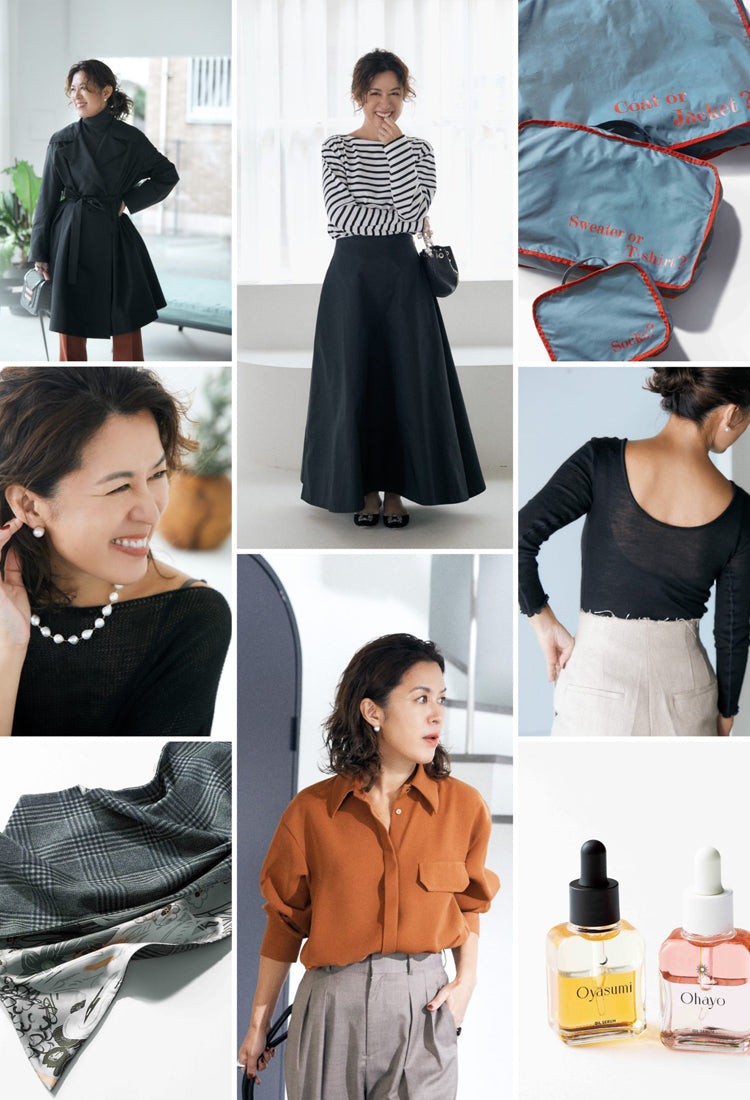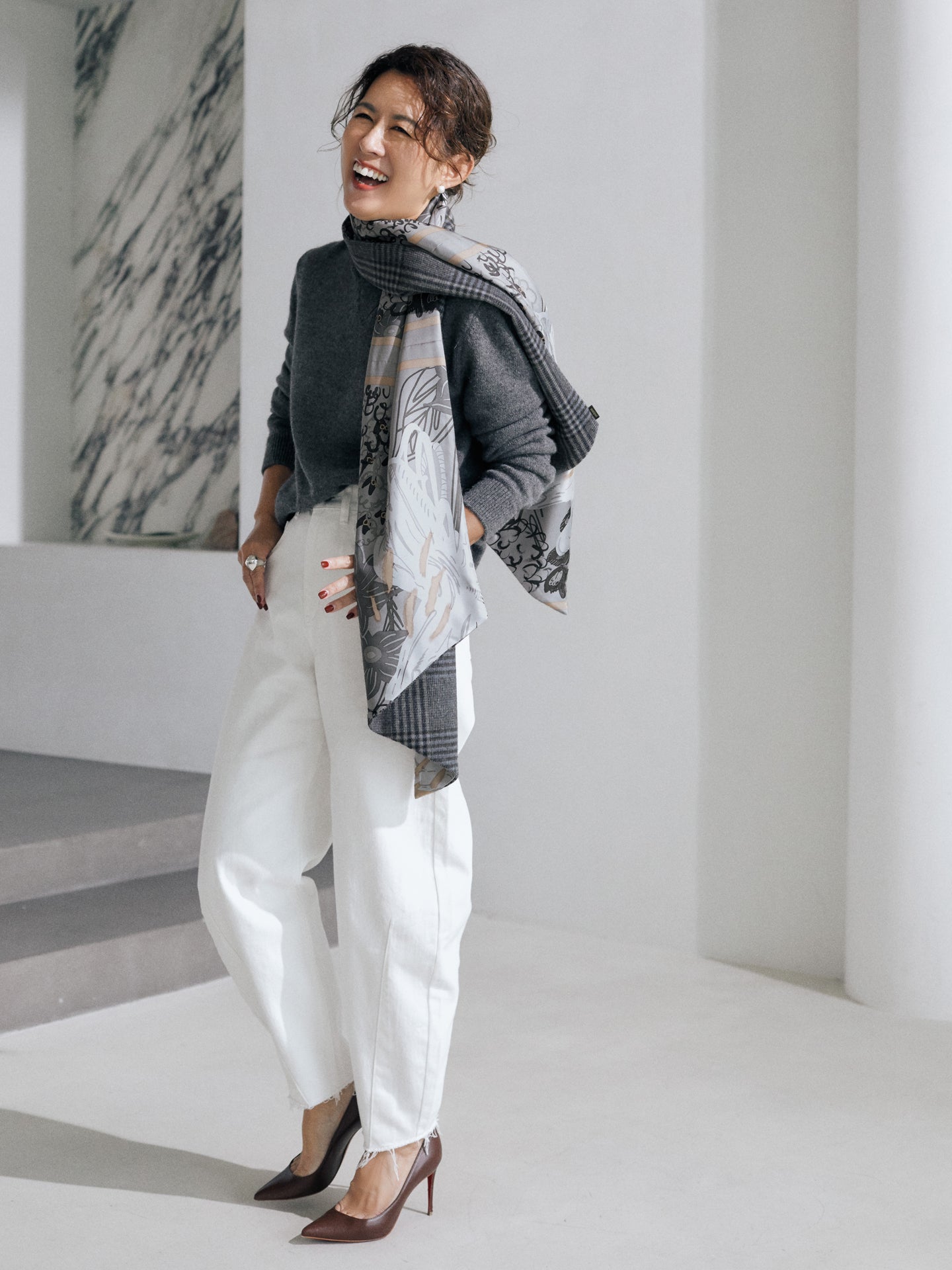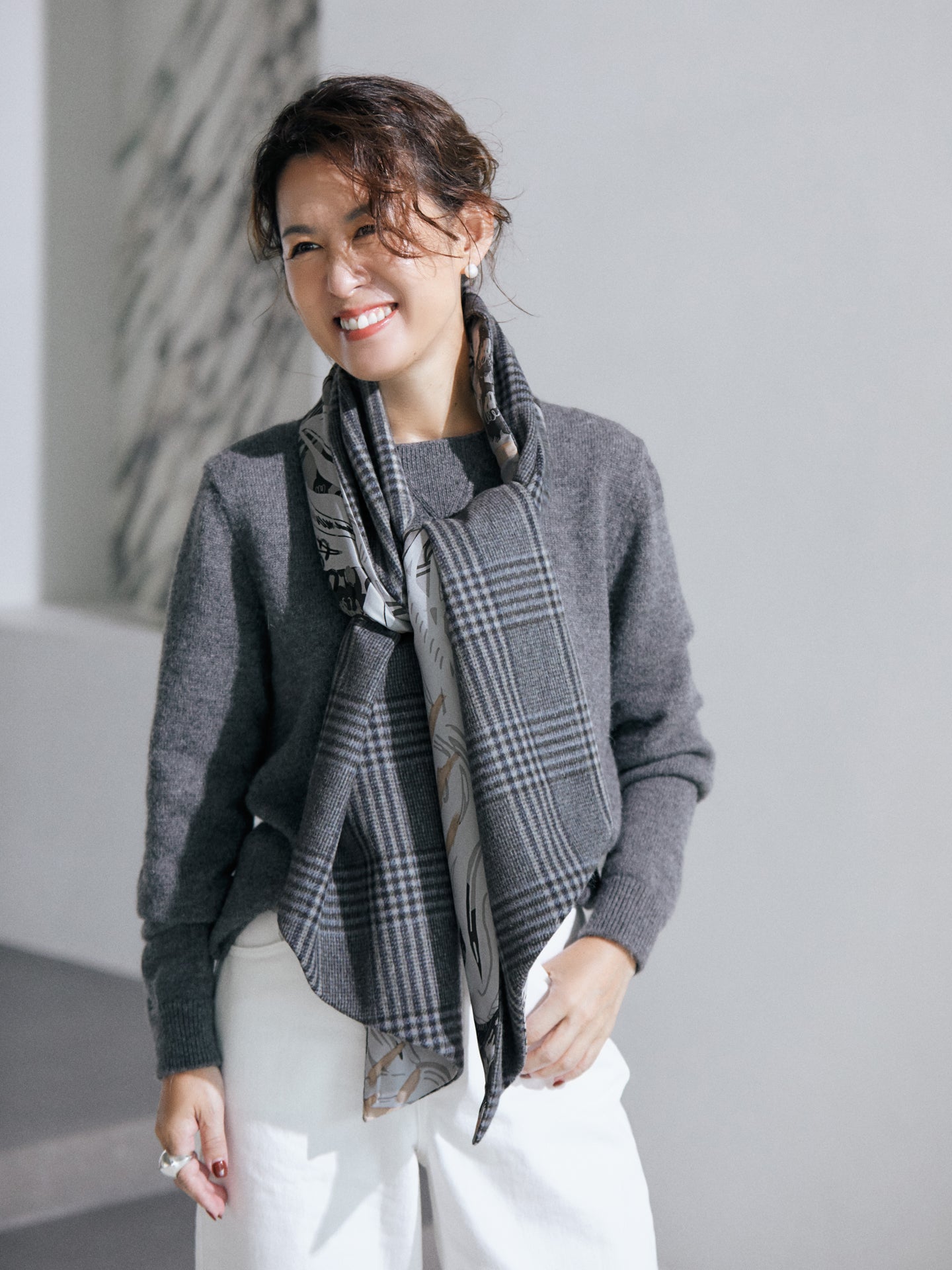 グレー同士という共通点が、全く異なる柄のつなぎ役となり、スタイリングにスッと溶け込むのも思惑通り。自由な感性で生み出された多様性のあるデザインは、アレンジもまた着手の感性に委ねられています。肩を包み込むように羽織ったり、クルクルッと無造作に巻いたり、お気に召すまま。
