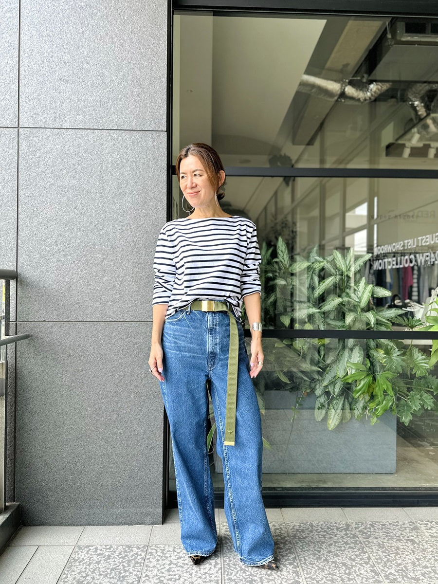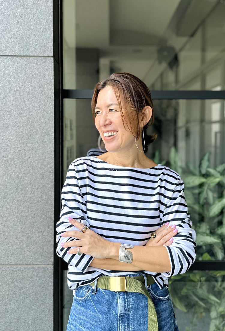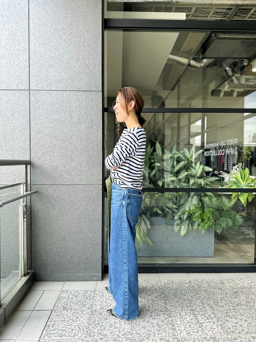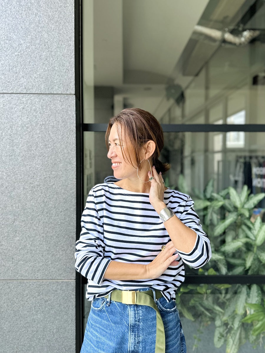 オーガニックコットンを使用しているので肌あたりがなめらかで、着心地がバツグン。大草をはじめAMARC編集部員も愛用しているボーダーカットソー。1枚で着るのはもちろん、中にシャツやタートルネックカットソーをレイヤードすれば、さまざまな着こなしを楽しめます!