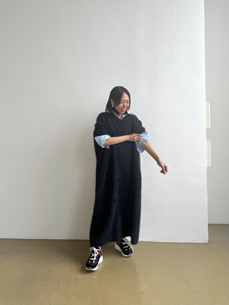 ワンピースではあるのですがゆったりとしたシルエットなので、シャツやシアー感のあるタートルネック、パンツやレギンスなどをレイヤードする着こなしもおすすめ。裾にかけて少しシェイプされているコクーンシルエットは、パンプス、スニーカー、ブーツ――と合わせる靴を選ばず、着手(きて)の思いのままにアレンジを楽しんでいただけます。ワンピースのコーディネートはワンパターンになりがち、というお悩みとも無縁です。