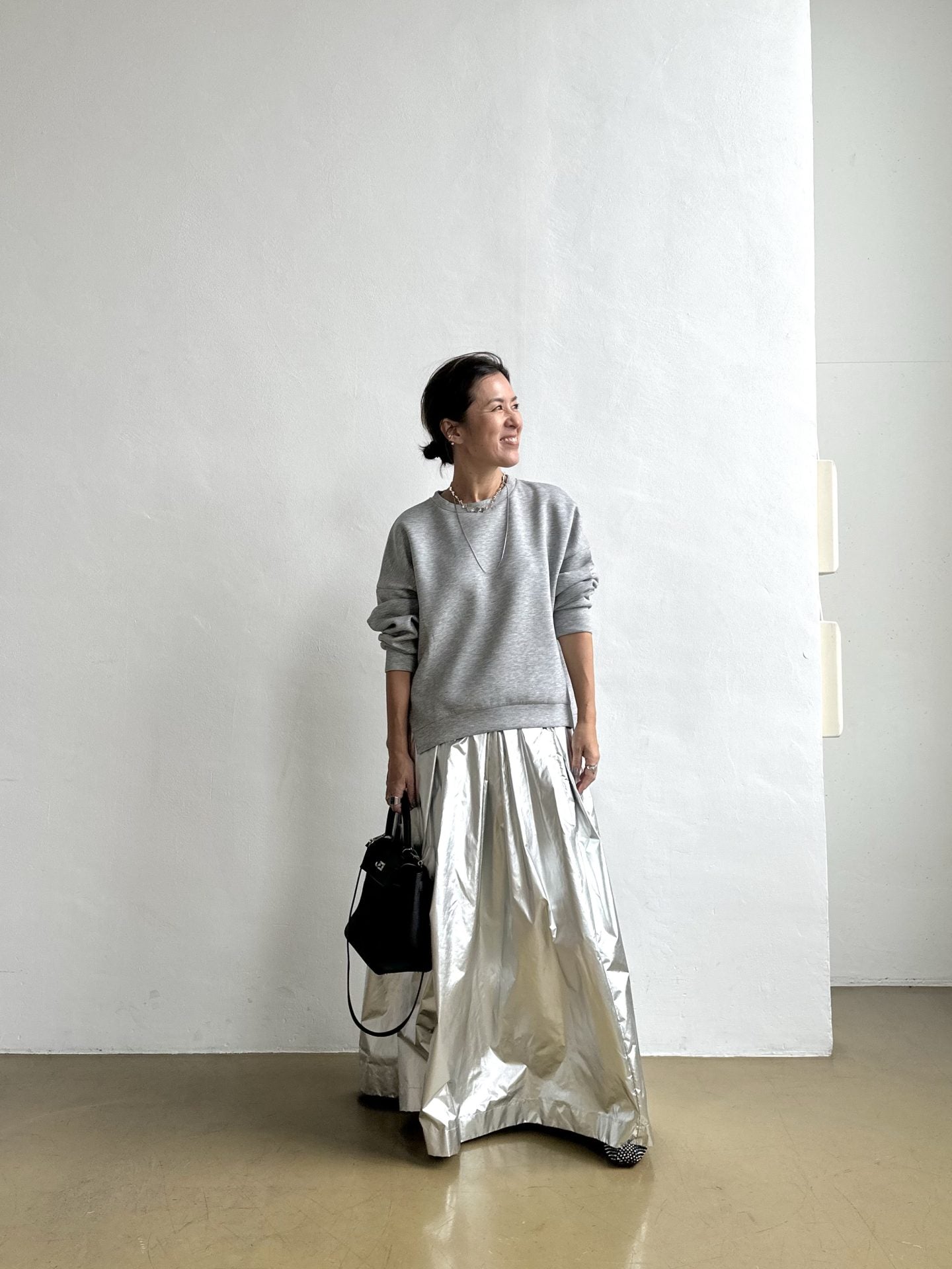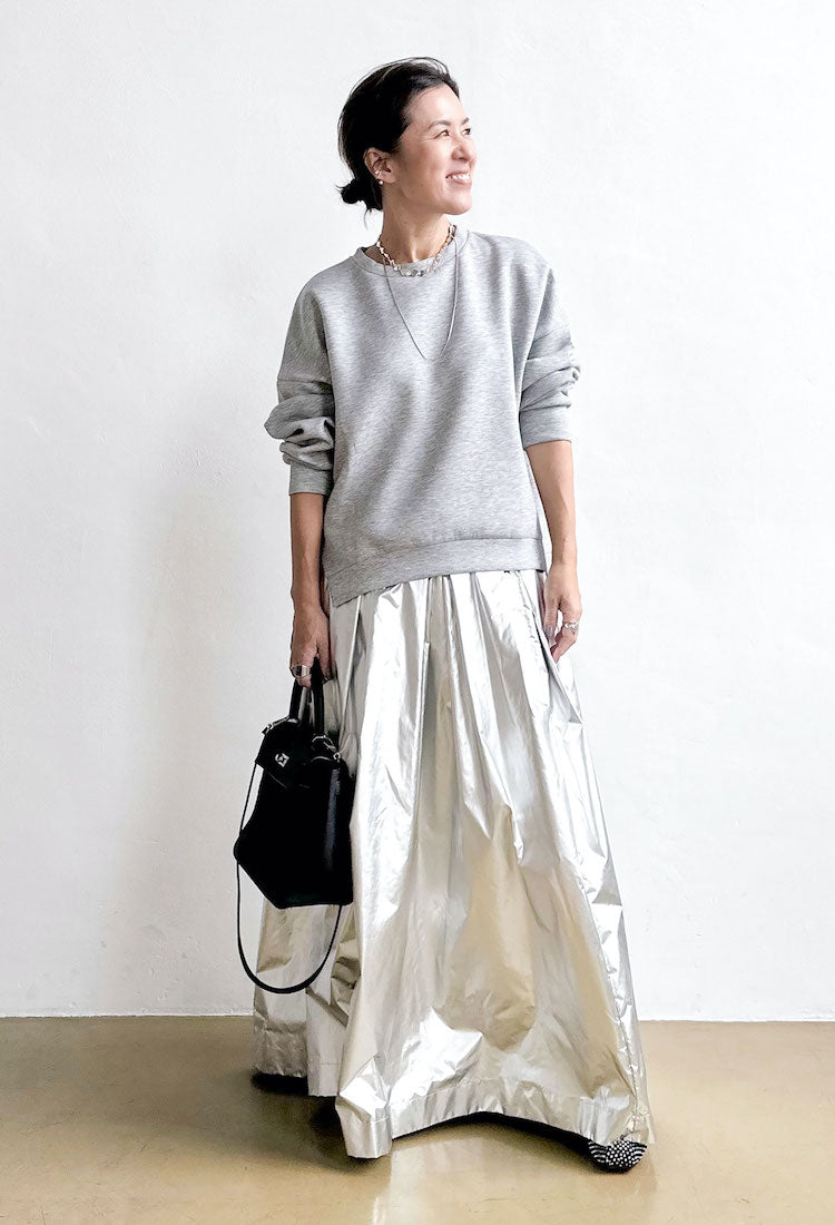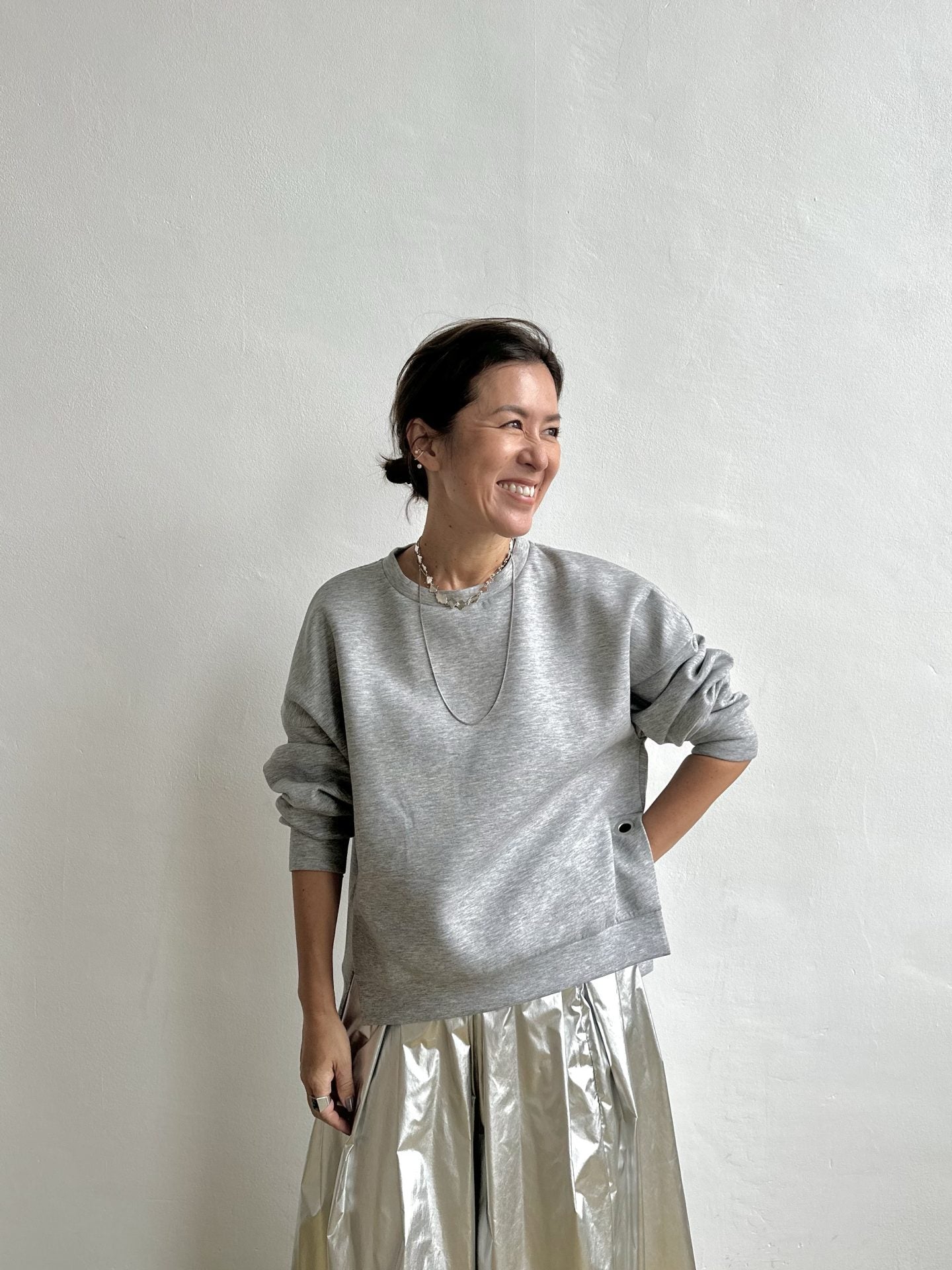色はAMARC別注として「杢グレー」をオーダーしました。素材の特性により、通常の杢グレーのスウェットよりもラグジュアリーな雰囲気に。スウェットを着用してみたいけれど、カジュアルなアイテムはうまく着こなせなかった、という方にもぜひ試してみていただきたい1着です。
