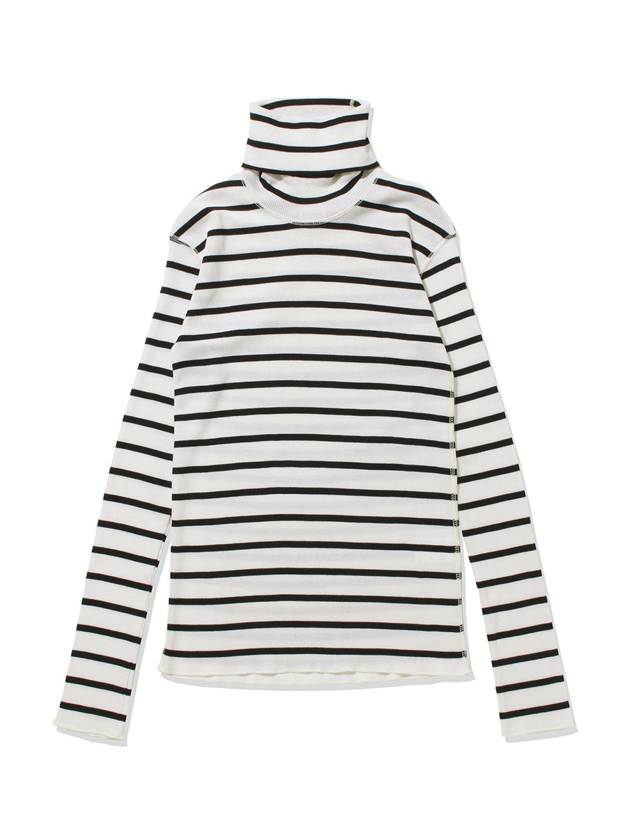 すっきりとしたシルエットながら身体のラインはひろわず、上半身のシルエットを美しく見せてくれます。袖丈が長く設定されているので、シャツやフーディの下に着用して手元からボーダーを見せれば、着こなしのアクセントにも。ウール100%でありながら、手洗いが可能でデイリーに使いやすい1着です。