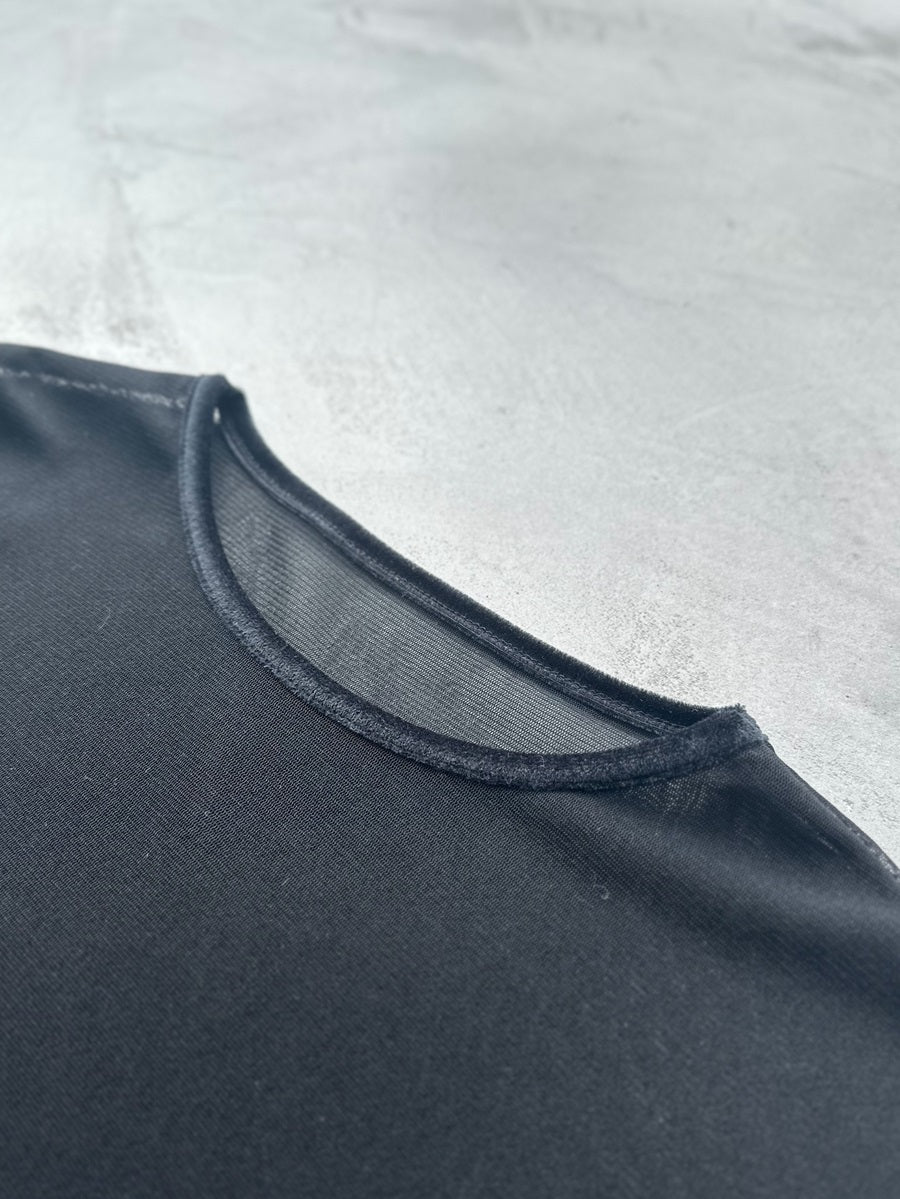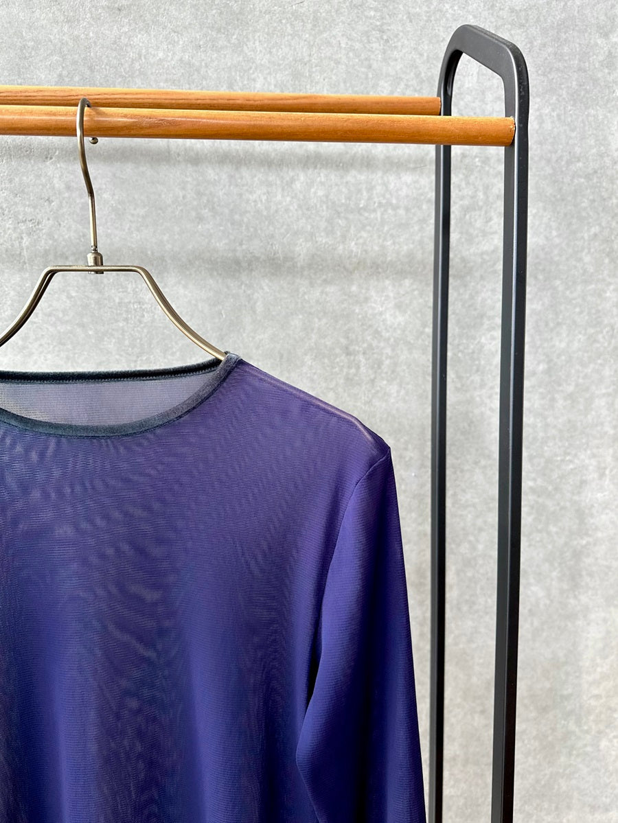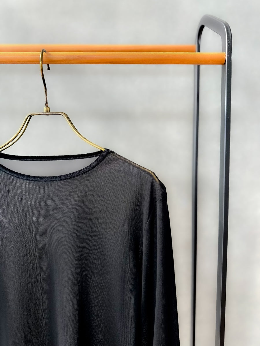シアーな透け感のある素材が軽やかな印象へと導いてくれる、チュール素材のトップス。衿ぐりには、ほのかな光沢感のあるベロア素材をアクセントに配することで、どこかセンシュアルな雰囲気を漂わせます。