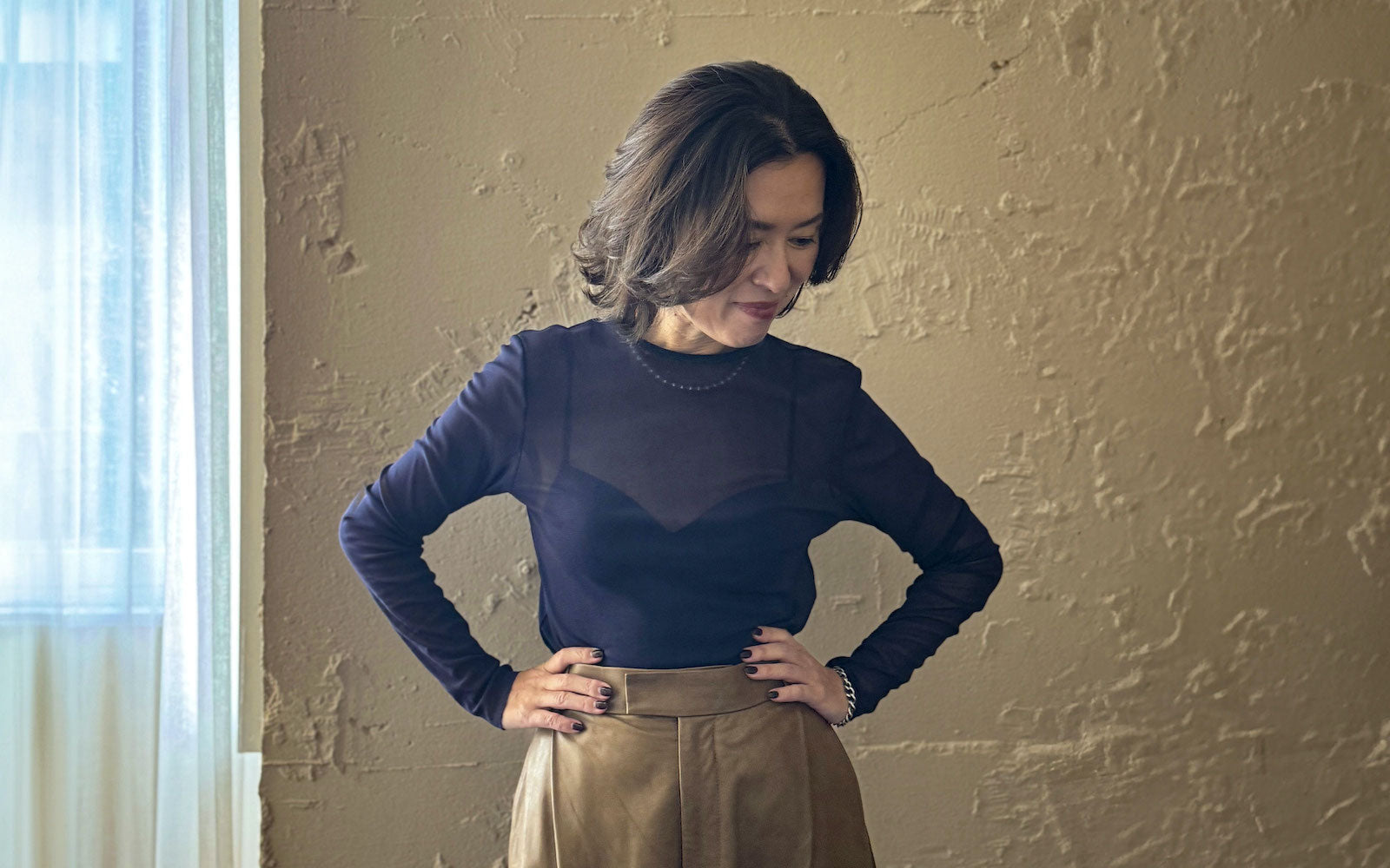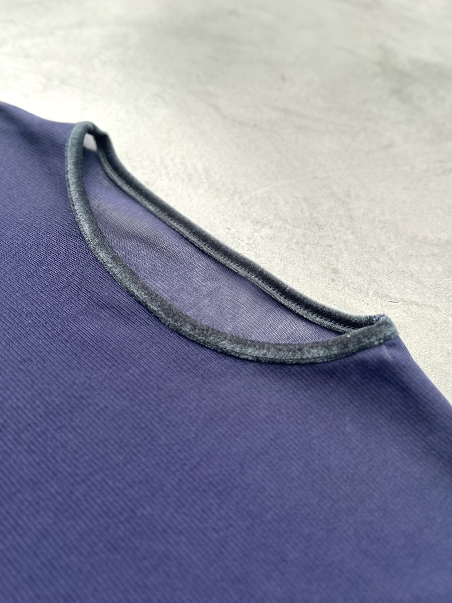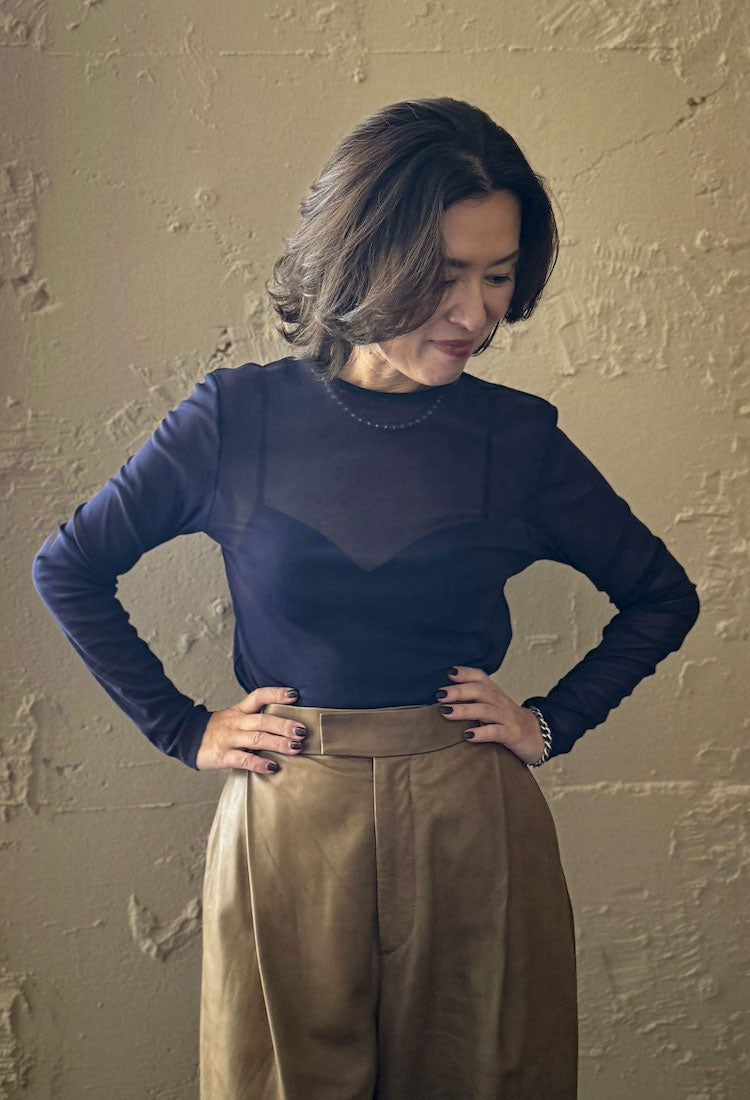 シアーな透け感のある素材が軽やかな印象へと導いてくれる、チュール素材のトップス。衿ぐりには、ほのかな光沢感のあるベロア素材をアクセントに配することで、どこかセンシュアルな雰囲気を漂わせます。