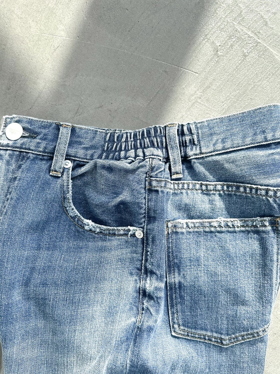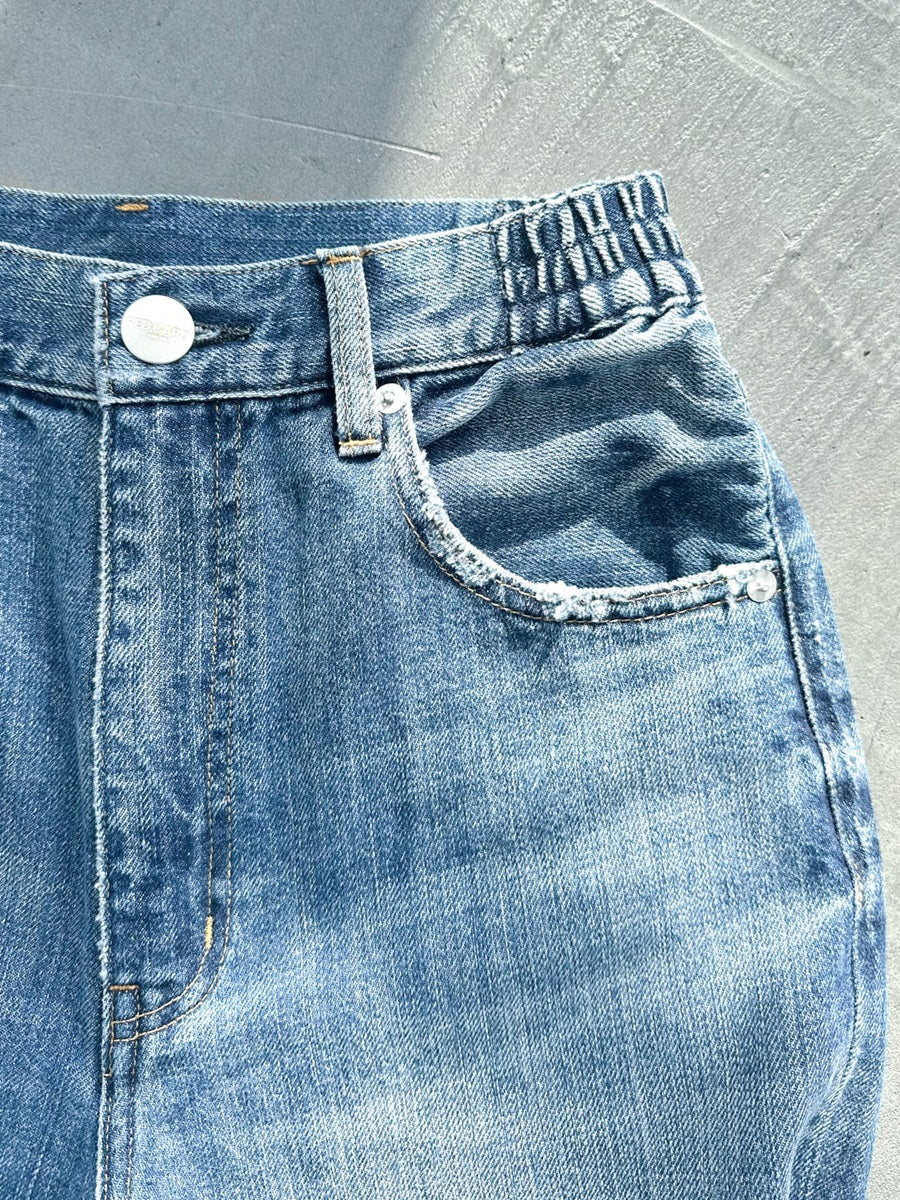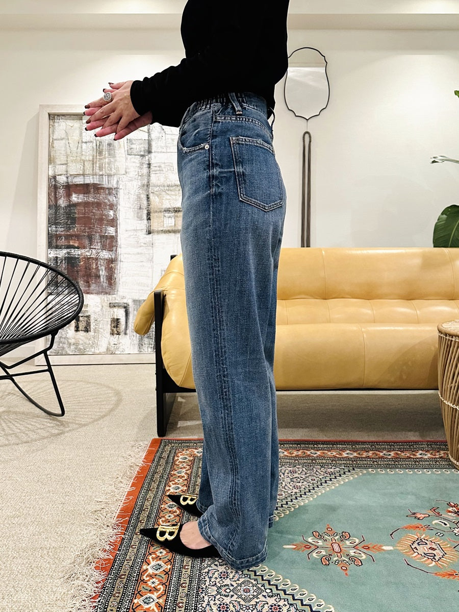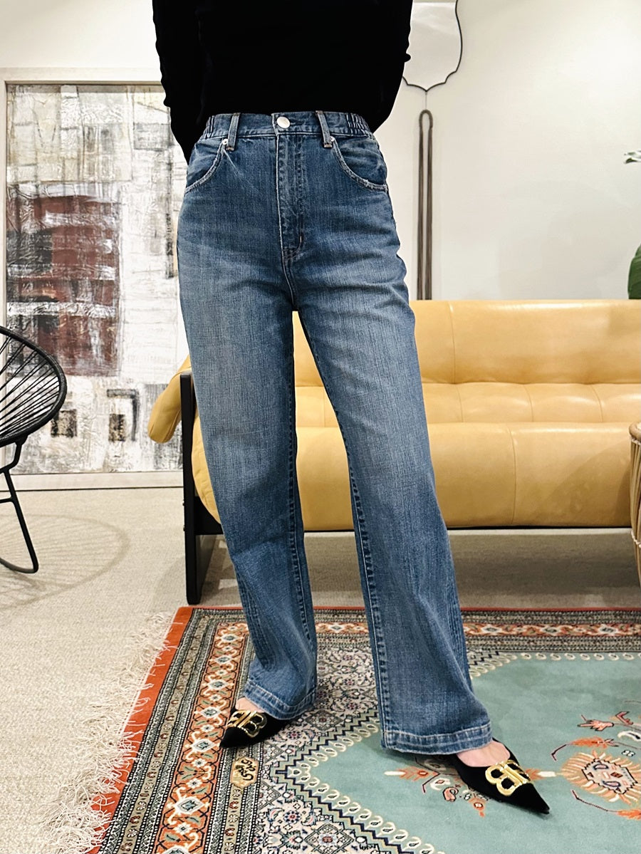 全体をゴムにすると「イージー感」が強くなりますが、両サイドに施すことでデザインポイントになり、デニムパンツの堅牢なイメージは残しながらもリラックス感を手にいれることができます。