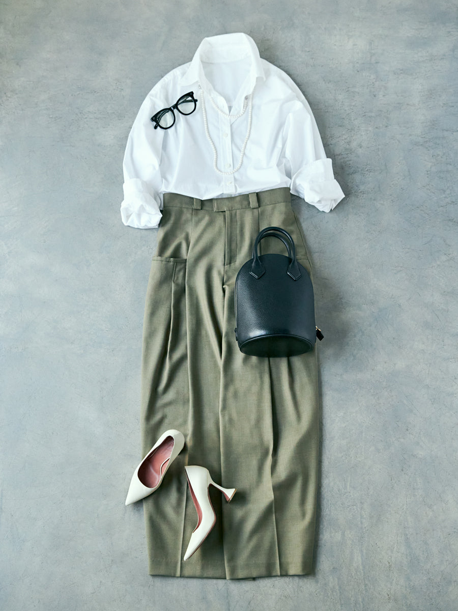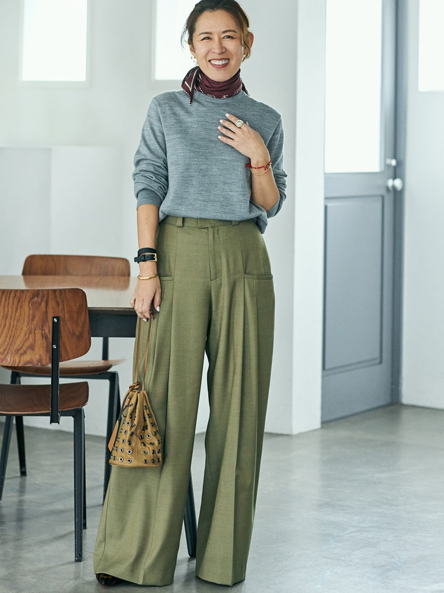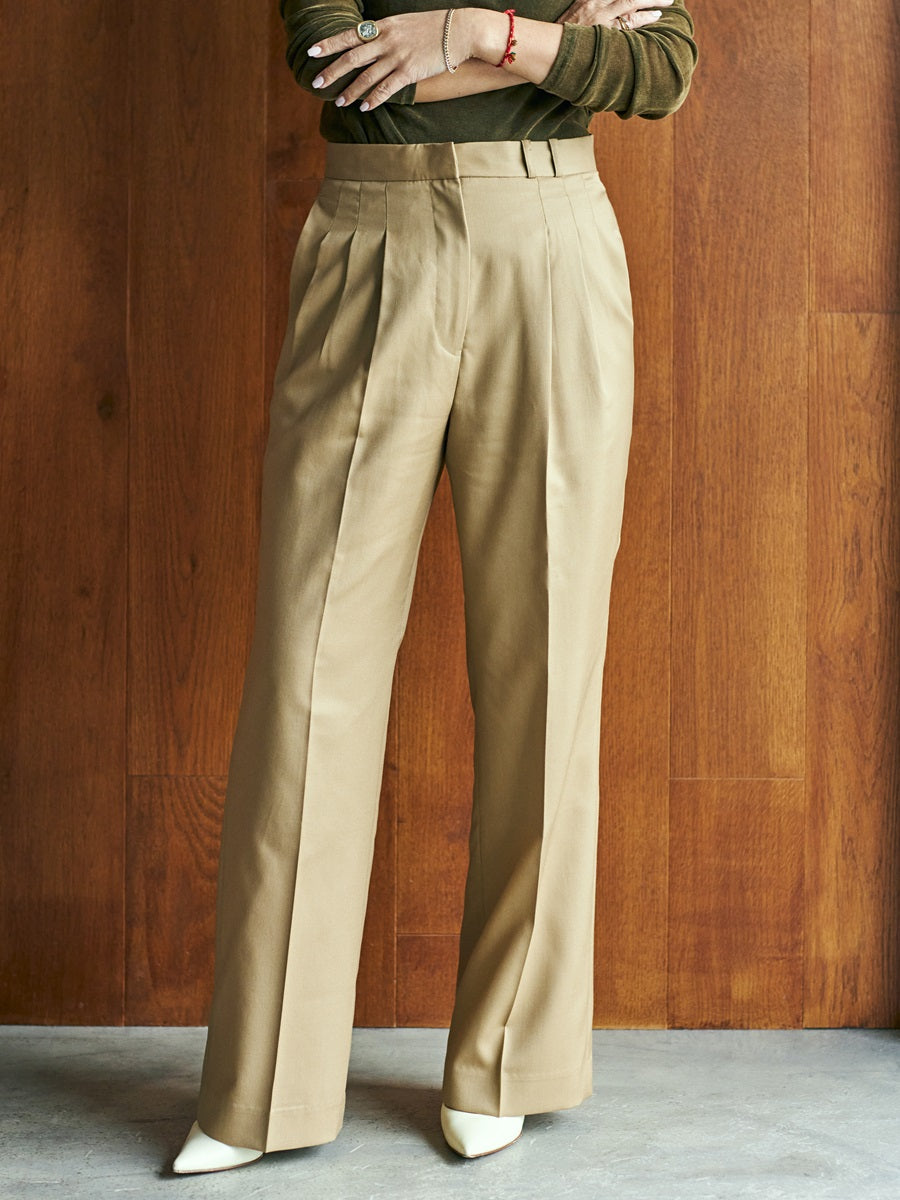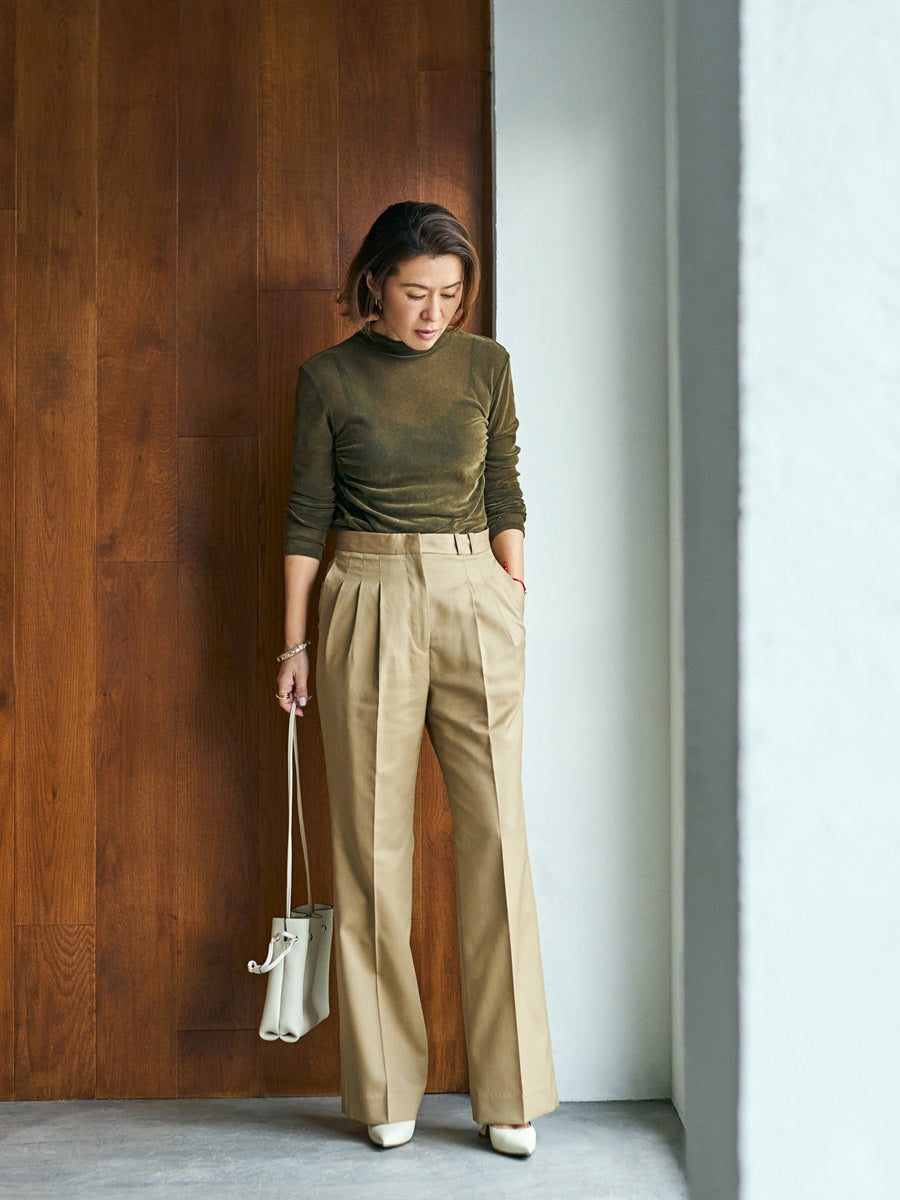 「アースカラーに白系の小物を合わせて、フェミニンムードが漂う着こなしに。ウエストには3本のタックが施されていて、さらに上部が縫われているので、お腹まわりをすっきり見せてくれます。トップスをインするのが苦手、という方でも、このパンツだったらトライしやすいはず!」