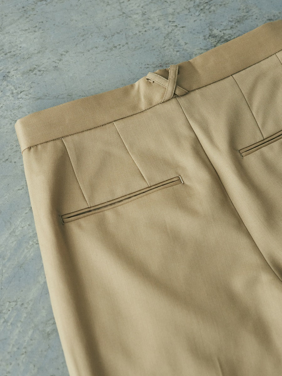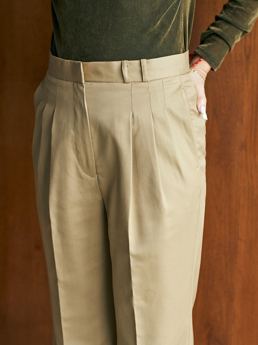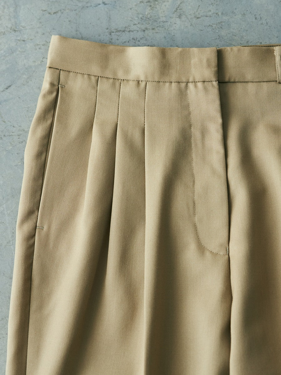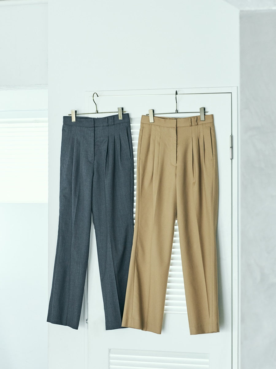 「アースカラーに白系の小物を合わせて、フェミニンムードが漂う着こなしに。ウエストには3本のタックが施されていて、さらに上部が縫われているので、お腹まわりをすっきり見せてくれます。トップスをインするのが苦手、という方でも、このパンツだったらトライしやすいはず!」