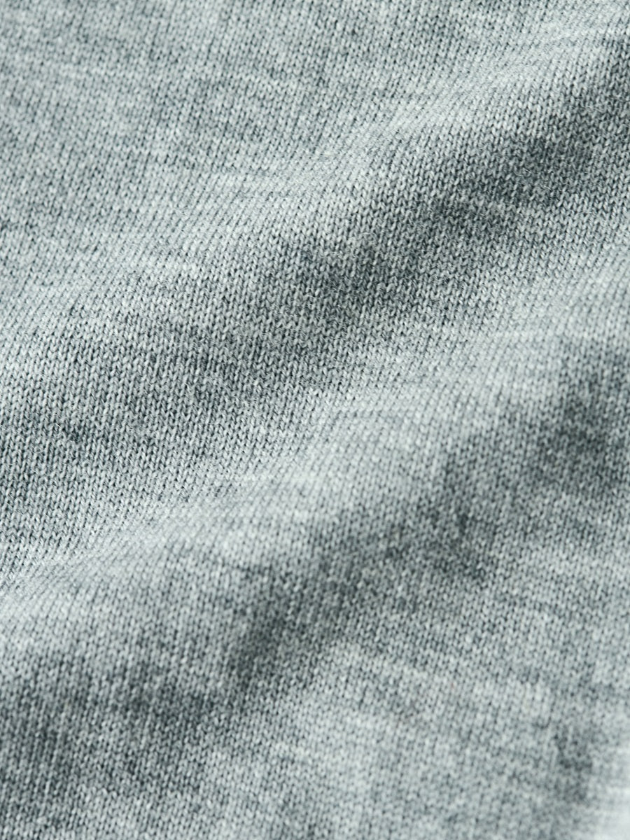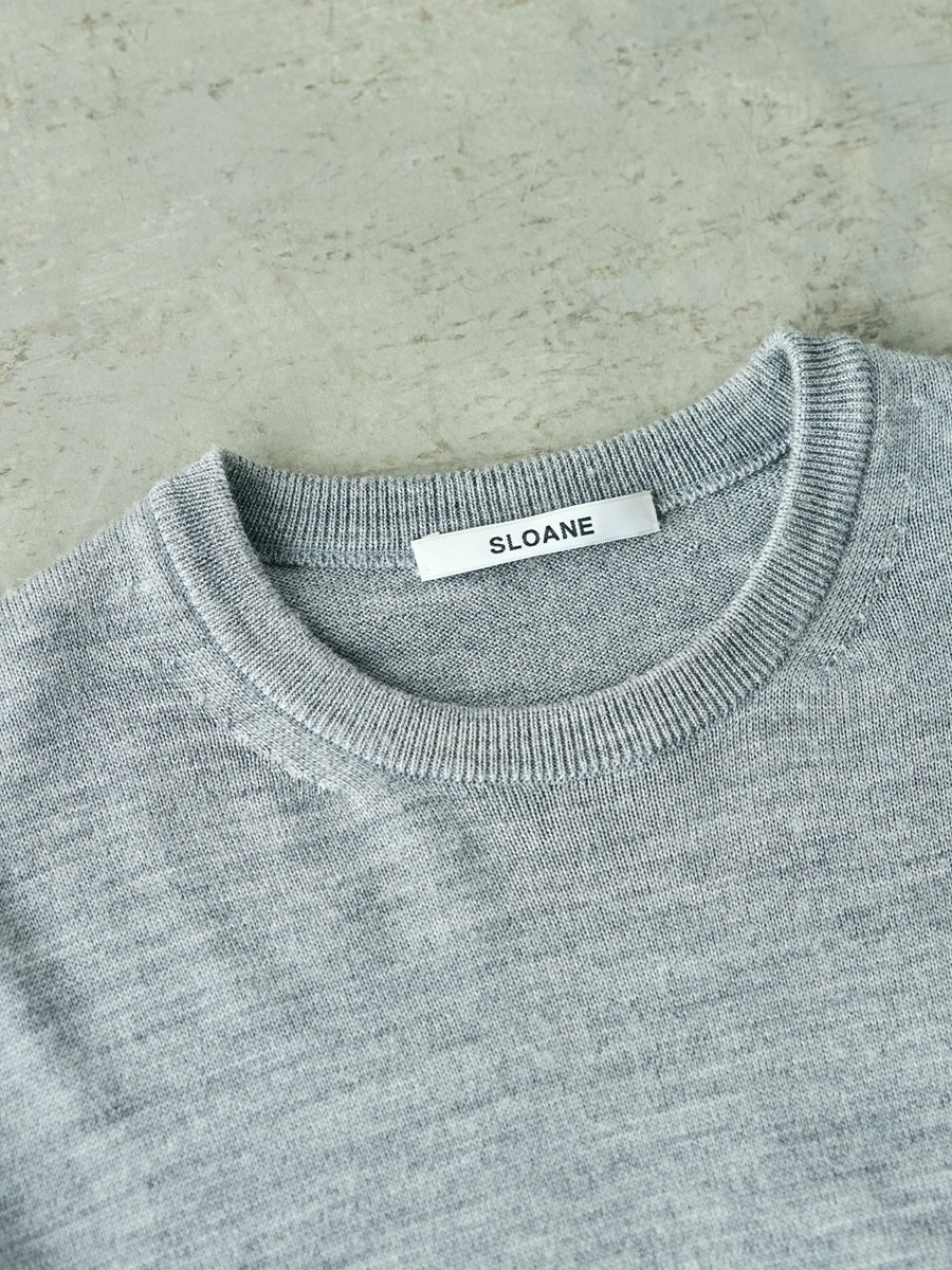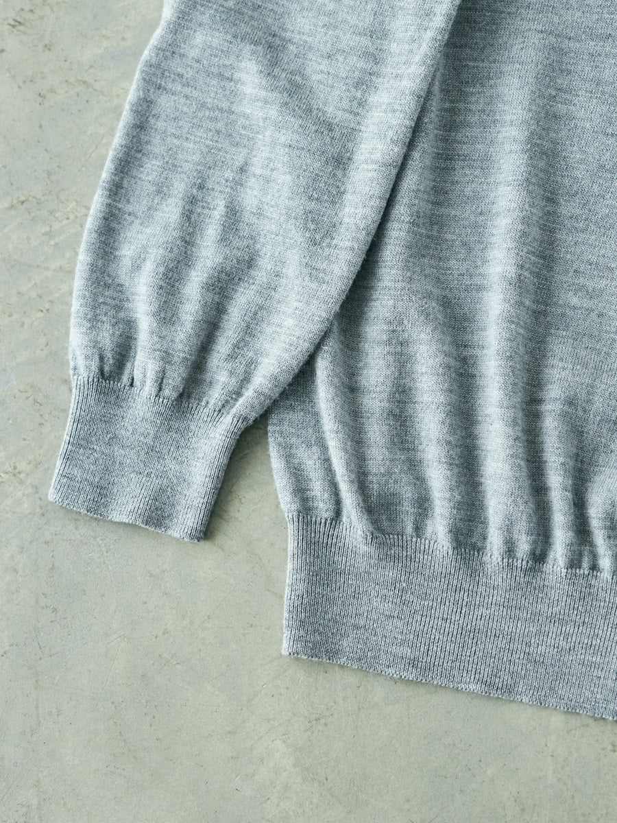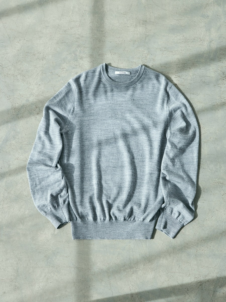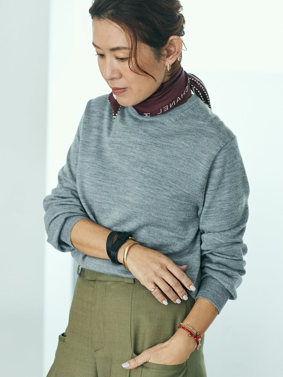 「癖のないグレーのニットが、アースカラーのレイヤードの支えに。肩のフィット感や全体のバランスを追求したスローンのニットだからこそ、スカーフのアレンジもサマになります。袖を通すとそのフィット感や整ったシルエットに感動するはず。“普通”に見えて“普通じゃない”のがSLOANEのプロダクトです」