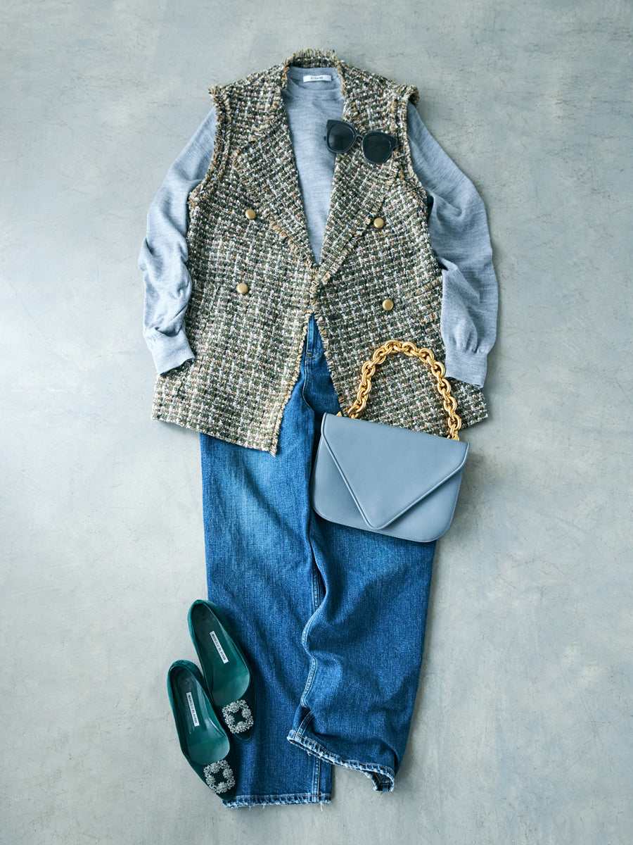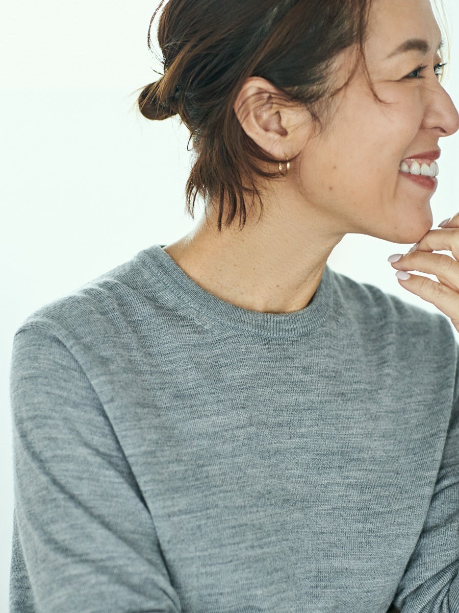 「シンプルなシルエットだから、まるでTシャツのように合わせるアイテムの色や素材で遊ぶことができるのもこのニットの魅力。コンパクトすぎず、大きすぎない絶妙なシルエットは、インナーにTシャツをしのばせてスポーティな雰囲気にしたり、アウターにジレを重ねてきれいめに仕上げたりと、アレンジも自在です」