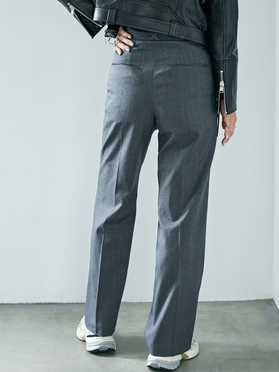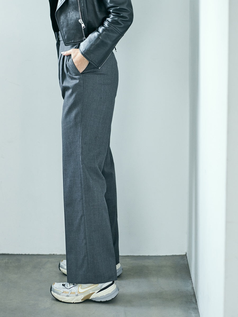 「端正なイメージのあるグレーのパンツを、ライダースとスニーカーで着崩したコーディネート。パンツが正統派だからこそ、マニッシュなライダースジャケットがハードに写りすぎず、バランスよくまとまります。裾に向かって少しフレアになっているシルエットは脚長効果があるので、スニーカーなどのフラットシューズも気兼ねなく合わせて」