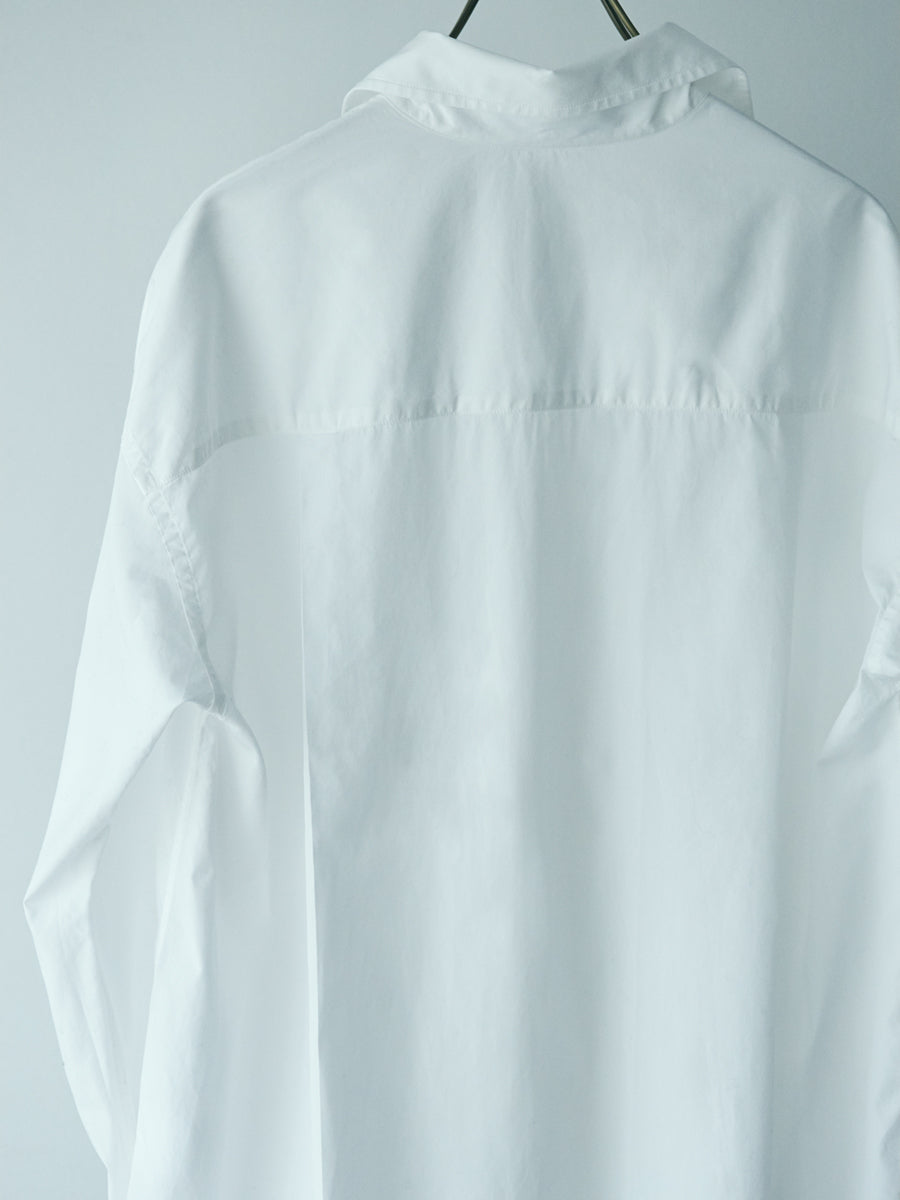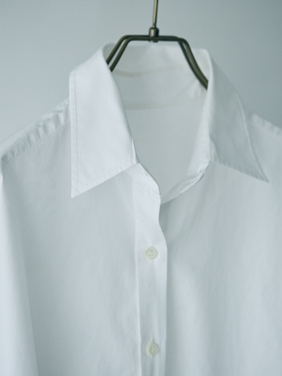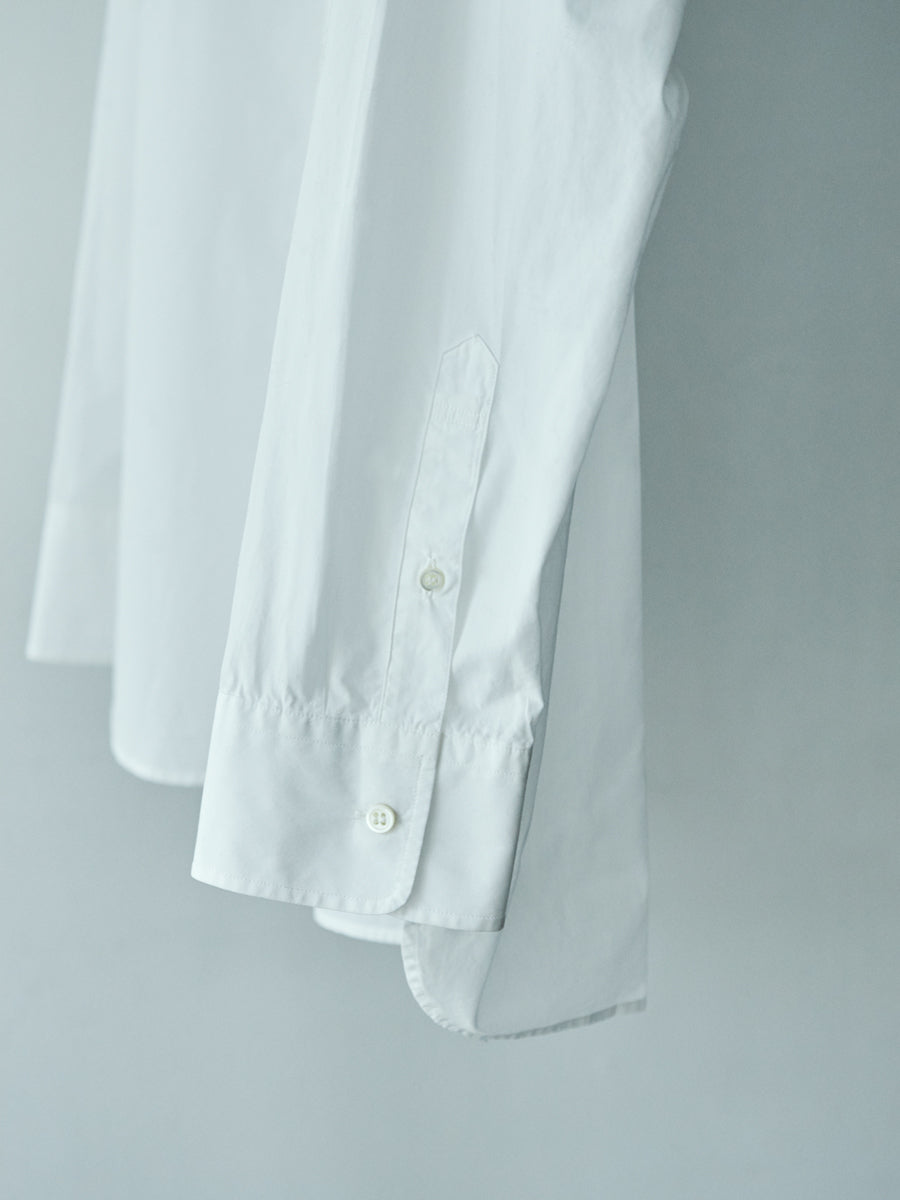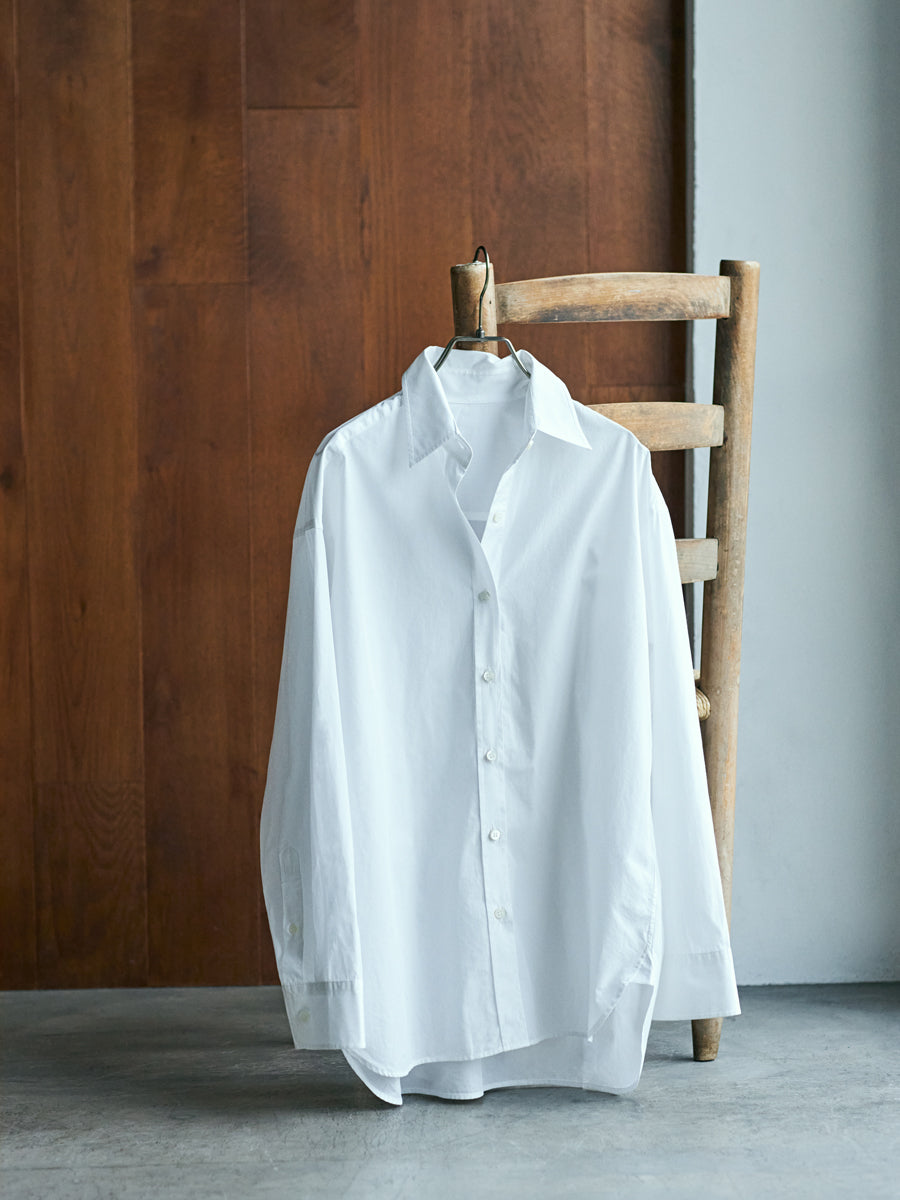 「立体的な襟やカフス、360度どこから見ても美しいシルエットは、シャツ専門工場で、各パーツごとに職人が縫製を行っているから。妥協のない仕立てだからこそ、ビジネスなどのかしこまったシーンでも上品に映えてくれます。今っぽさはありつつも、シーンを限定しないシルエットやディテールは、ありそうでない唯一無二の1枚」