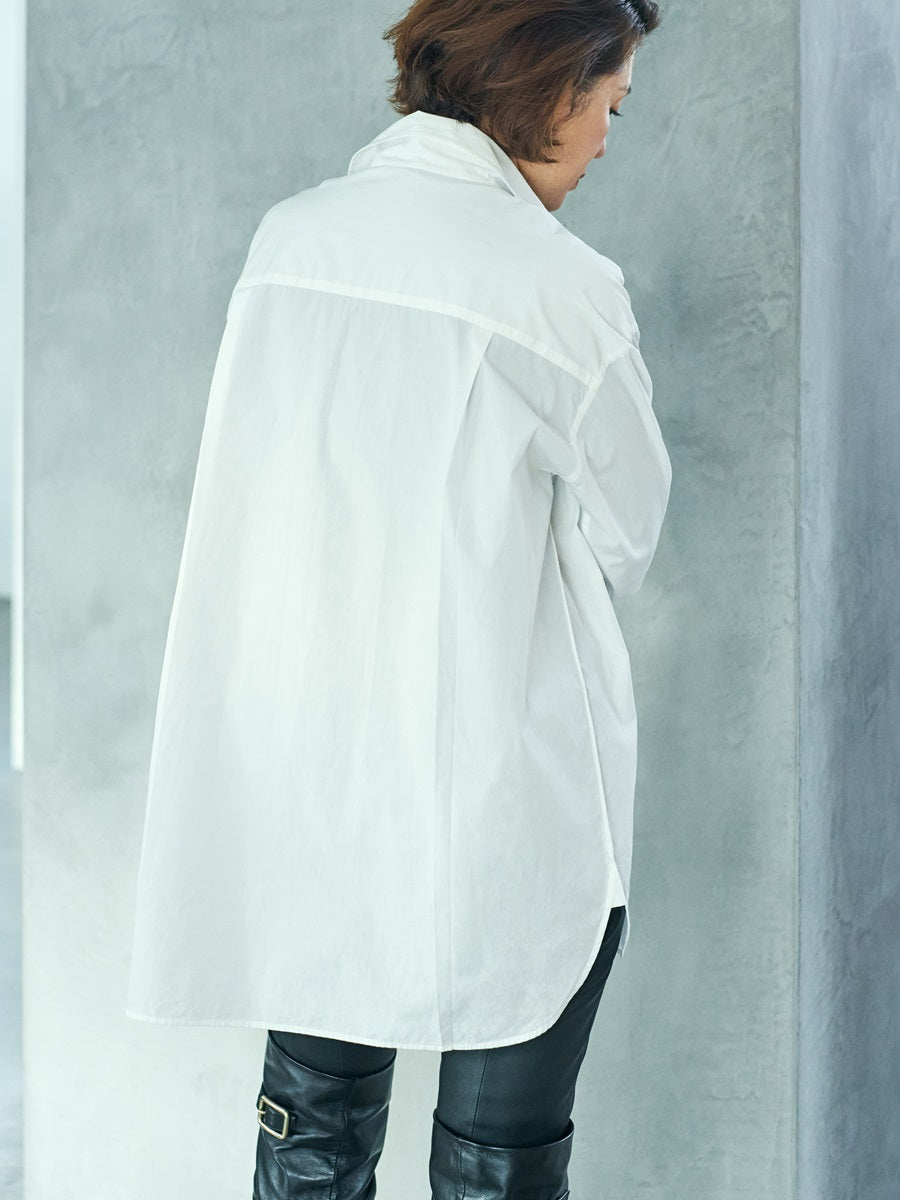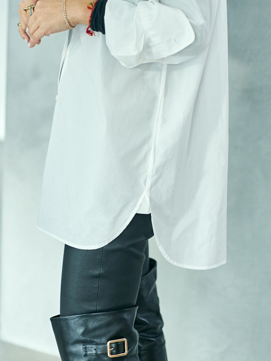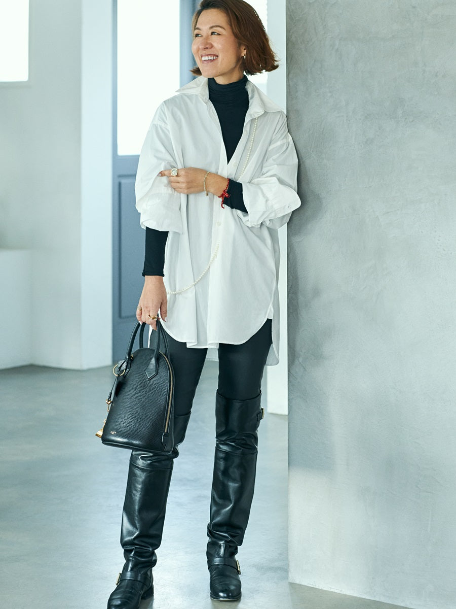「レギンス×ニーハイブーツを合わせて、ベーシックアイテム=シャツの鮮度をアップ。インナーにタートルネックを合わせると、着こなしに立体感が生まれます。着丈がしっかりとありヒップラインを隠してくれるので、体型カバーの効果も。寒さを感じる季節はジレやコートを重ねて」