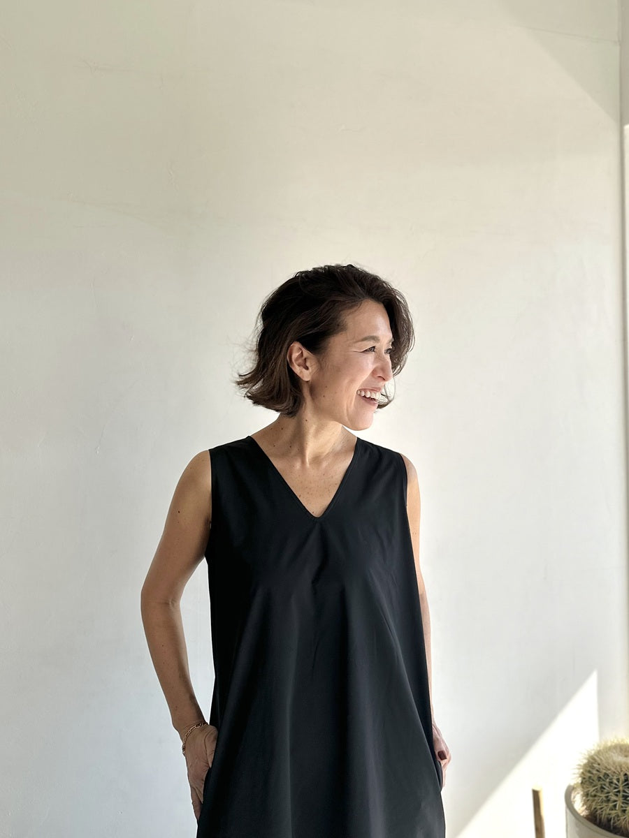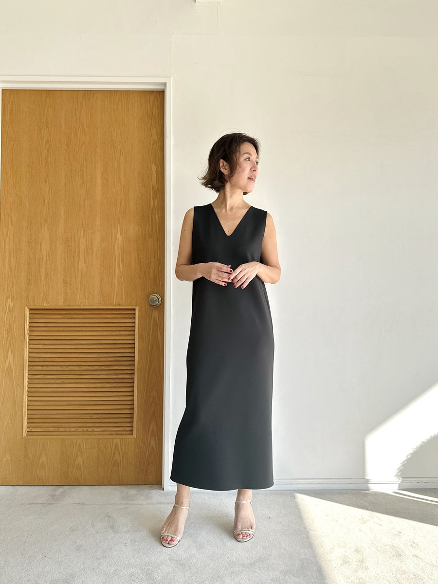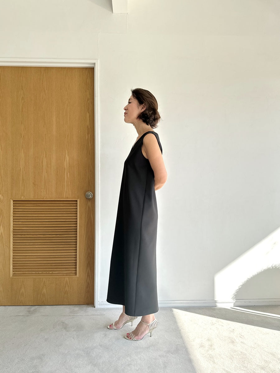 ネックラインは深く狭いVネックに設定することにより、デコルテや首筋、顔をシャープに見せてくれます。下着のストラップを気にしなくていい肩の部分の幅や、気になる二の腕――特に後ろがわをきれいに隠してくれる、アームホールのラインも吟味。