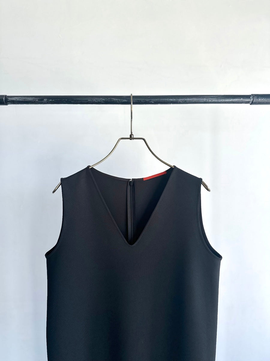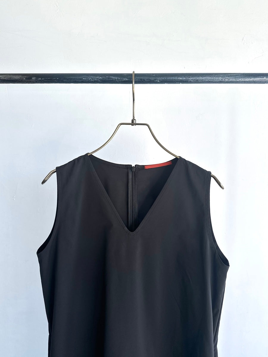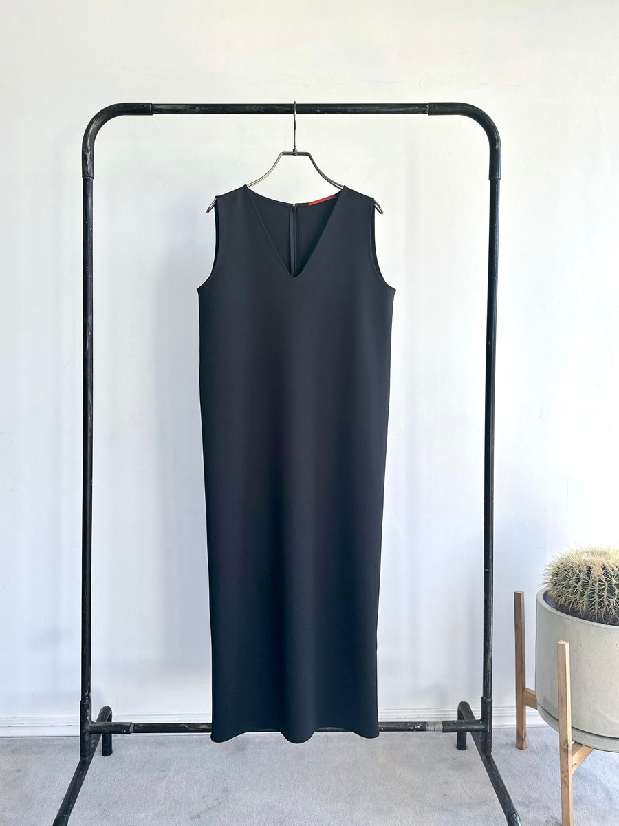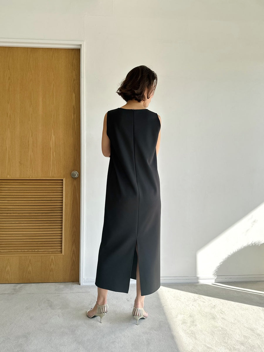 ネックラインは深く狭いVネックに設定することにより、デコルテや首筋、顔をシャープに見せてくれます。下着のストラップを気にしなくていい肩の部分の幅や、気になる二の腕――特に後ろがわをきれいに隠してくれる、アームホールのラインも吟味。