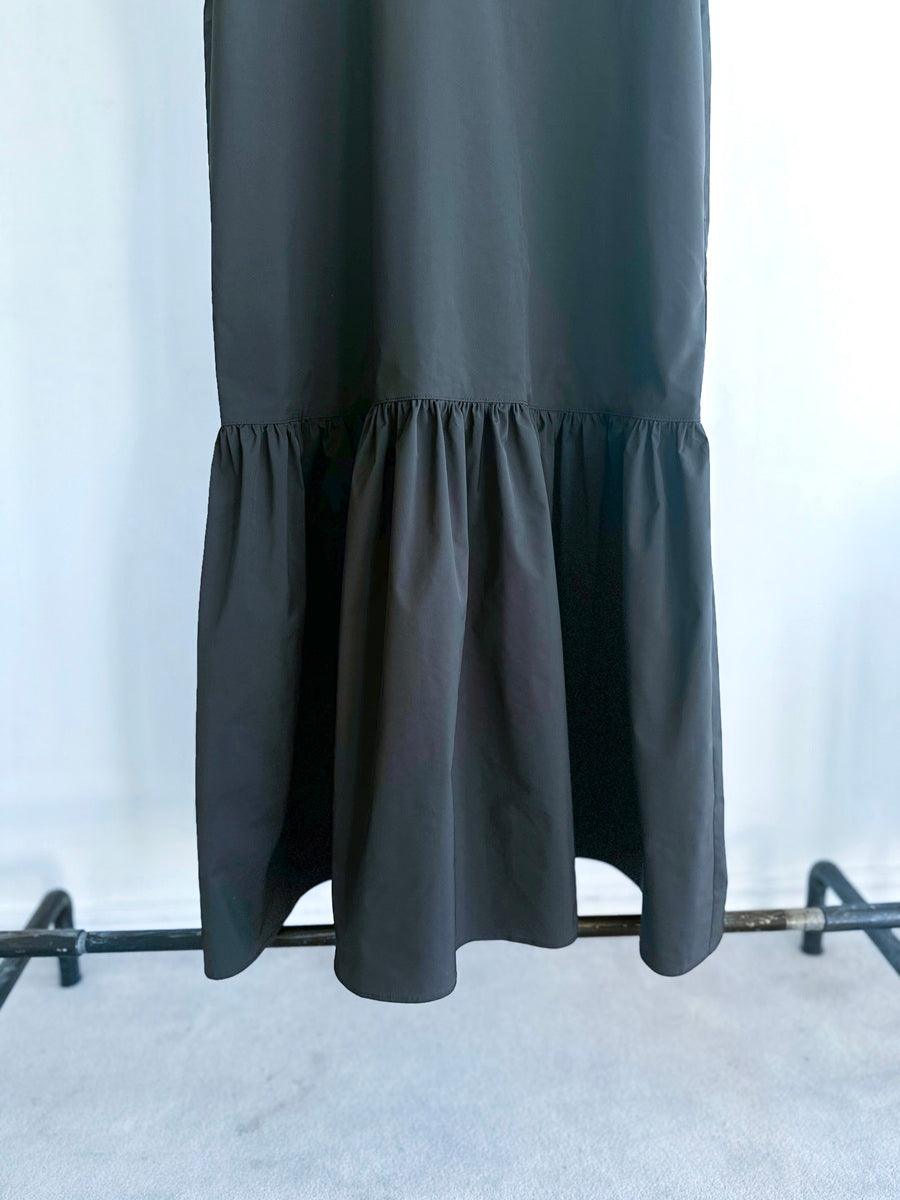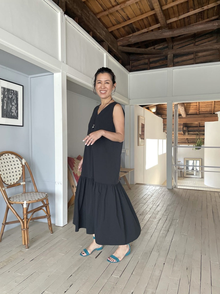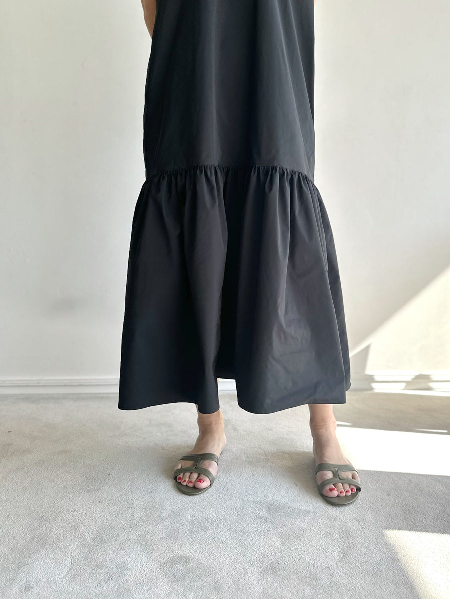 素材は「身体に張りつかず」「シワになりにくく」、「着ていて心地いい」を追求。ほのかな光沢があるので、カジュアルになりすぎないための「上品さ」も添えてくれます。今回は、以前お届けしたものよりも、少しだけハリがあるものにアップデート。ストレートなラインとティアードの部分のメリハリがより際立ちます。