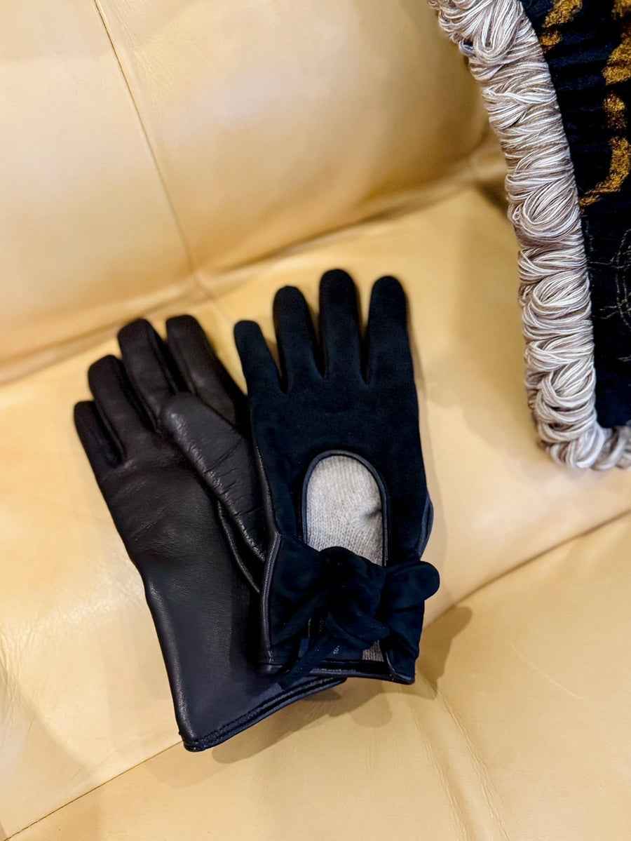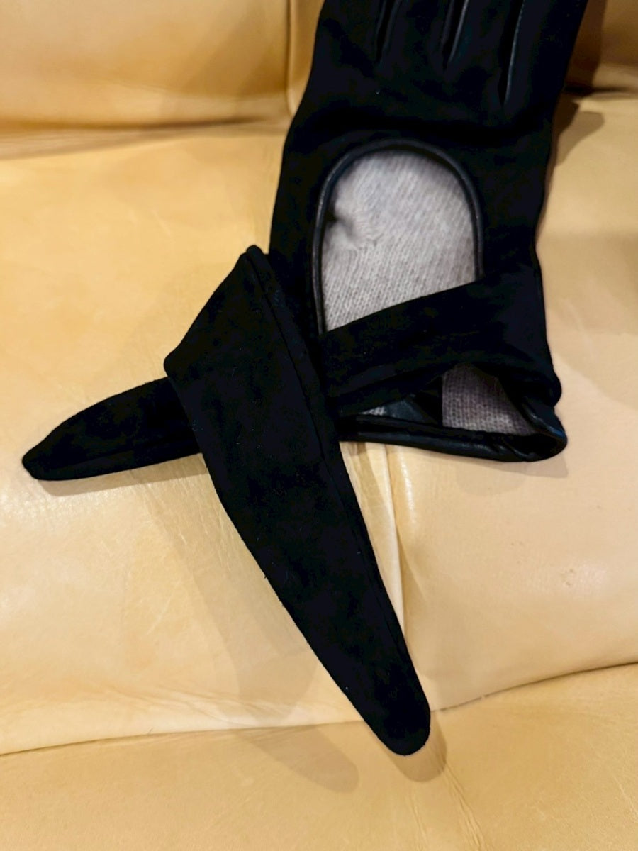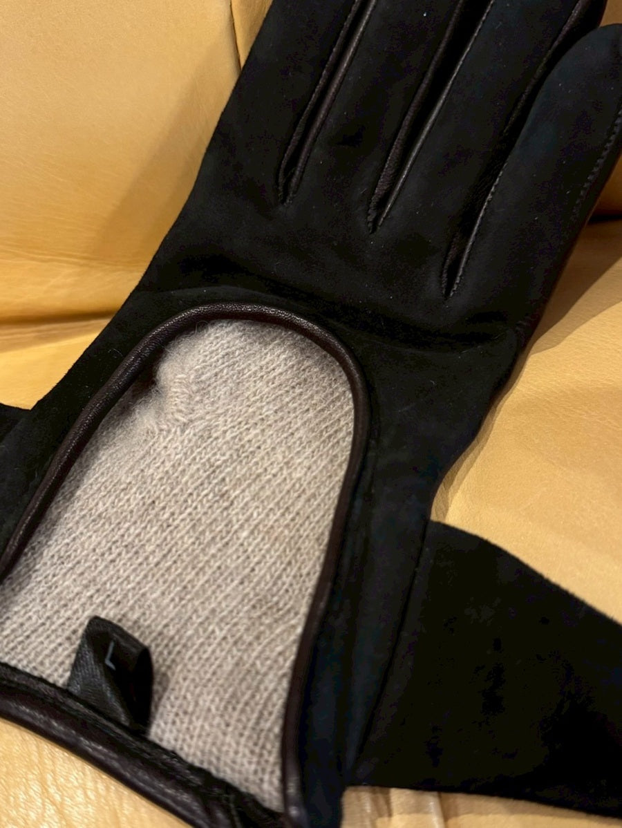 表地はイタリア製のラムスキン。手の甲側はスウェード、手の平側は表革で、非常に柔らかく、手を通したそばから優しくなじみます。ライナーはカシミヤ100%をチョイス。凍えがちな冬の手元を温かく包み込み、所作までエレガントに見せてくれます。