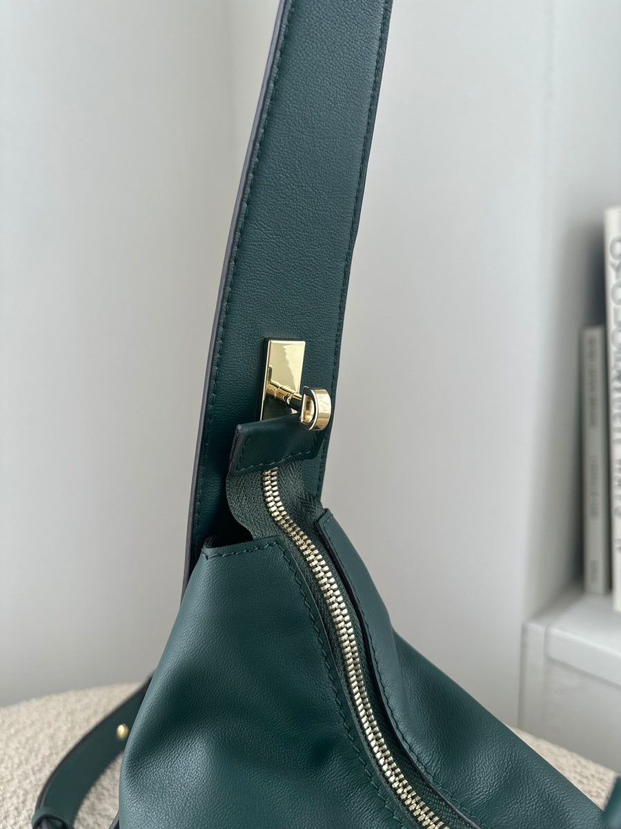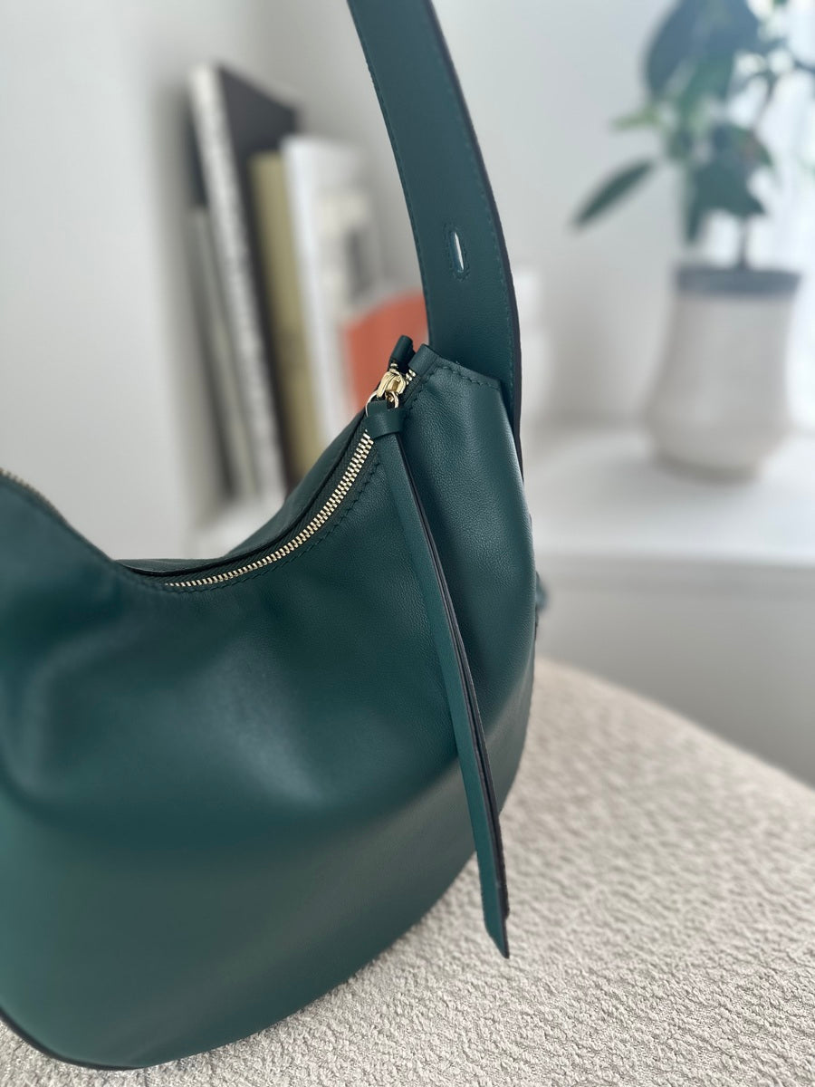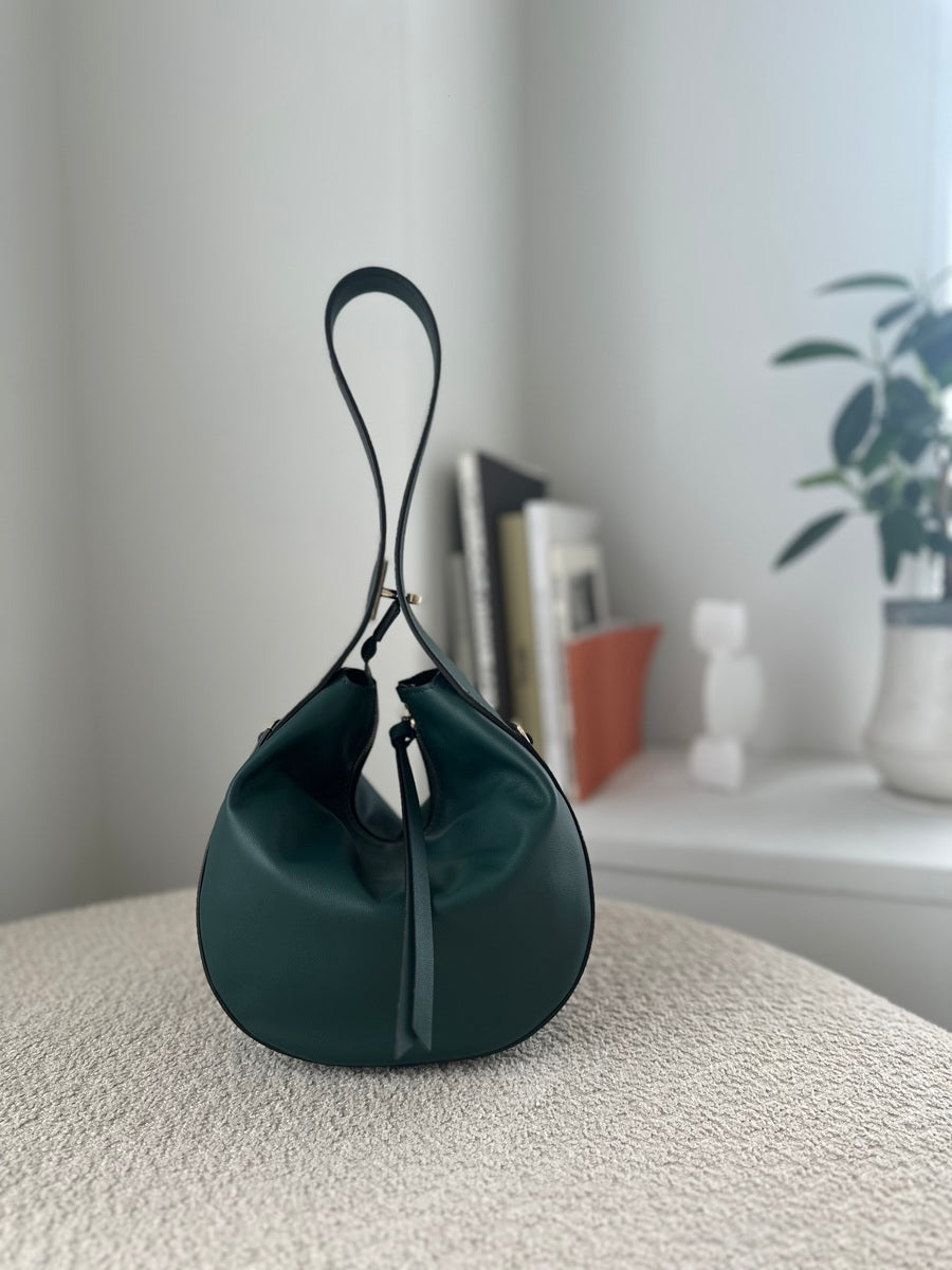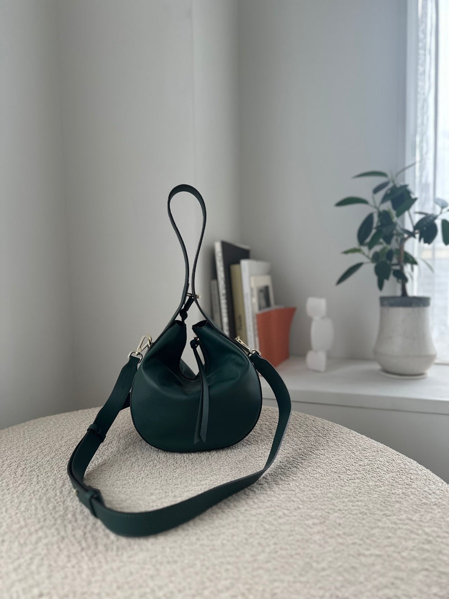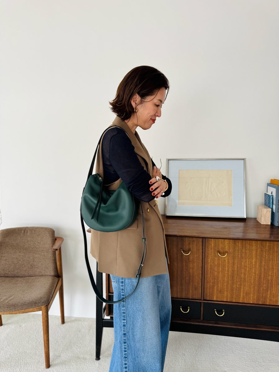 バッグのデザインは、肩掛けできるクロワッサン型をベースに、ショルダー部分にある金具を留めることでワンハンドルのハンドバッグにしたり、付属のショルダーストラップをつけることで斜めがけも可能だったりと、変幻自在の3WAY。しなやかで上質なレザーが織りなす、くったりと柔らかく丸みを帯びたフォルムも魅力。
