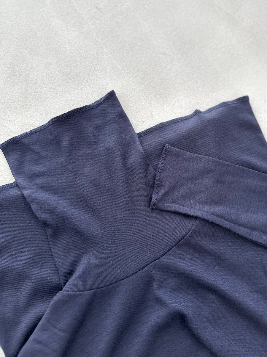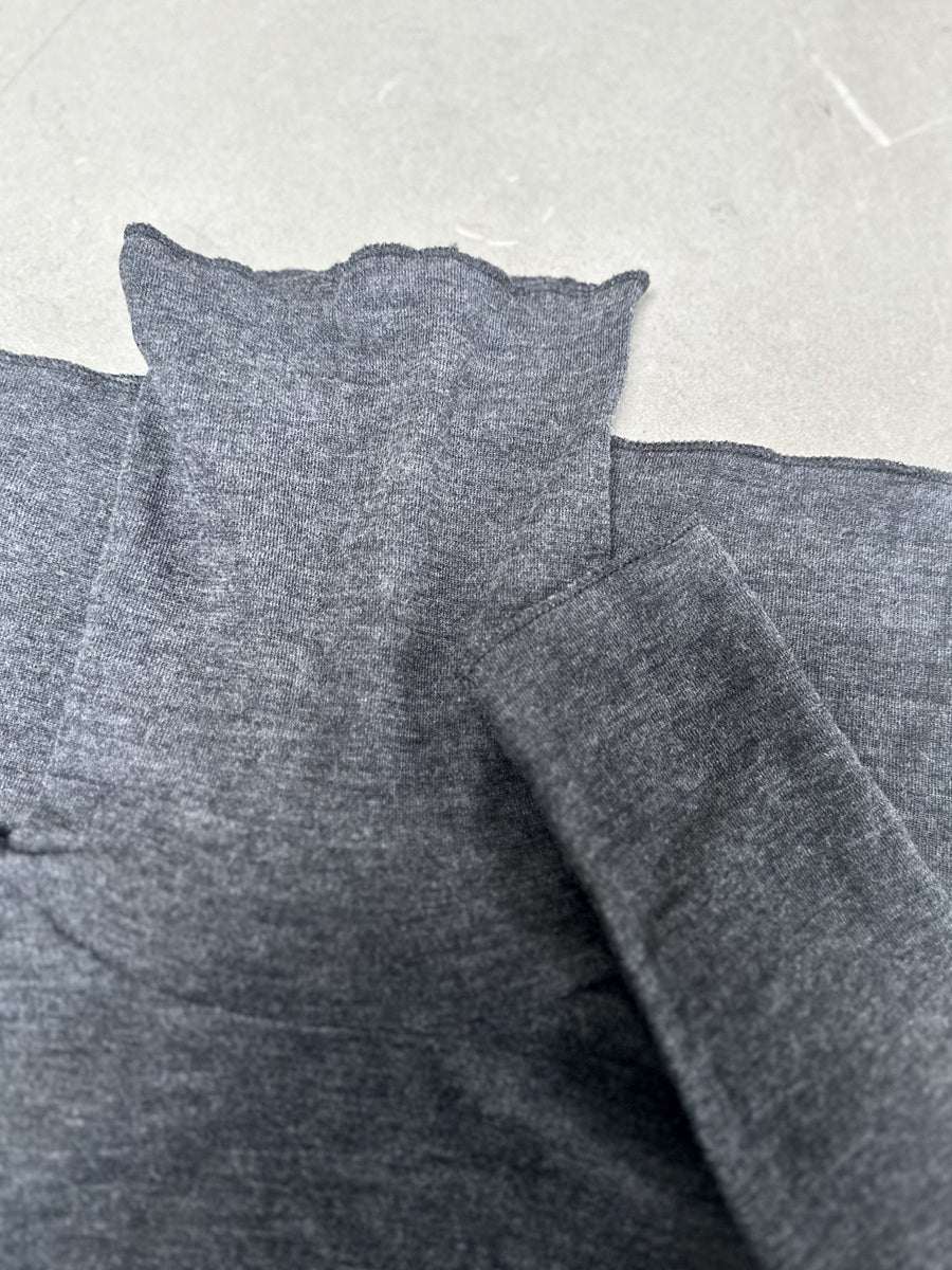 生地は、ほっこり感が出ないようにさらっとしたフライスを使用。そして大人の女性でも抵抗なく着られる、ほどよい透け感にこだわりました。その透け感を細部まで維持できるよう、布端は織り込むのではなく、メロー仕上げ(ミシンを使って布端を処理すること)にしています。