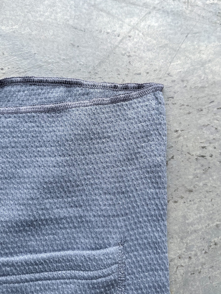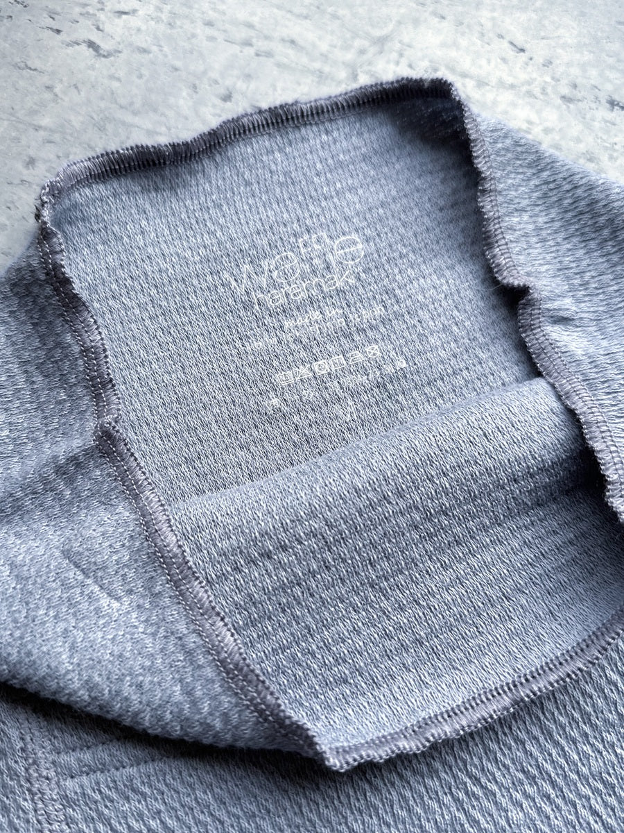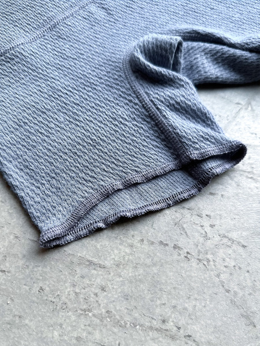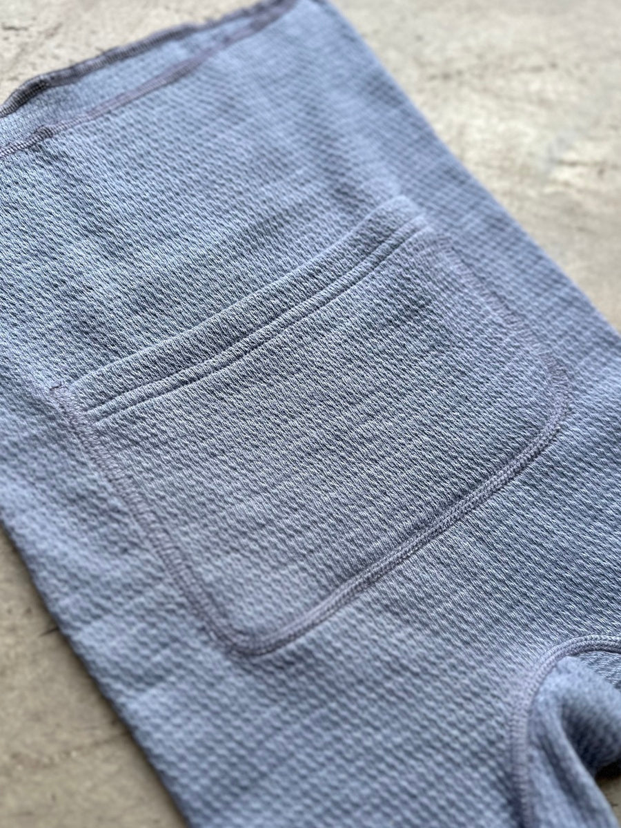 「スフレワッフル」は、waffle haramakiを代表する素材の1つ。スイーツのスフレのように、空気をたっぷりと含んだふわふわのワッフル生地は、日本に数台しかない貴重な編み機でゆっくりと編み上げられています。表面が凸凹とした立体感のある構造で、保温性が高く通気性も抜群。素肌への摩擦が少なく、優しい肌あたりです。