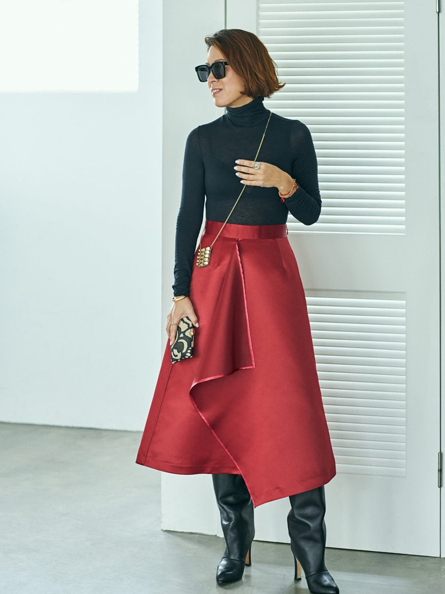 花びらのように揺れるデコラティブなディテールが目を惹く、サテンのスカート。厚地のサテンを使うことで、ハリのあるシルエットを実現。ウエストは内側で2段階のサイズ調整を可能にし、幅広いサイズの方にお召しいただけるように工夫しました。ジャケットや優美なブラウスと合わせればドレスアップのシーンに。カジュアルダウンするときは、タンクトップやTシャツなど、相反する表情のものを選んで。