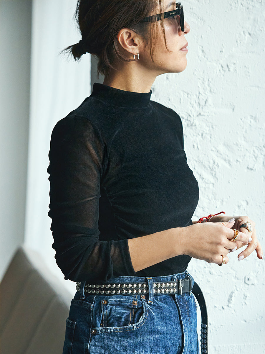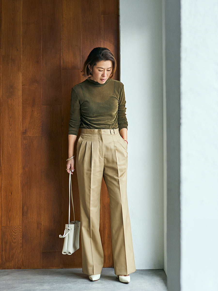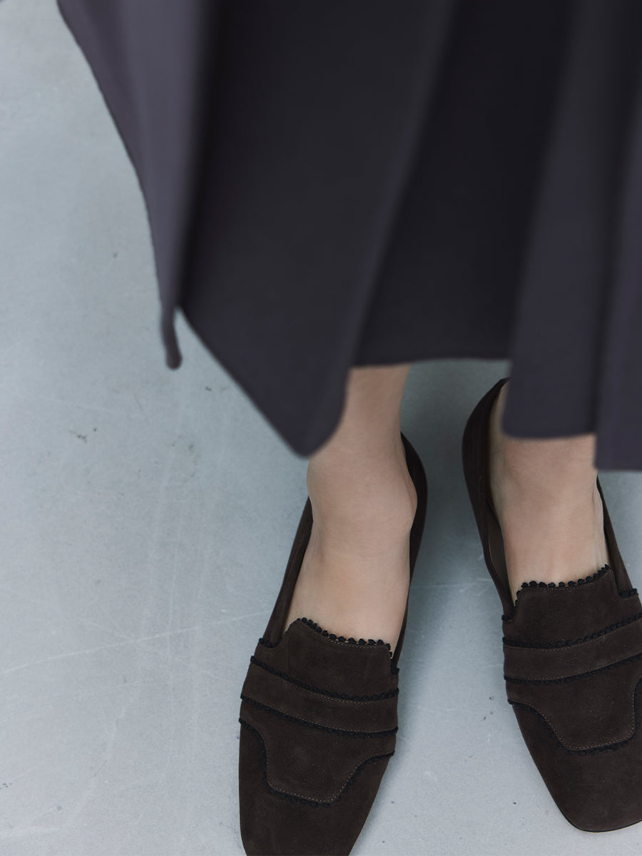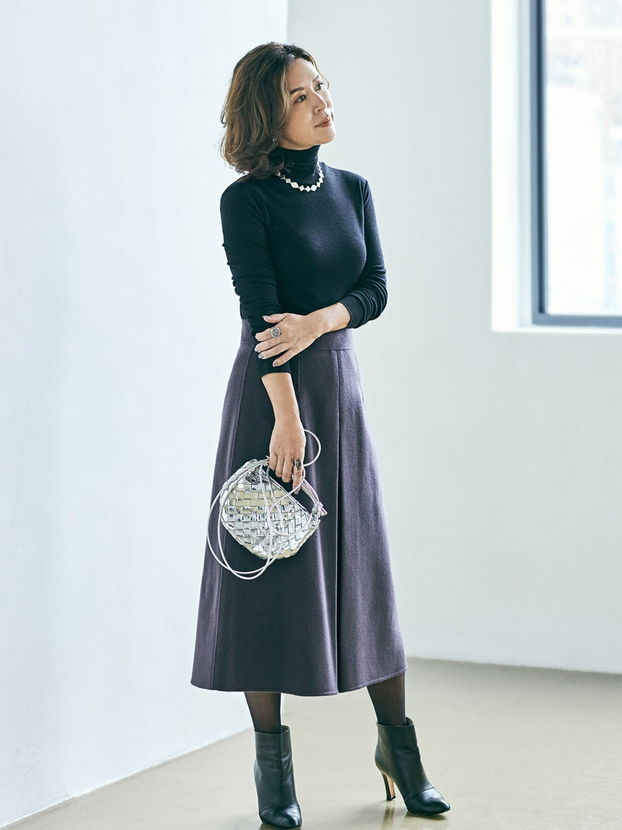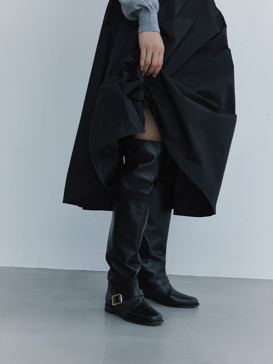 これまで、あらゆるニーハイブーツを試したけれど、これ! というものが見つからなかった大草。そこで、イタリアのシューズブランド「FABIO RUSCONI(ファビオ ルスコーニ)」にお願いし、理想の一足を作りました。足入れが楽で、歩きやすく、脚が細く見えて、大人の服にも似合うデザイン。さらに少しトラッドな要素を……など様々なリクエストを出し、AMARCオリジナルで木型から制作しています。