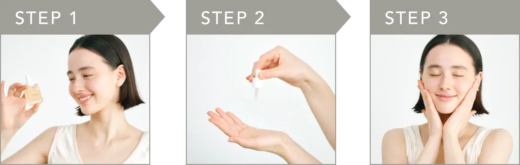 ボトルを5~7回振ります 手のひらにオイルを滴らし、温めます 顔全体にオイルをやさしくのせます