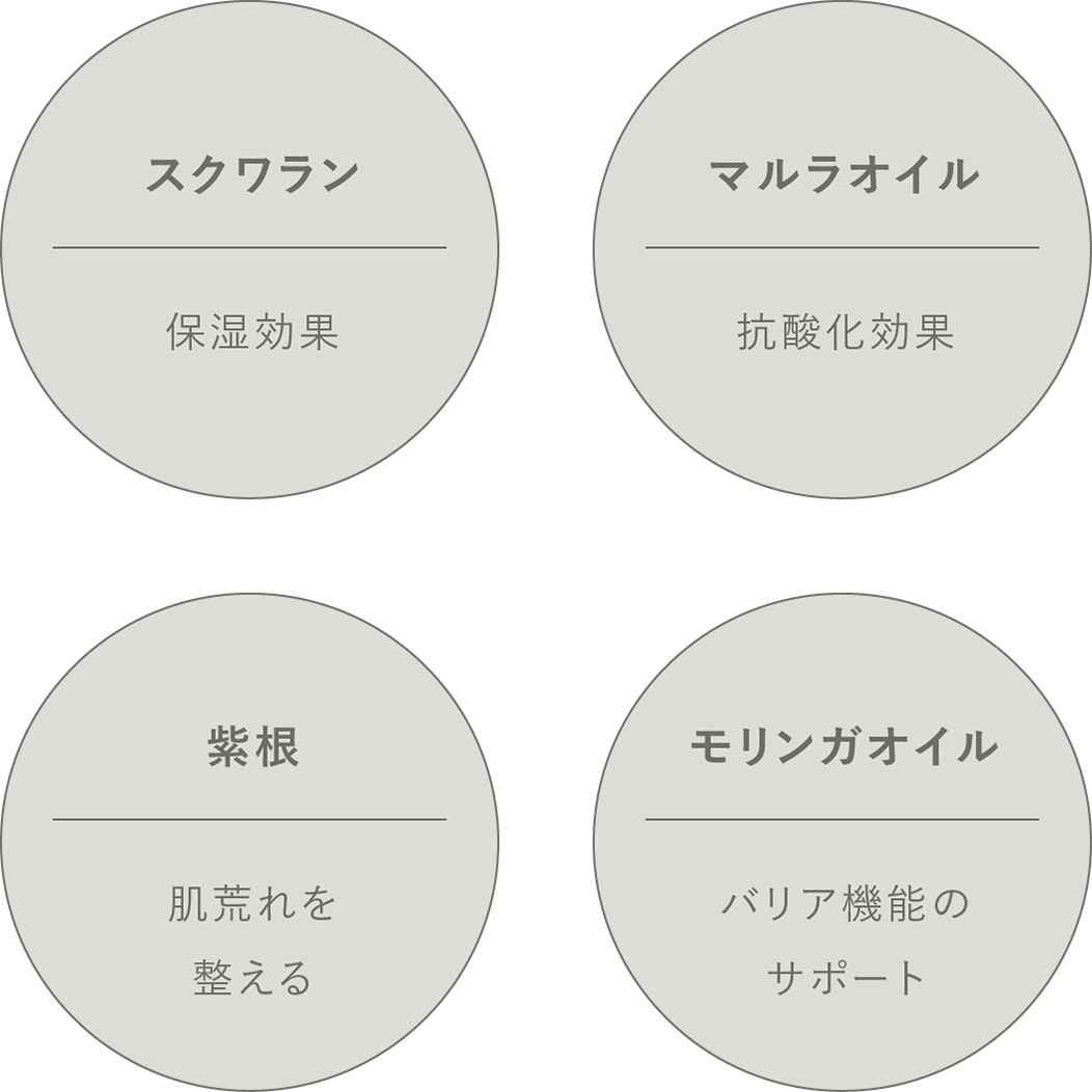 エアコンによる温度変化やチリやほこり、花粉、紫外線など、日中の肌はさまざまな刺激にさらされた状態です。そんな肌をケアしながら守るための成分を配合。抗酸化作用に優れたマルラオイルやモリンガオイルをベースに、保湿効果の高いスクワランや抗菌効果があるとされる紫根由来の成分を配合し、ケアと保護という双方向の効果が期待できるオイルに仕上げました。